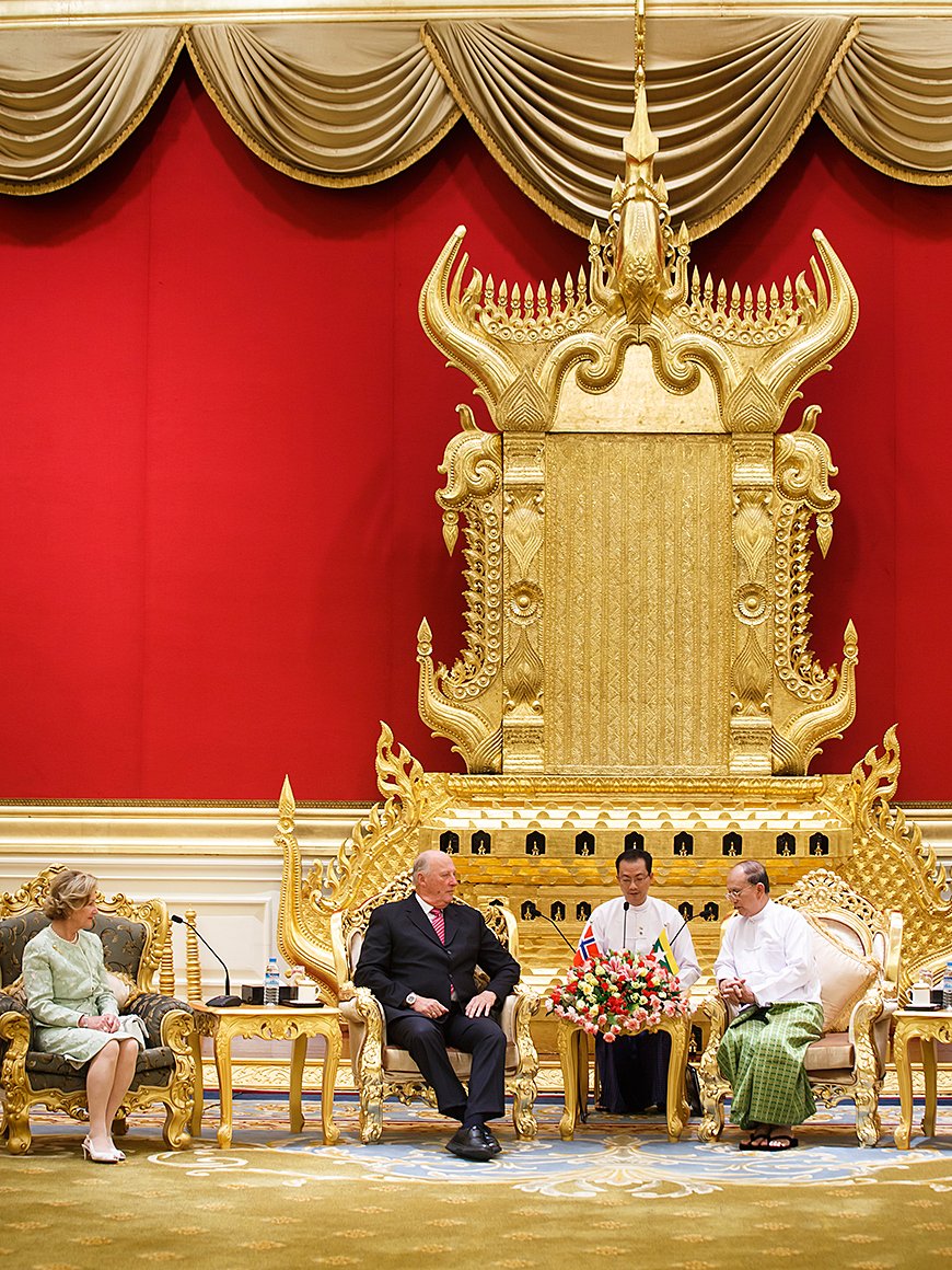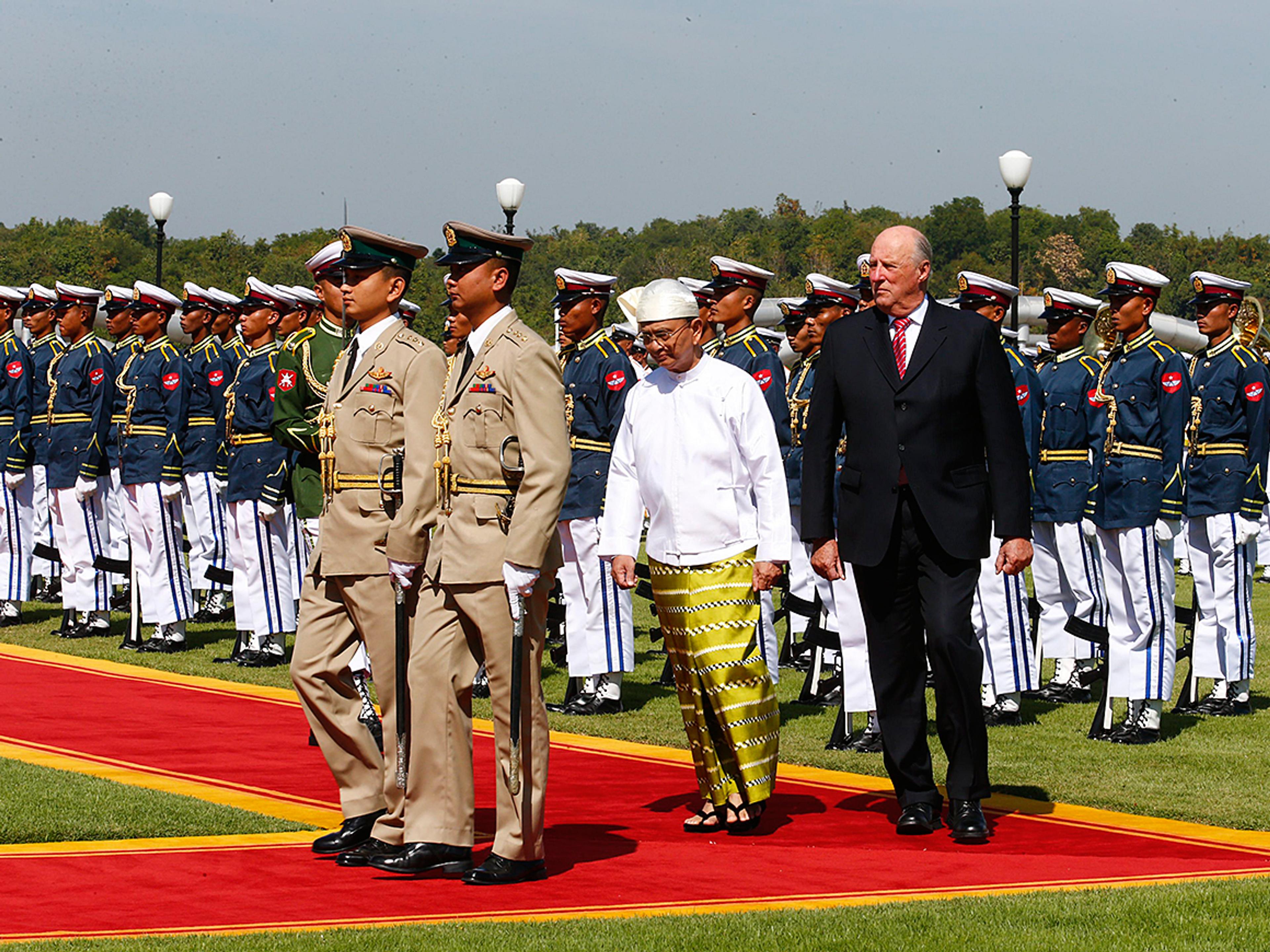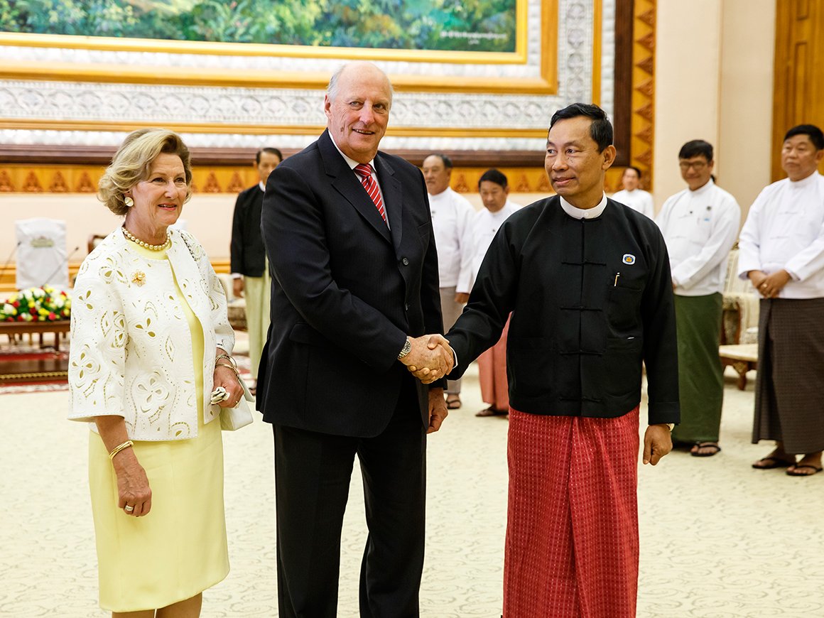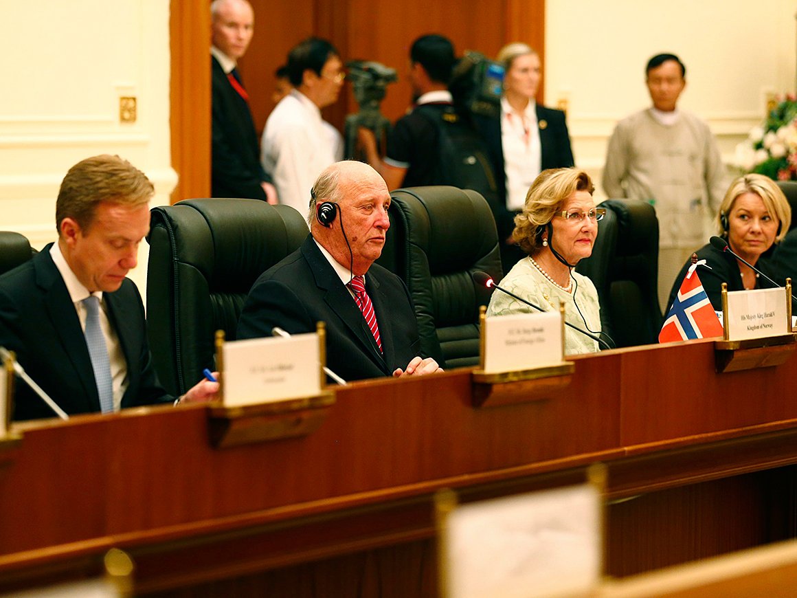 Kongeparet innledet statsbesøk til Myanmar, 1. desember 2014. Norsk støtte til den pågående demokratiseringsprosessen var hovedformålet med det fem dager lange besøket.
