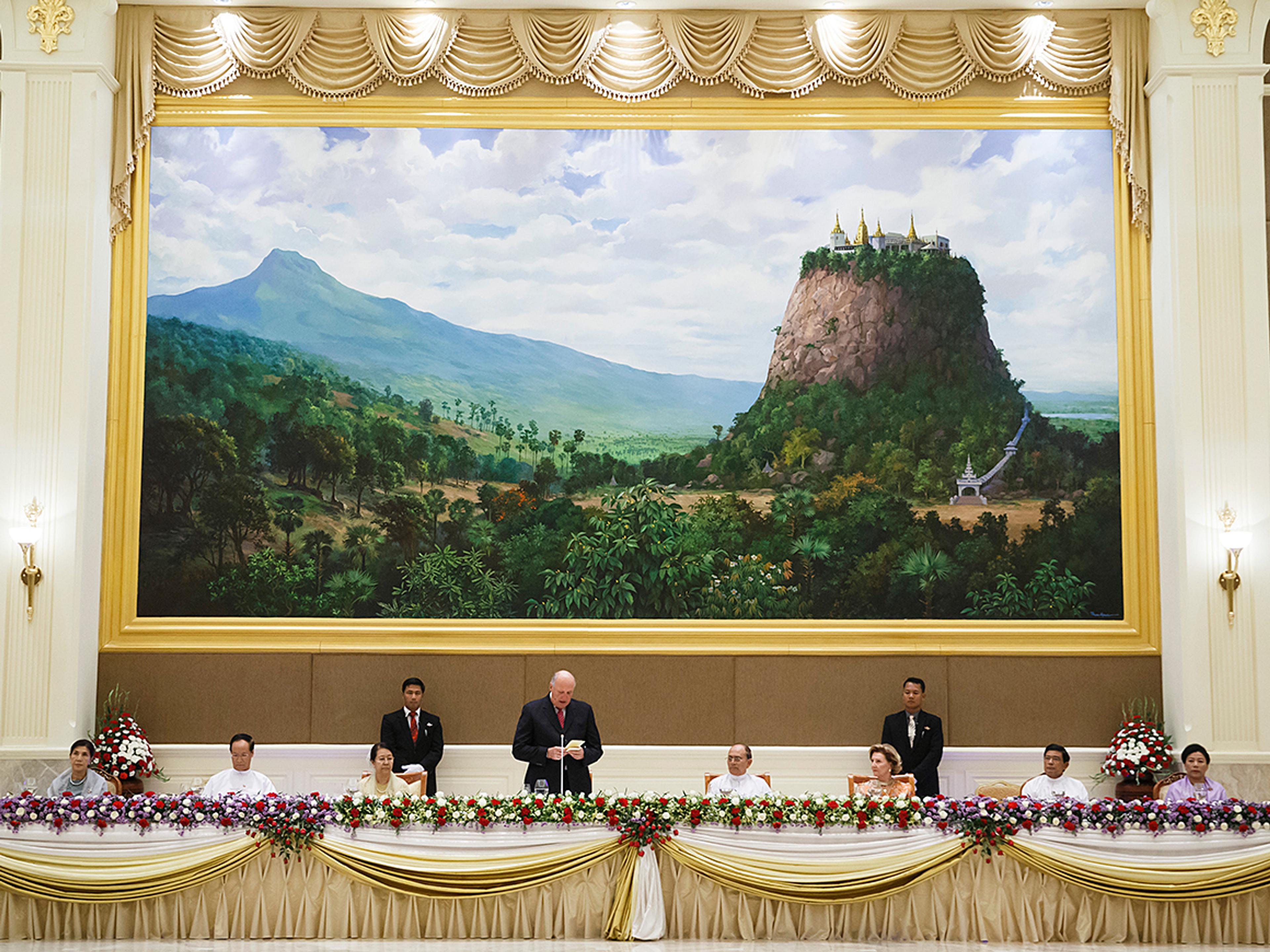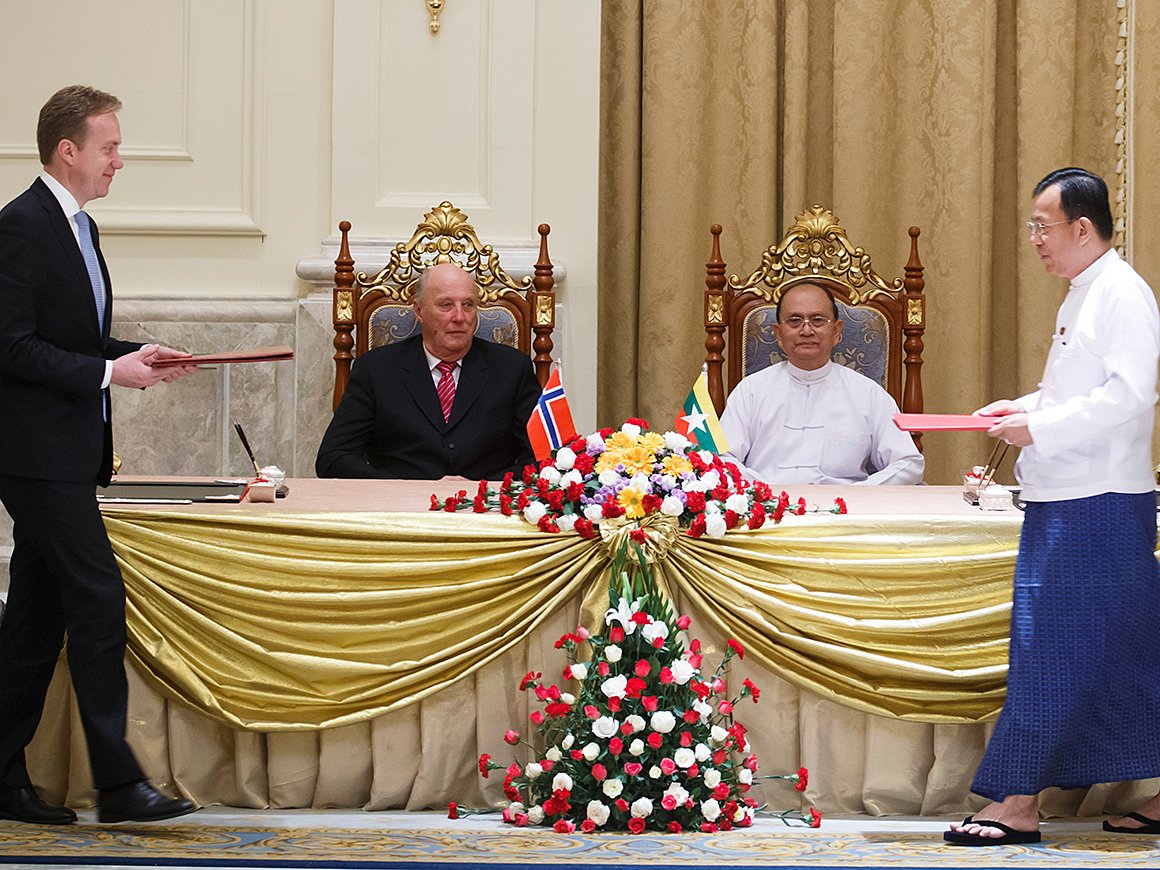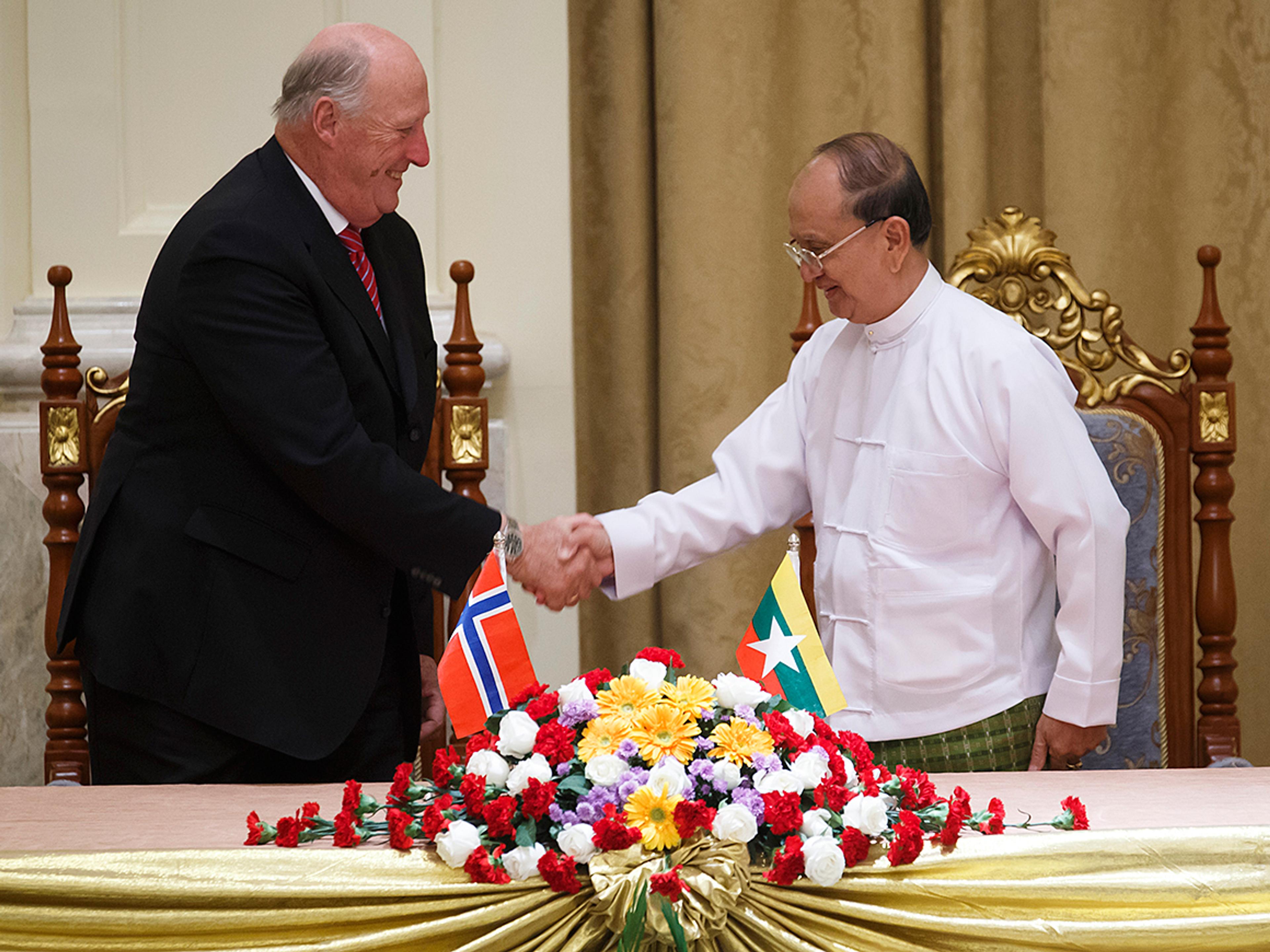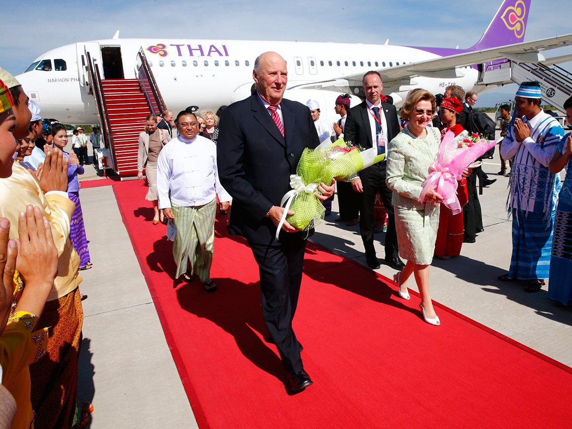 Kongeparet innledet statsbesøk til Myanmar, 1. desember 2014. Norsk støtte til den pågående demokratiseringsprosessen var hovedformålet med det fem dager lange besøket.