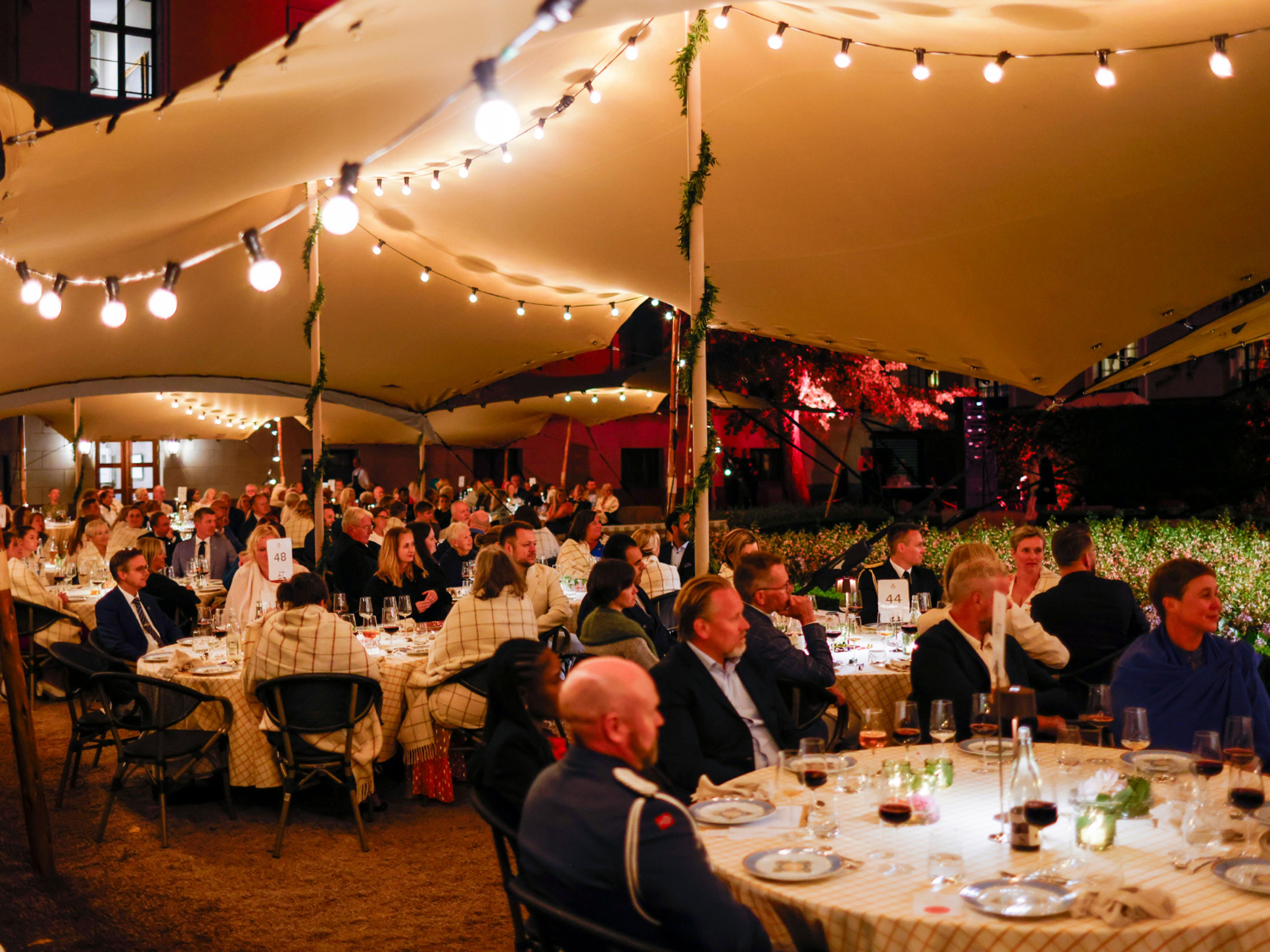 I Slottsgården var det dekket 48 bord under telttak, til vern mot regnet. Store mengder blomster, levende planter og trær pyntet opp omkring bordene.