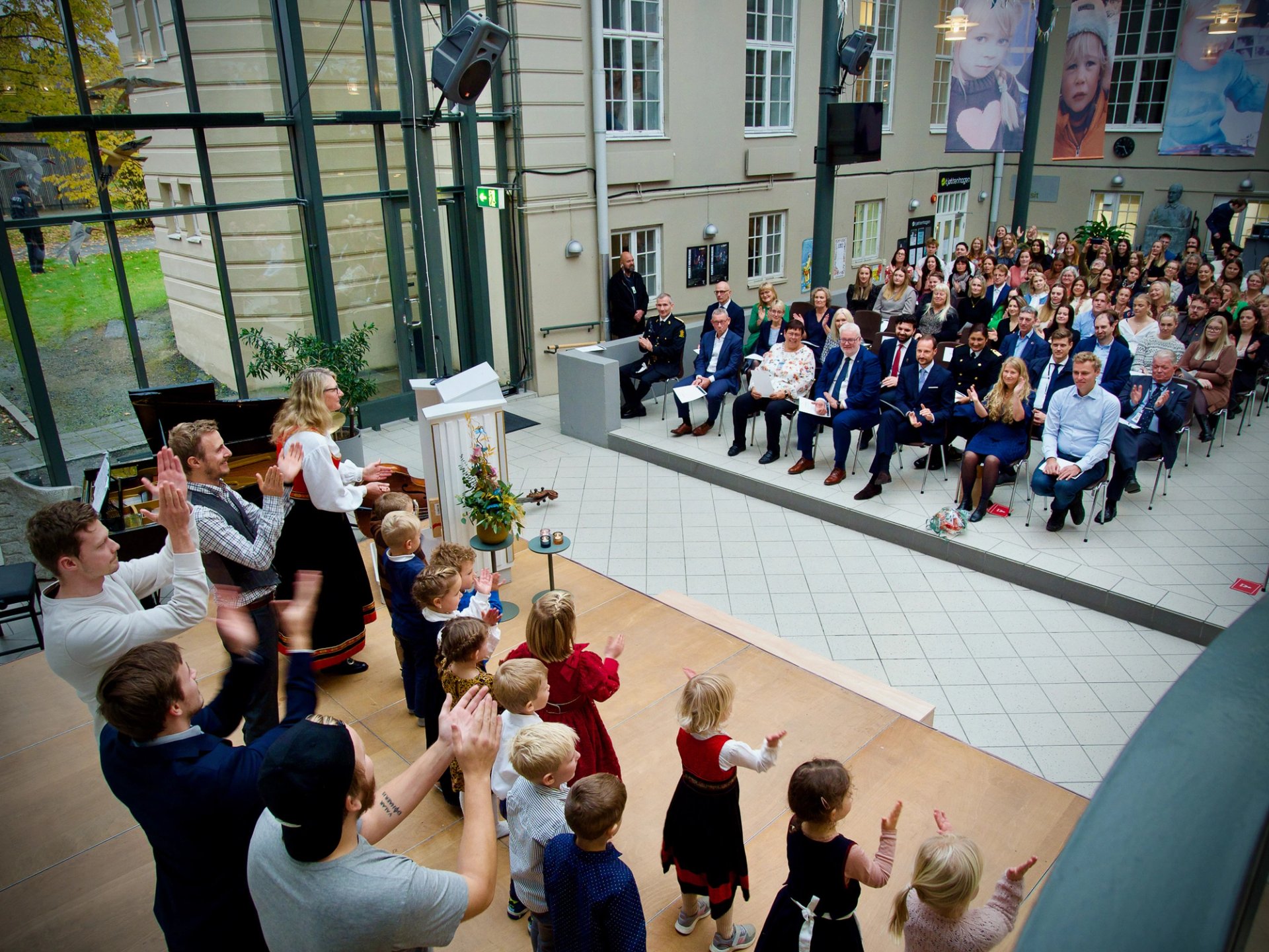 Arrangementets store høydepunkt var fremførelsen av jubileumssangen, og både høgskolens studenter og barn fra DMMH-barnehage sang og danset for gjestene.
