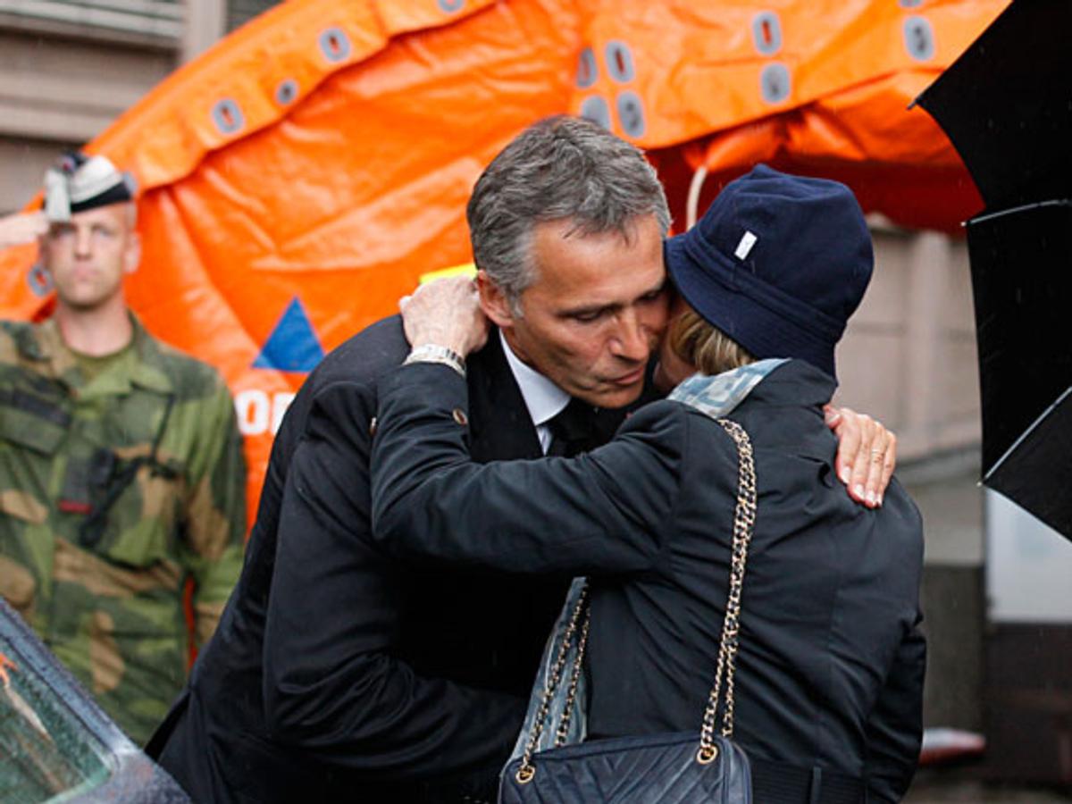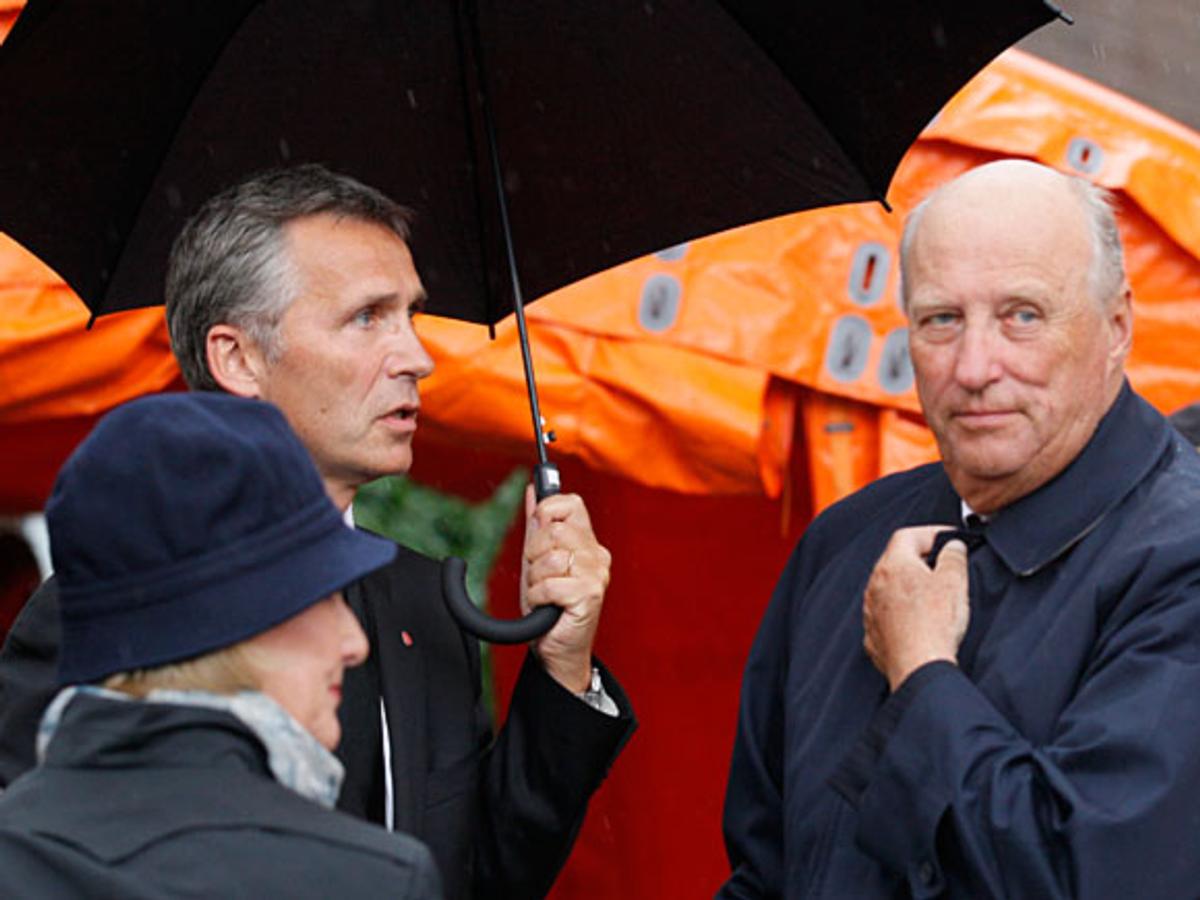Kongen og Dronningen fikk se de store ødeleggelsene i Regjeringsbygget, der så godt som alle kontorene er ødelagt. Syv personer døde i eksplosjonen fredag, og det pågår stadig leting etter flere savnede.