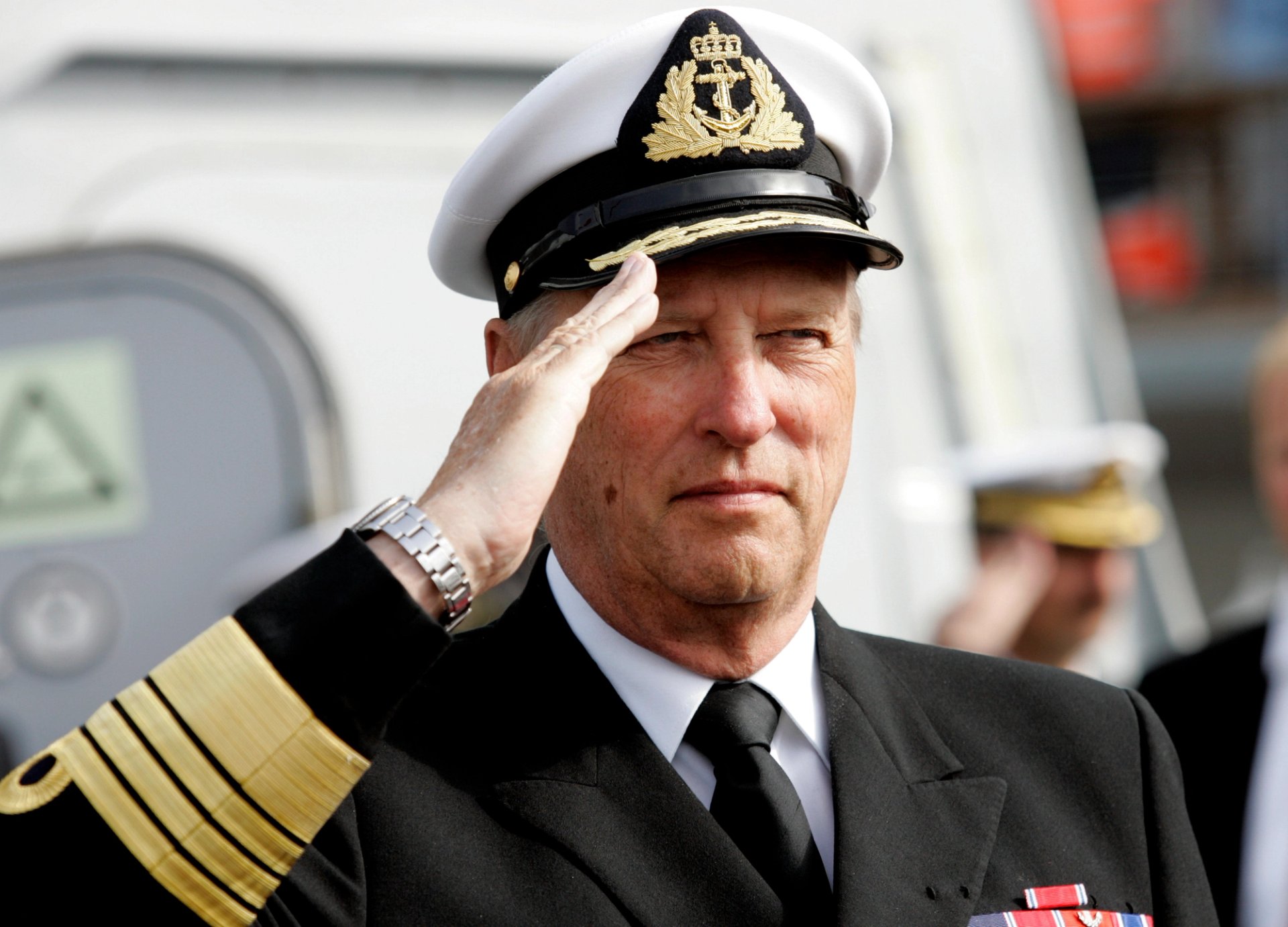 Kong Harald ble tatt i mot av sjefen for Harald Haarfagre, kommandørkaptein Per Jan Skjegstad, da han ankom Madla-leiren i dag. Kongen inspiserte æresgarden, før han fikk en nærmere orientering om leiren, som har vært benyttet til militære formål siden 1871.