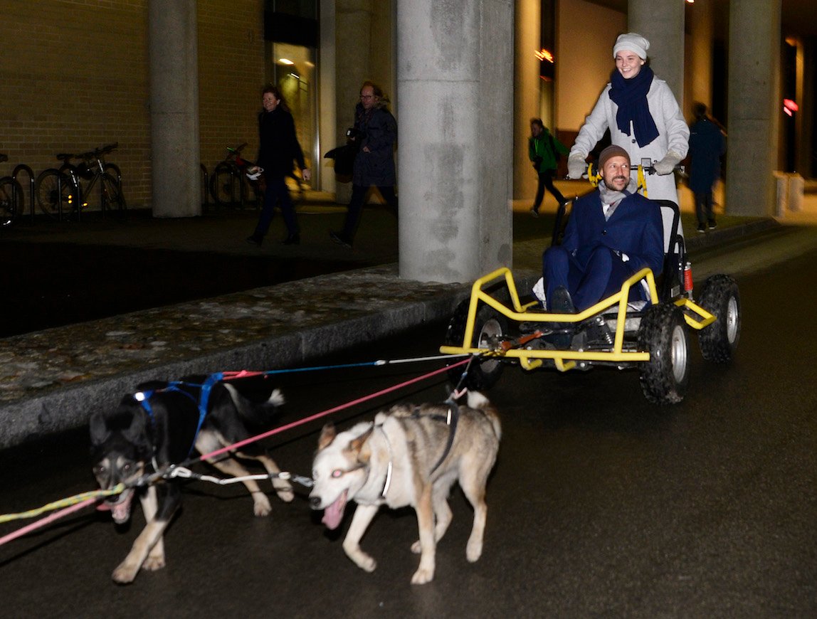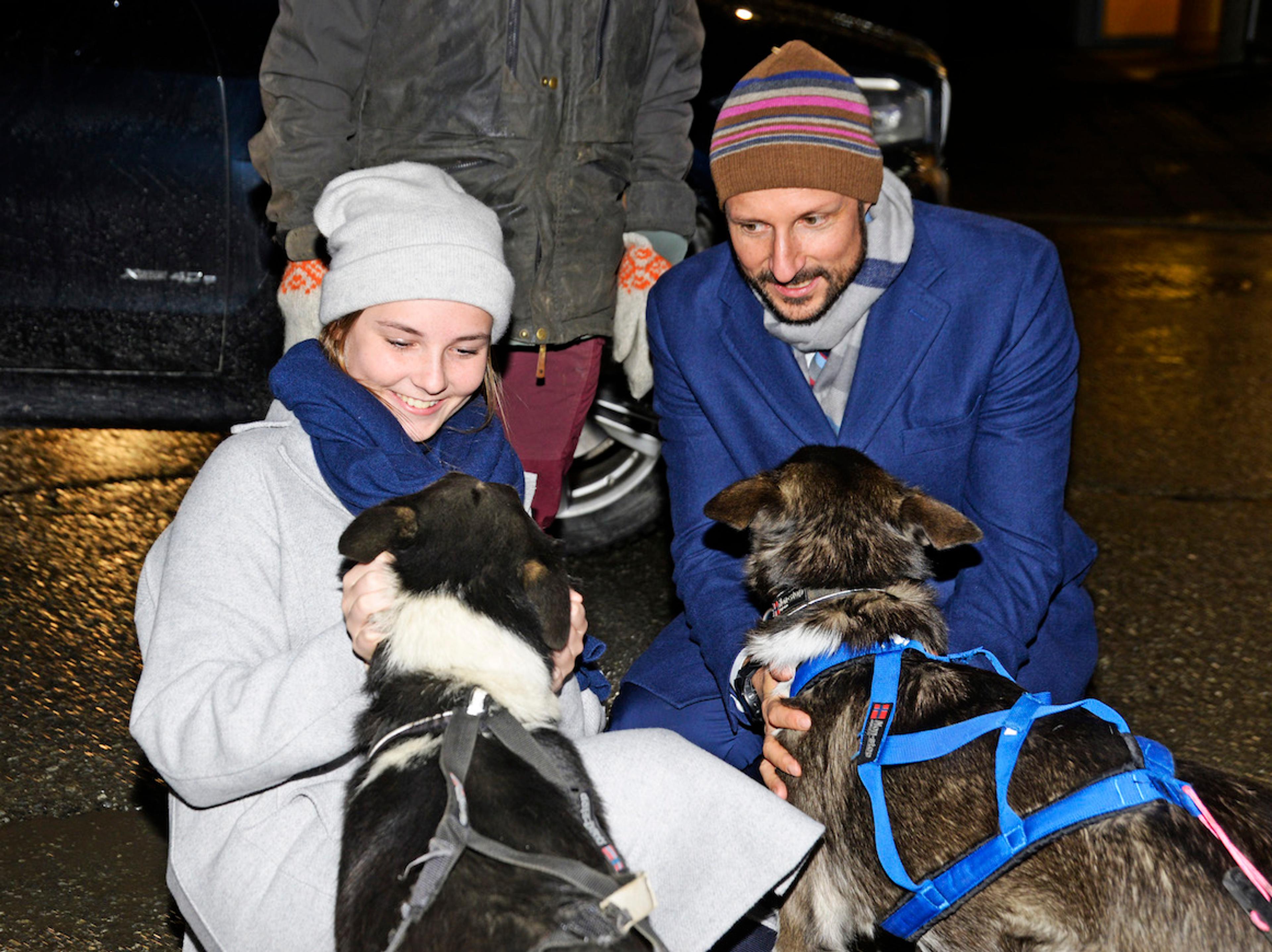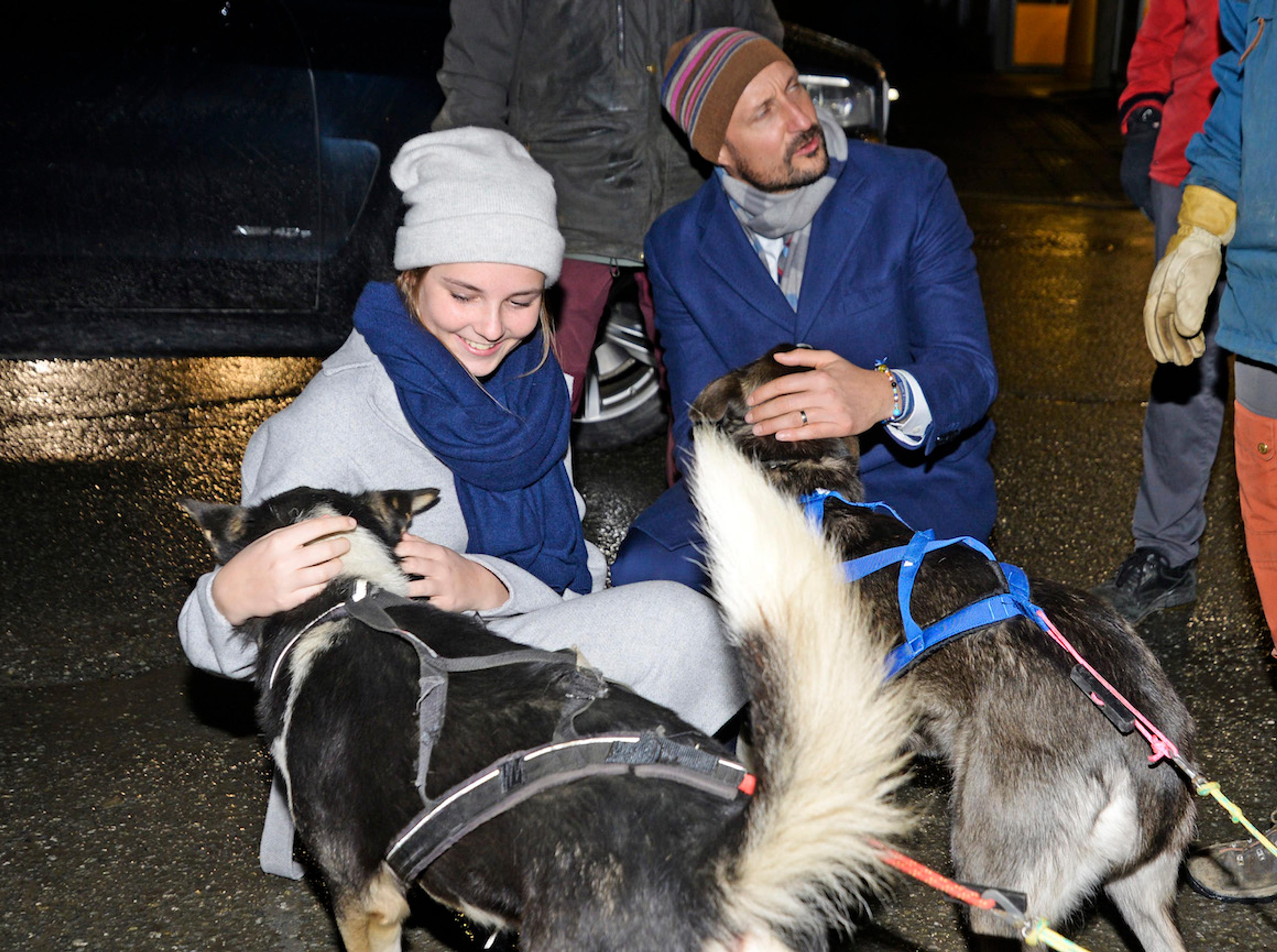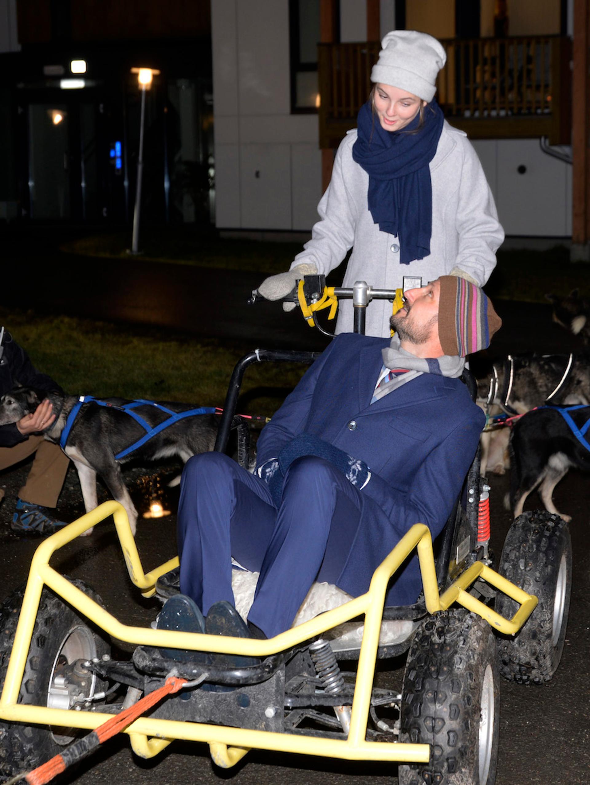 Turen til Polaria gikk med hundespann. Det var Prinsessen som styrte, mens Kronprins Haakon fikk være passasjer.