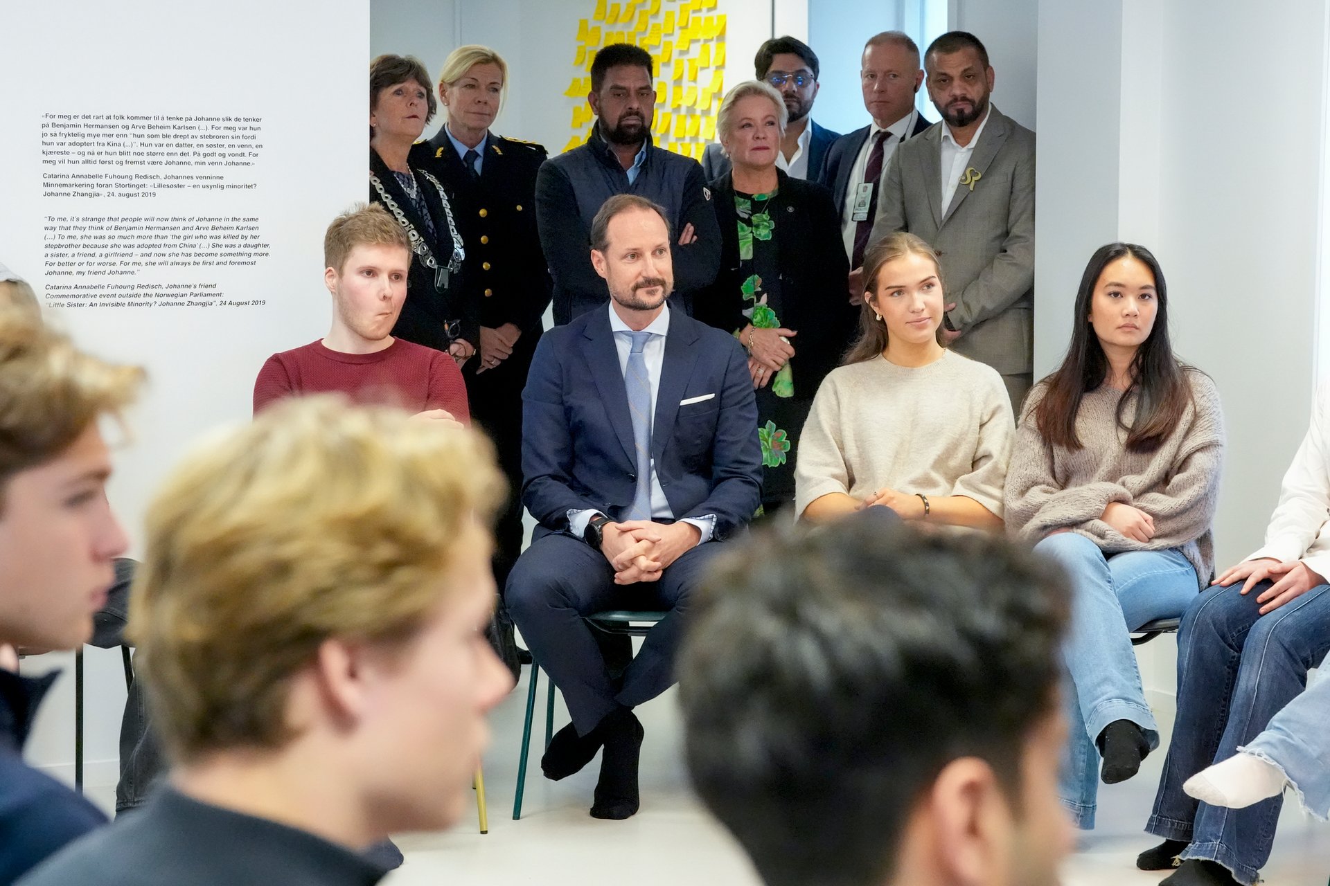 Kronprinsregenten fikk ta del i dialogsirkelen med elever fra Sandvika videregående skole i lærings- og minnesenteret i Al-Noor-moskeen.