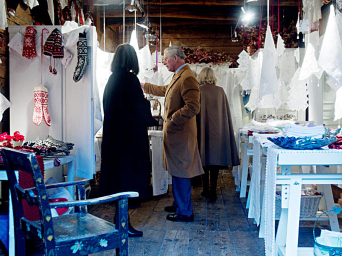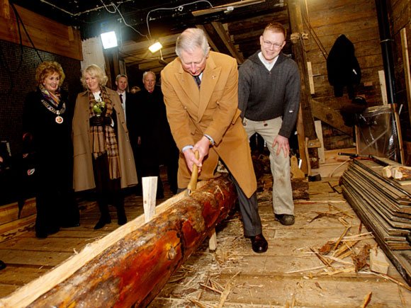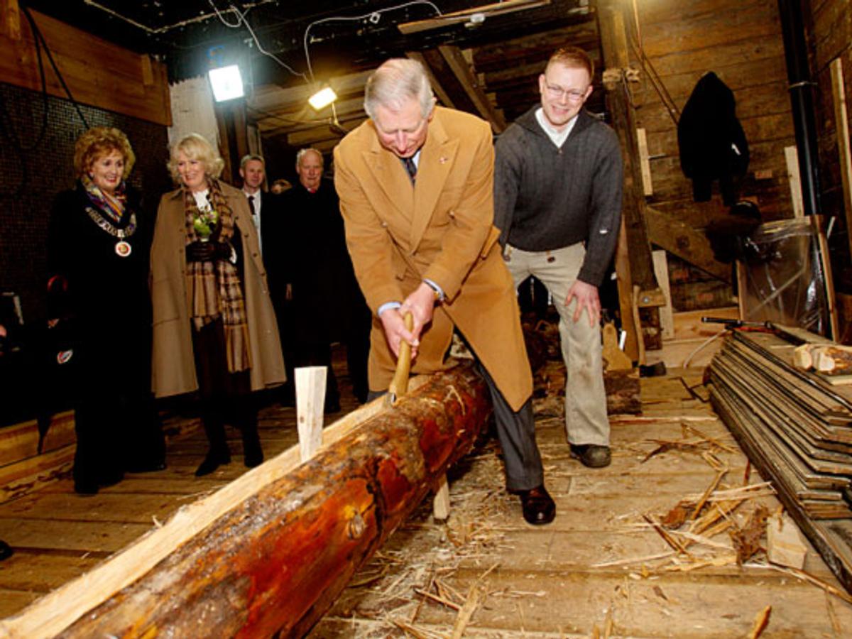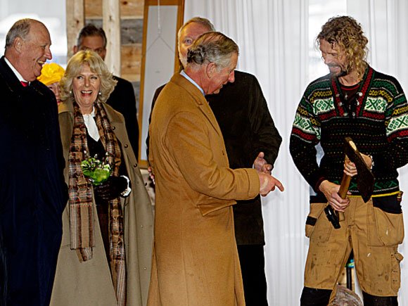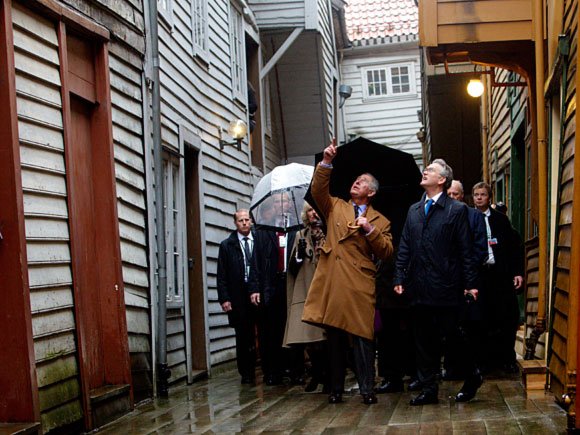 Riksantikvar Jørn Holme og forfatter Gunnar Staalesen – kjent for sine kriminalromaner fra Bergen – ga de kongelige en innføring i Bryggens historikk og landemerker. Følget kom også inn i et av byggene som er under rekonstruksjon, og Prins Charles fikk selv prøve seg med øksen.