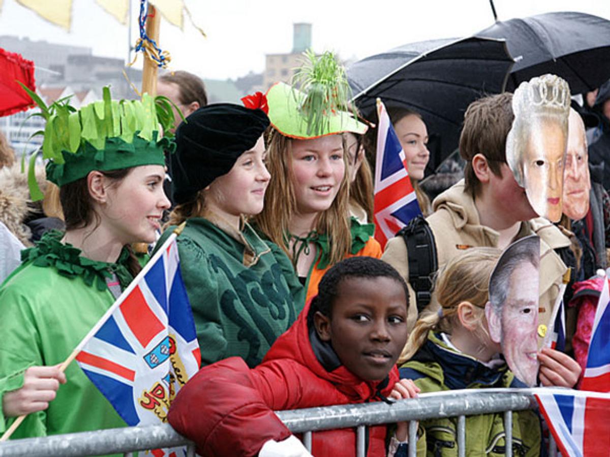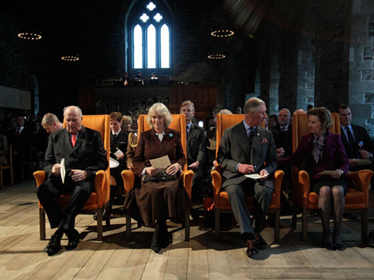 Deres Majesteter Kongen og Dronningen ledsaget Deres Kongelige Høyheter Prinsen av Wales og Hertuginnen av Cornwall til Bergen på andre dagen av parets Norgesbesøk.