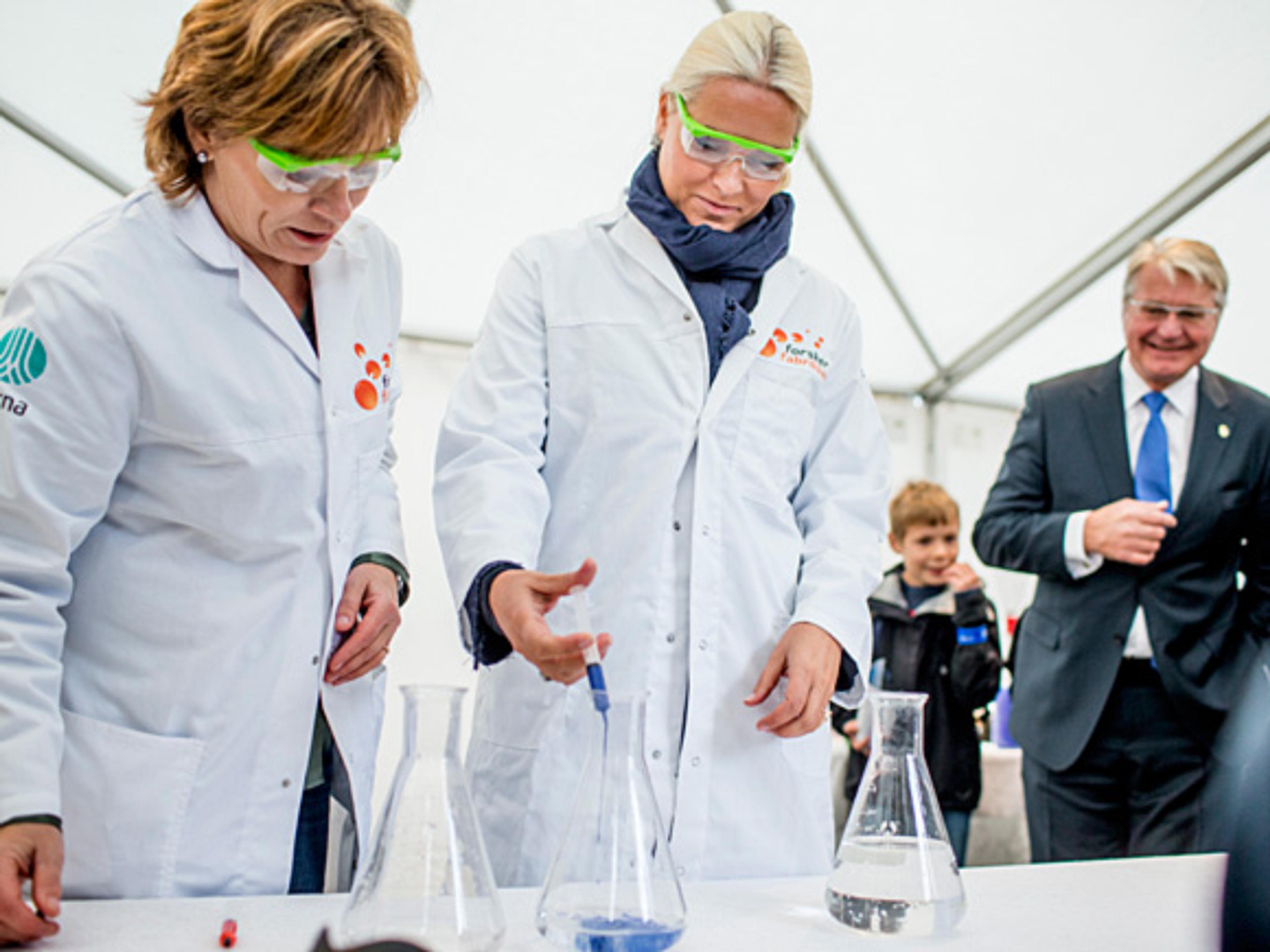 Hos "Miniforskeren" fekk Kronprinsessa vere med under eit av eksperimenta til Forskerfabrikkens Hanne Finstad, og ved Forskingsrådets store akvarium fekk Kronprinsessa ei orientering om botnforhold og invaderande artar i Oslofjorden.