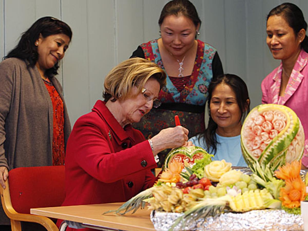 Dronning Sonja opplevde huset i følge med senterets leder, Gro Paulsen. Dronningen møtte malere og medlemmer av den internasjonale kvinnegruppen. Her fantes også grupper som drev med dataundervisning, norskopplæring for au-pairer, en lesegruppe for innvandrerkvinner og en gruppe som kalte seg blomsterpatruljen. Patruljen steller blomster på offentlige steder i Drøbak.