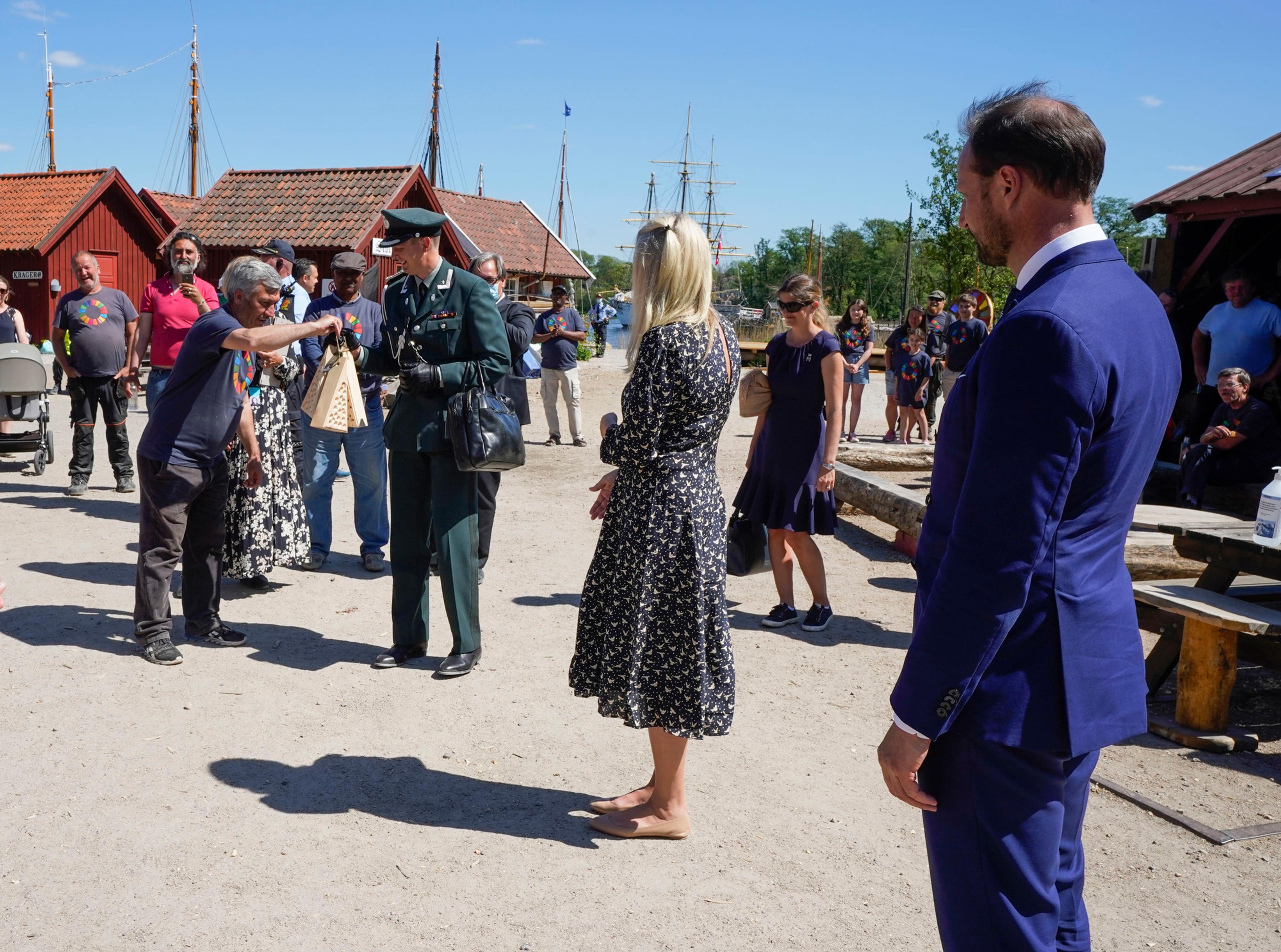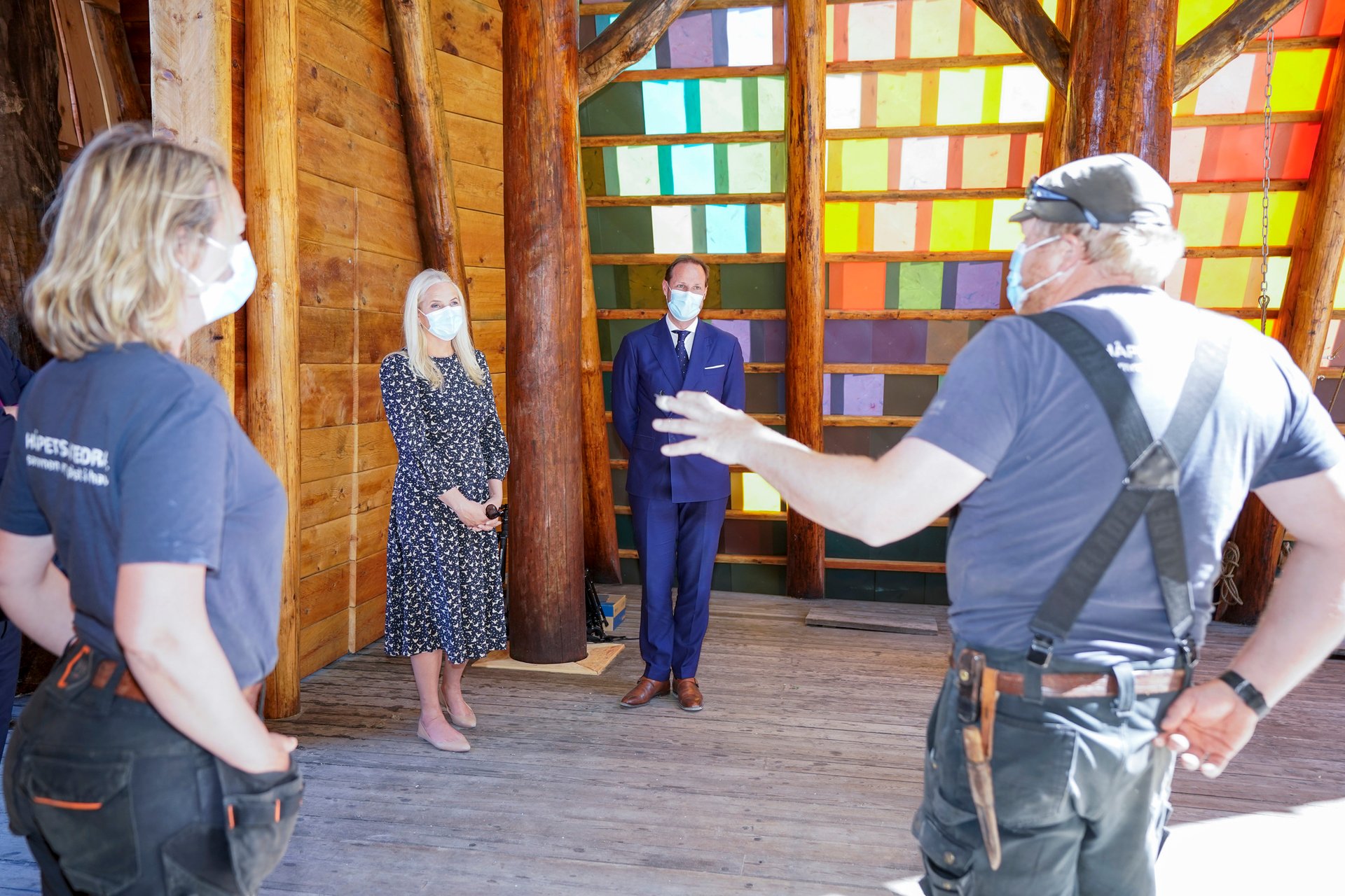 Biskop Sommerfeldt og Solveig Egeland tok Kronprinsparet rundt på byggeområdet der Kronprinsen og Kronprinsessen fikk en orientering om de forskjellige temaene knyttet til «Håpets katedral».