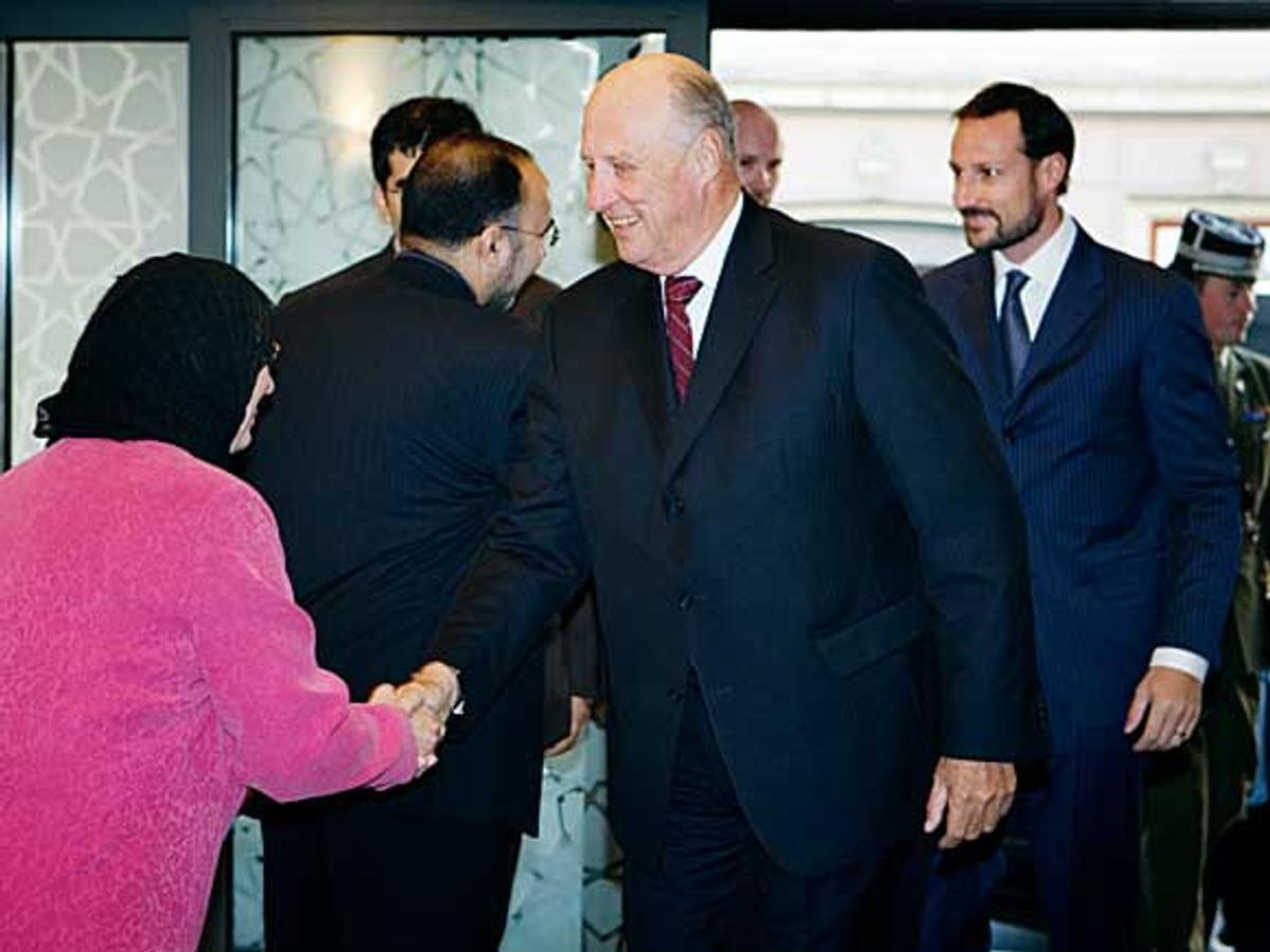 Kong Harald og Kronprins Haakon ble tatt i mot av Islamsk råd Norges generalsekrtær Shoaib Sultan, tidligere leder Lene Larsen og Mohamed Molioui, Styreleder Det islamske forbund.