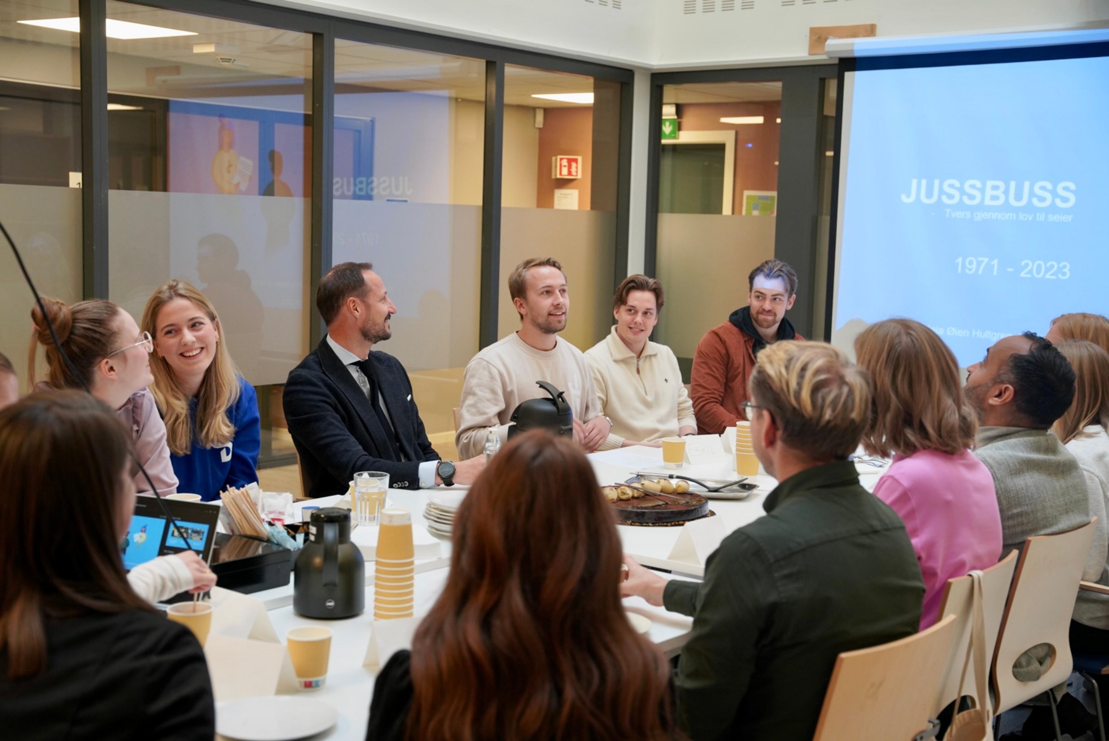 Hans Kongelige Høyhet Kronprins Haakon besøkte i dag Jussbuss i Oslo. Jussbuss er et studentdrevet rettshjelpstiltak som siden 1971 har tilbudt rettshjelp til ressurssvake grupper.