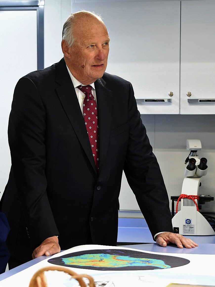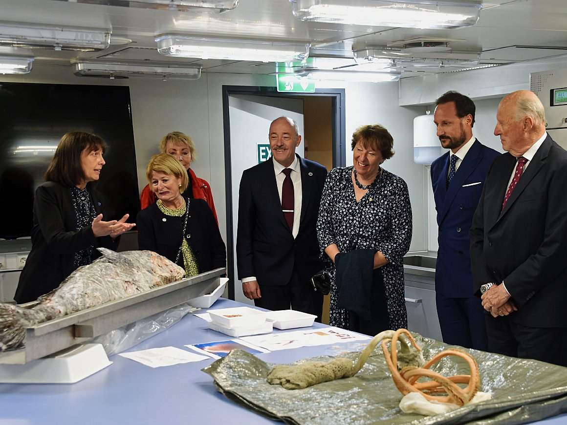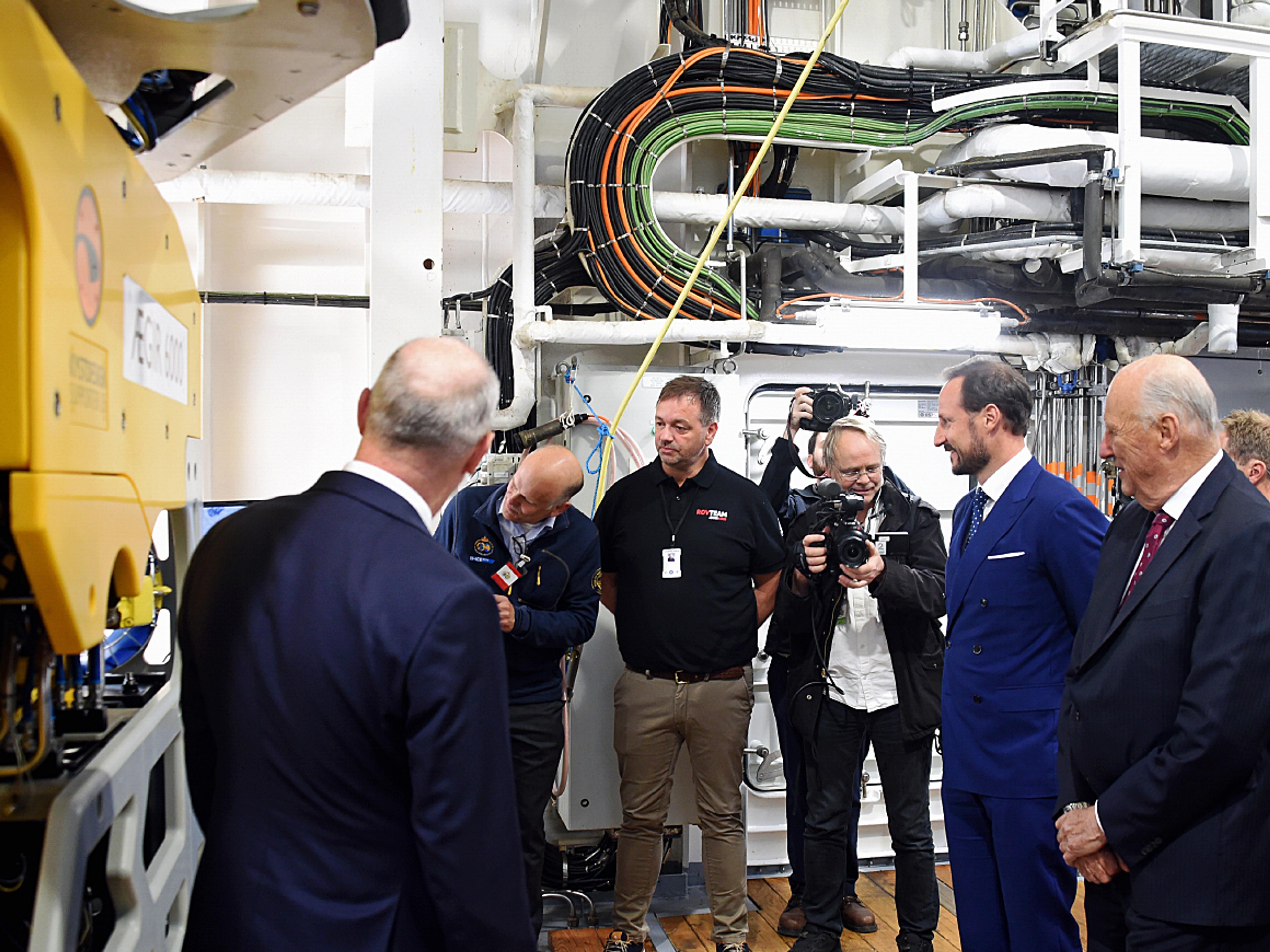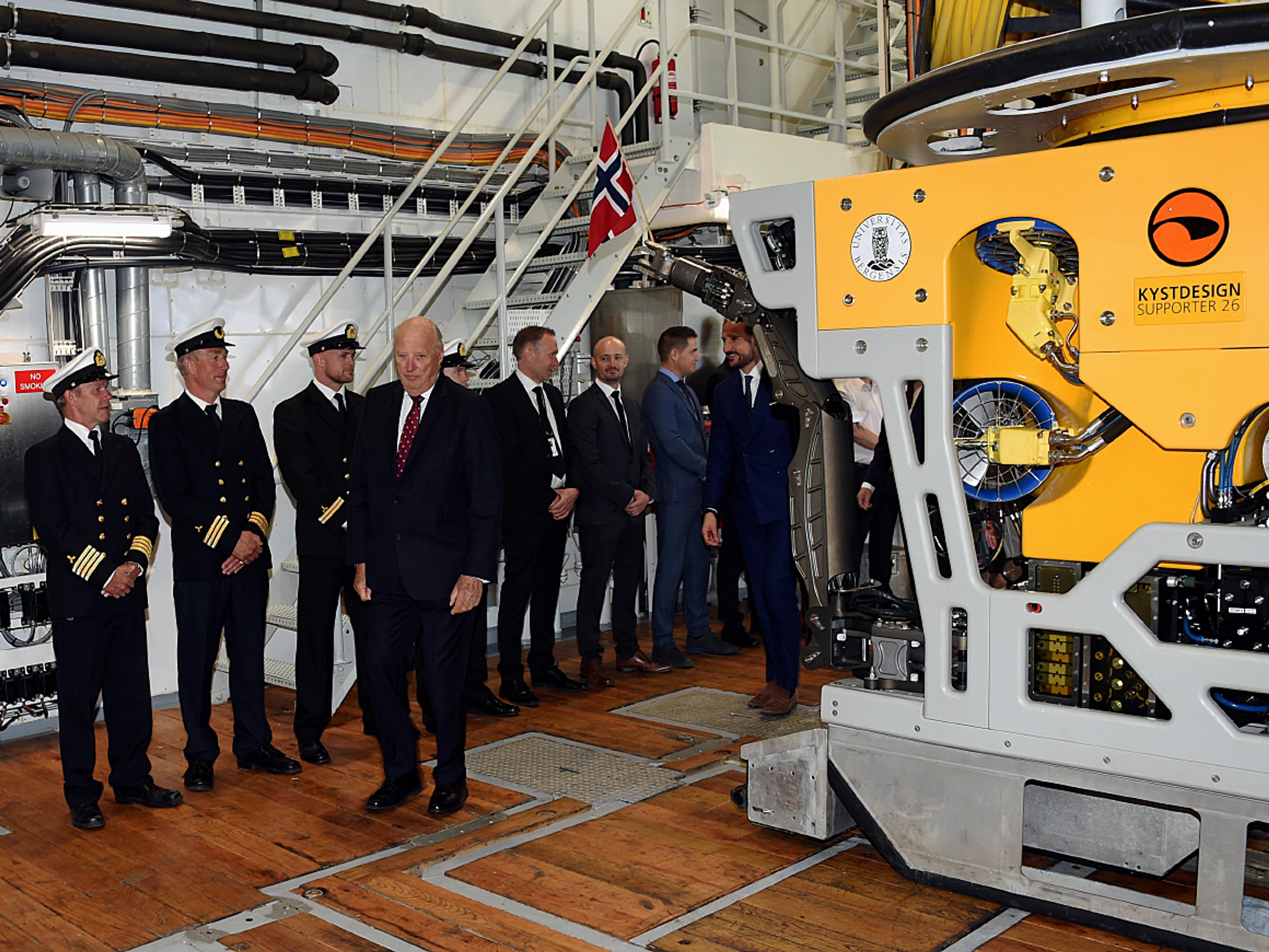 Kongen og Kronprinsen fikk en omvisning om bord, blant annet i skipets forskningshangar som også huset undervannsroboten ROV. Den ble brukt til å undersøke havbunnen langs Astrid-ryggen i Dronning Maud Land.