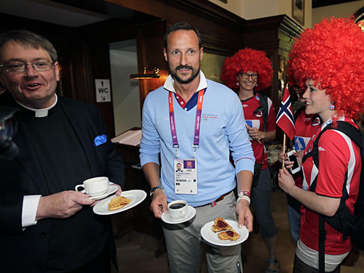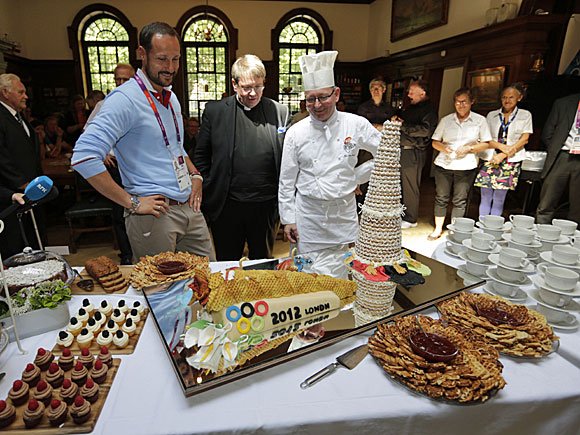Kronprins Haakon møtte besøkende og ansatte i sjømannskirken i London som ligger sentralt plassert i forhold til OL-anleggene. Det ble servert vafler og olympisk kake til de mange besøkende. Kronprinsen fikk også se de tre utstillingene som stilles ut i kirken under hele OL. Nico Widerberg stiller ut skulpturer, Kjetil Haaland malerier og Solrunn Nes viser sine ikoner.