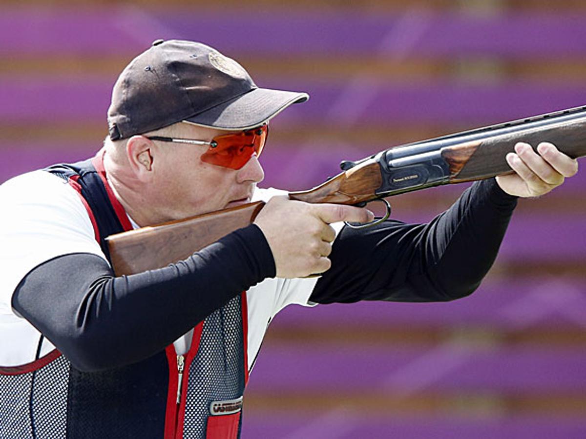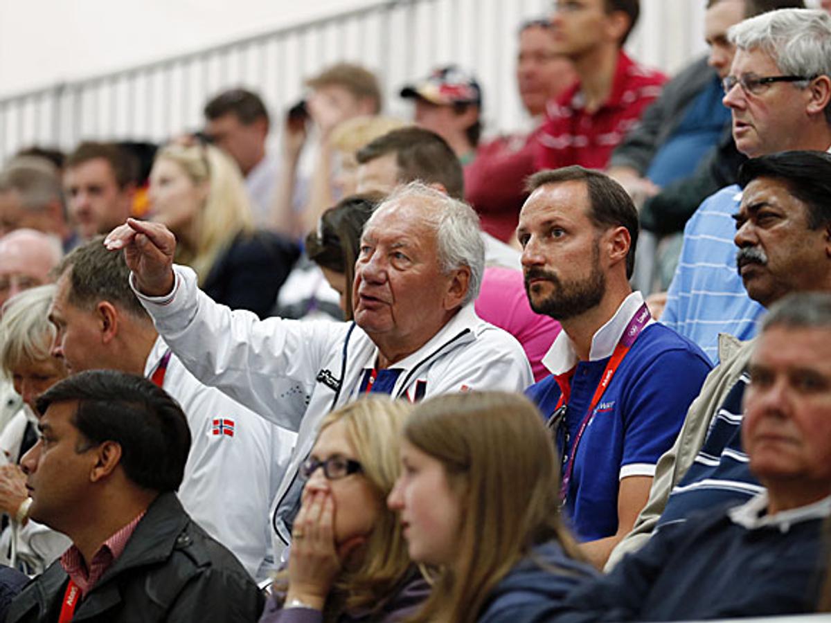Etter første kvalifiseringsrunde i skeet vekslet Kronprinsen noen ord med skytteren og det norske medaljehåpet Tore Brovold. Kvalifiseringen fortsetter i morgen, tirsdag.