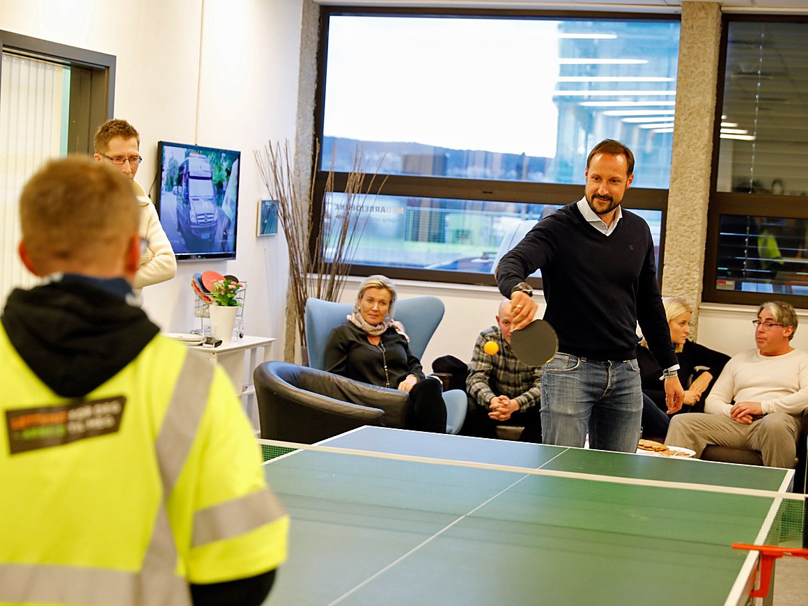 Etter å ha sett korleis bedrifta kjeldesorterer, vart Kronprinsparet med på kontoret for å spele bordtennis, ete vaflar og snakke med nokre av dei tilsette.
