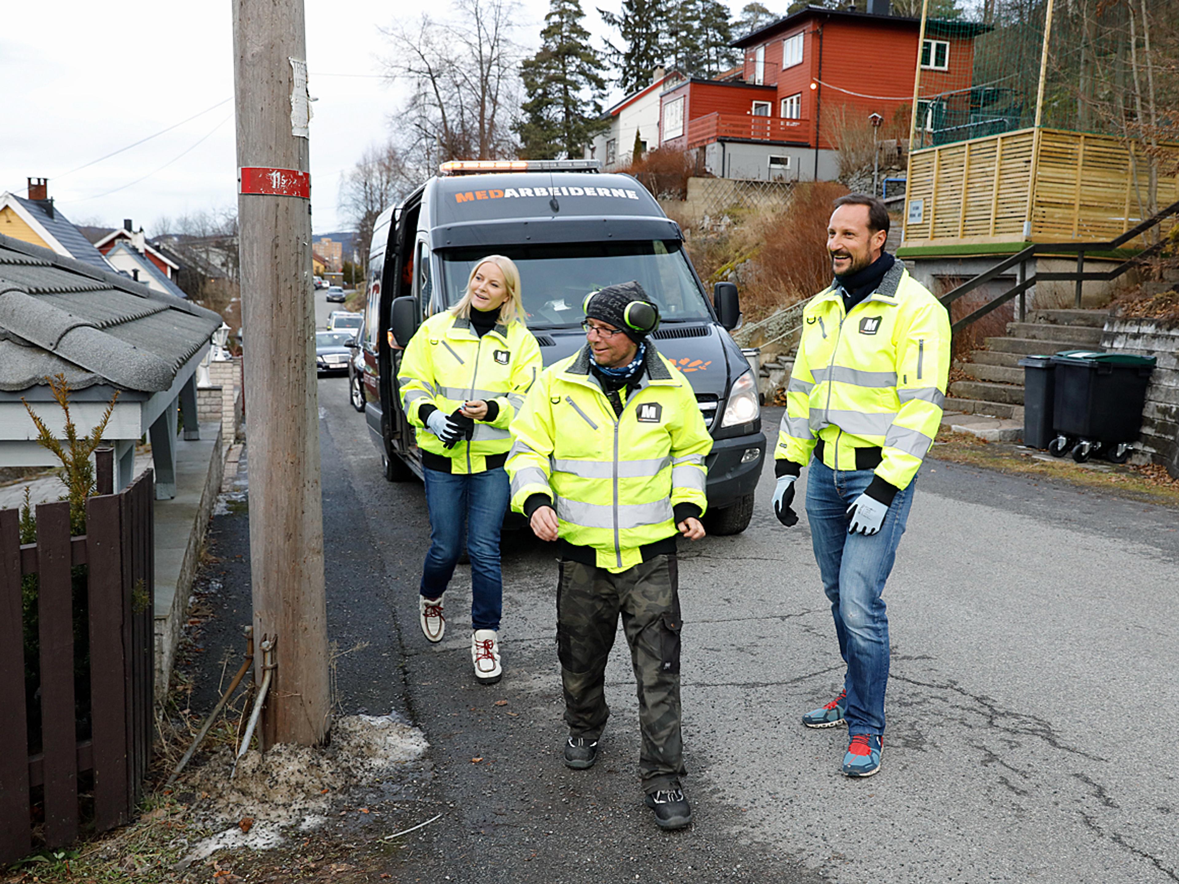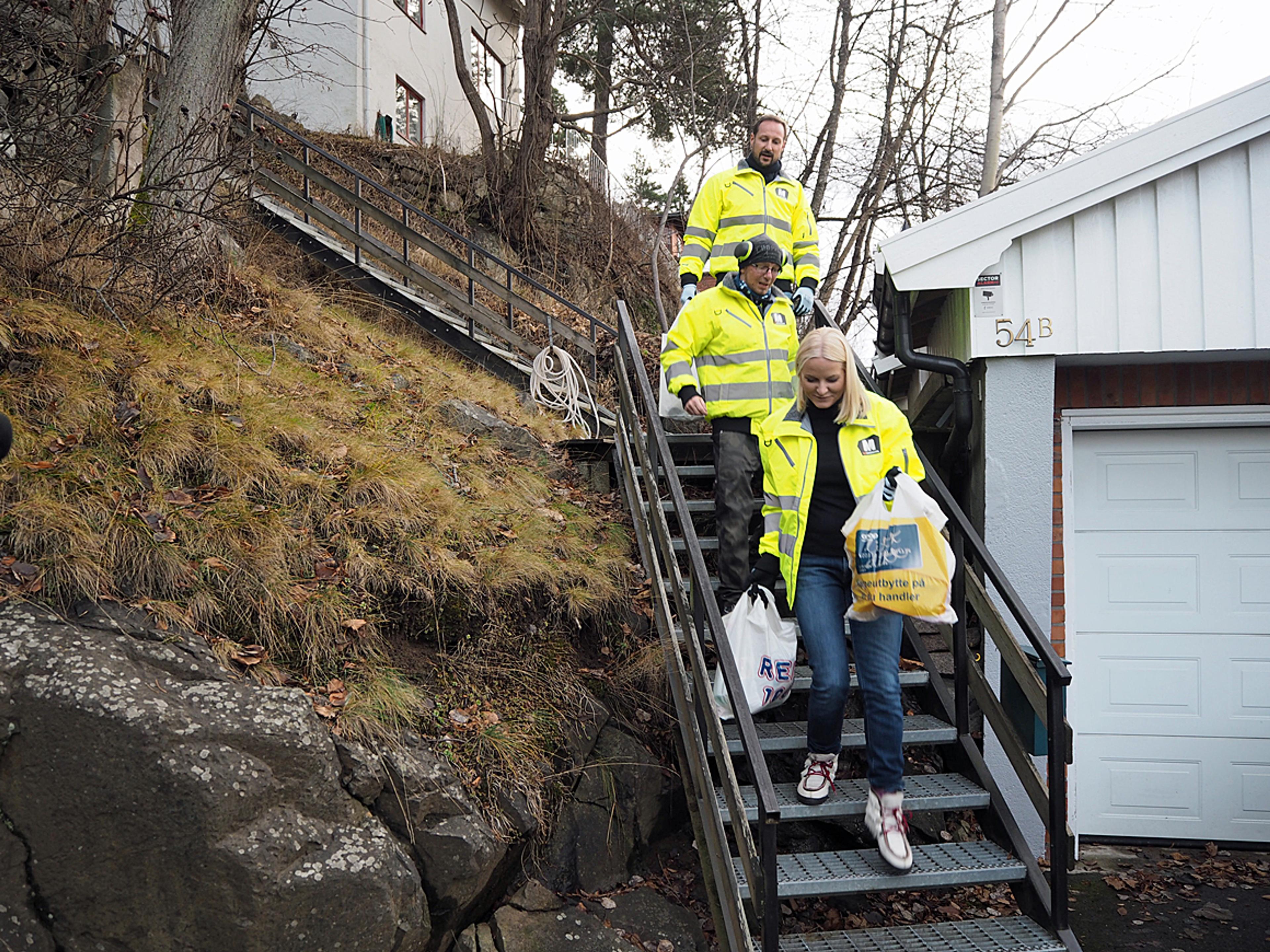 Dei Høgvørde Kongelege Kronprinsen og Kronprinsessa fekk utlevert arbeidsantrekk og vart med Medarbeiderne ut på Godlia i Oslo for å hente glas- og metallemballasje heime på trappa hos kundar.