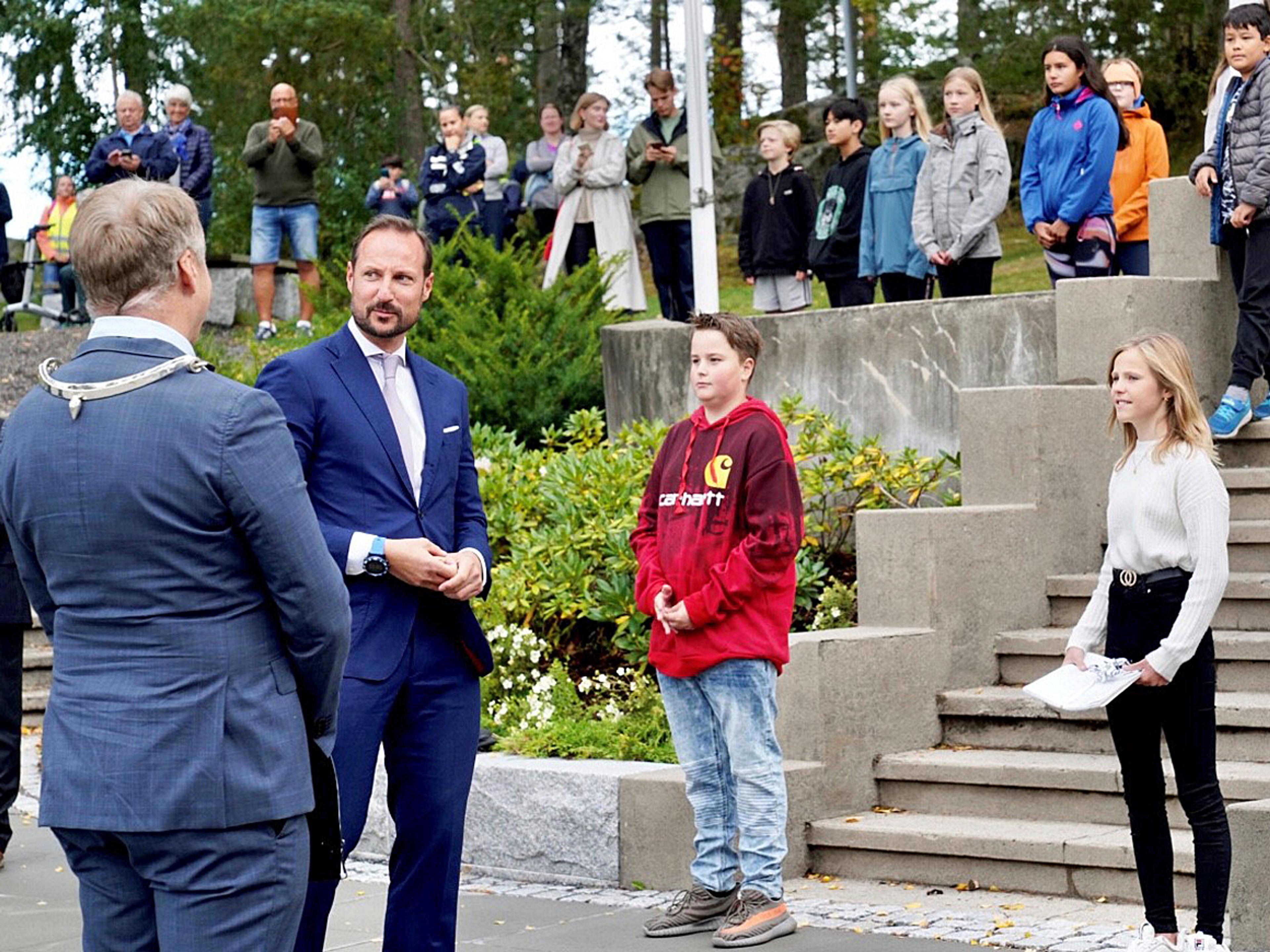 Kronprinsens besøk i Indre Østfold startet i Folkeparken i Askim. Syvendeklassingene på Askimbyen skole overleverte tegninger om erfaringer med pandemien.