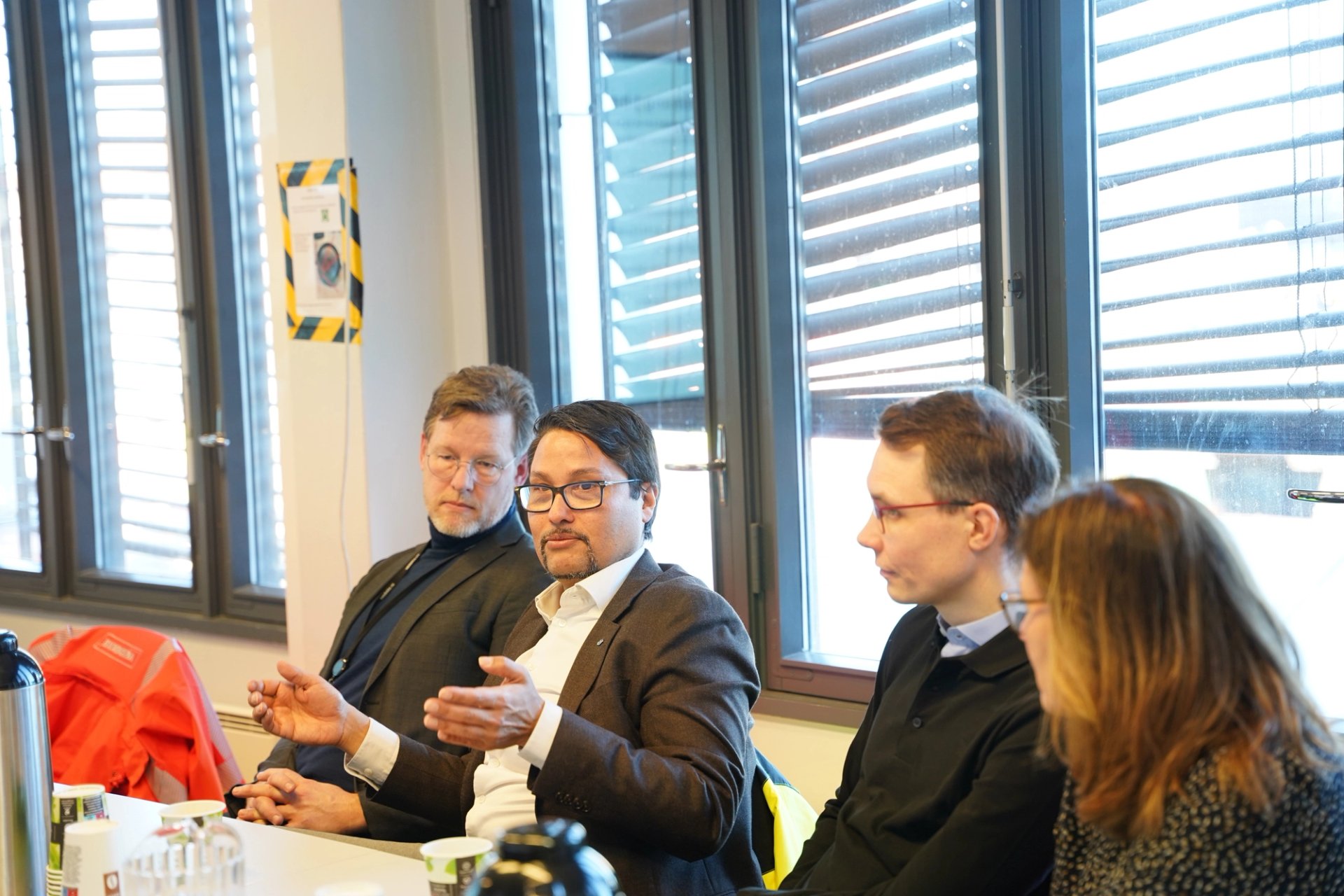 Tilbake på anleggskontoret til Veidekke fikk Kronprinsen høre om ulike temaer knyttet til entreprenørvirksomhet - blant annet fikk han orienteringer om de største utfordringene i årene som kommer, ledelse og motivasjon, og seriøsitet, inkludering og mangfold i bransjen.