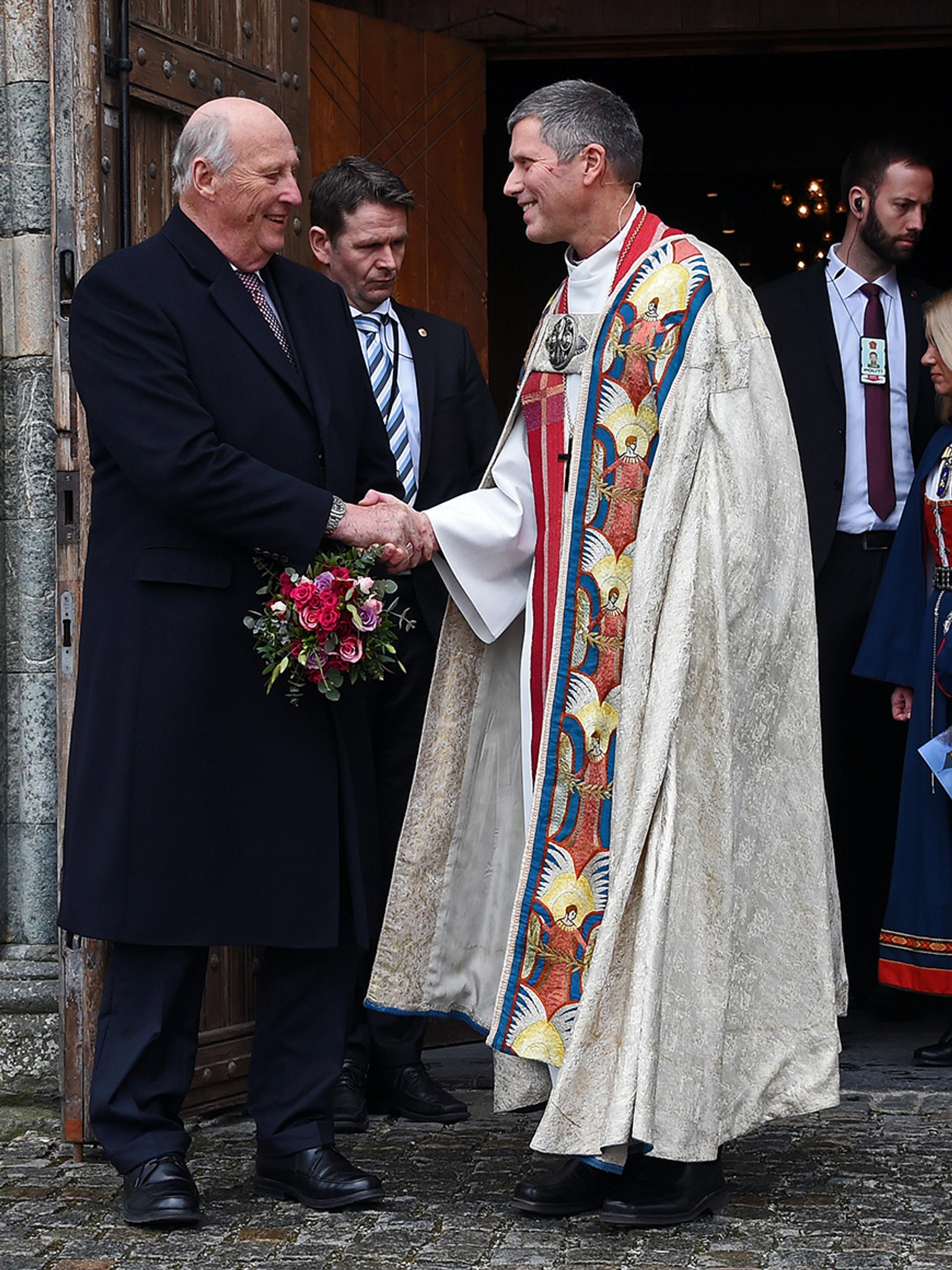 Etter gudstenesta i Stavanger domkyrkje var Kong Harald til stades under ein lunsj i Stavanger hall til ære for den nye biskopen. På menyen stod bakt kveite frå Hjelmeland.