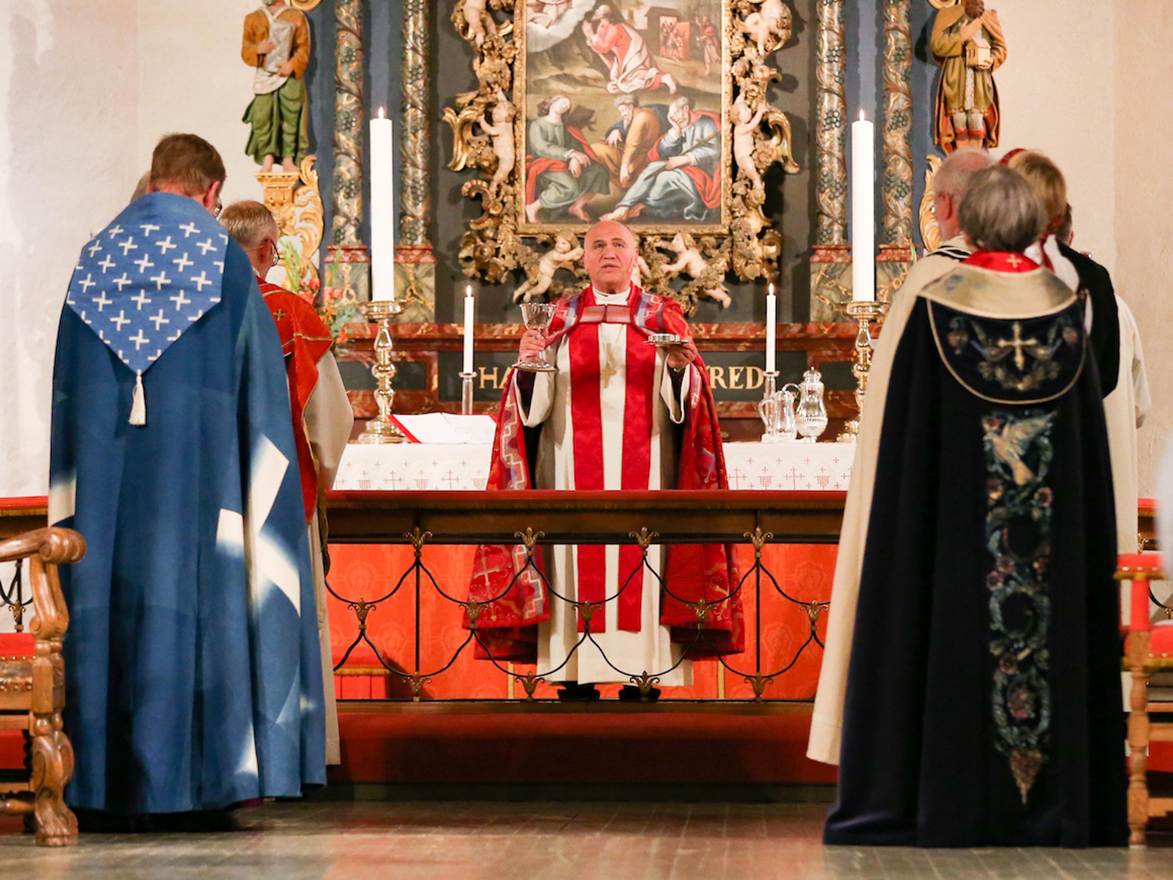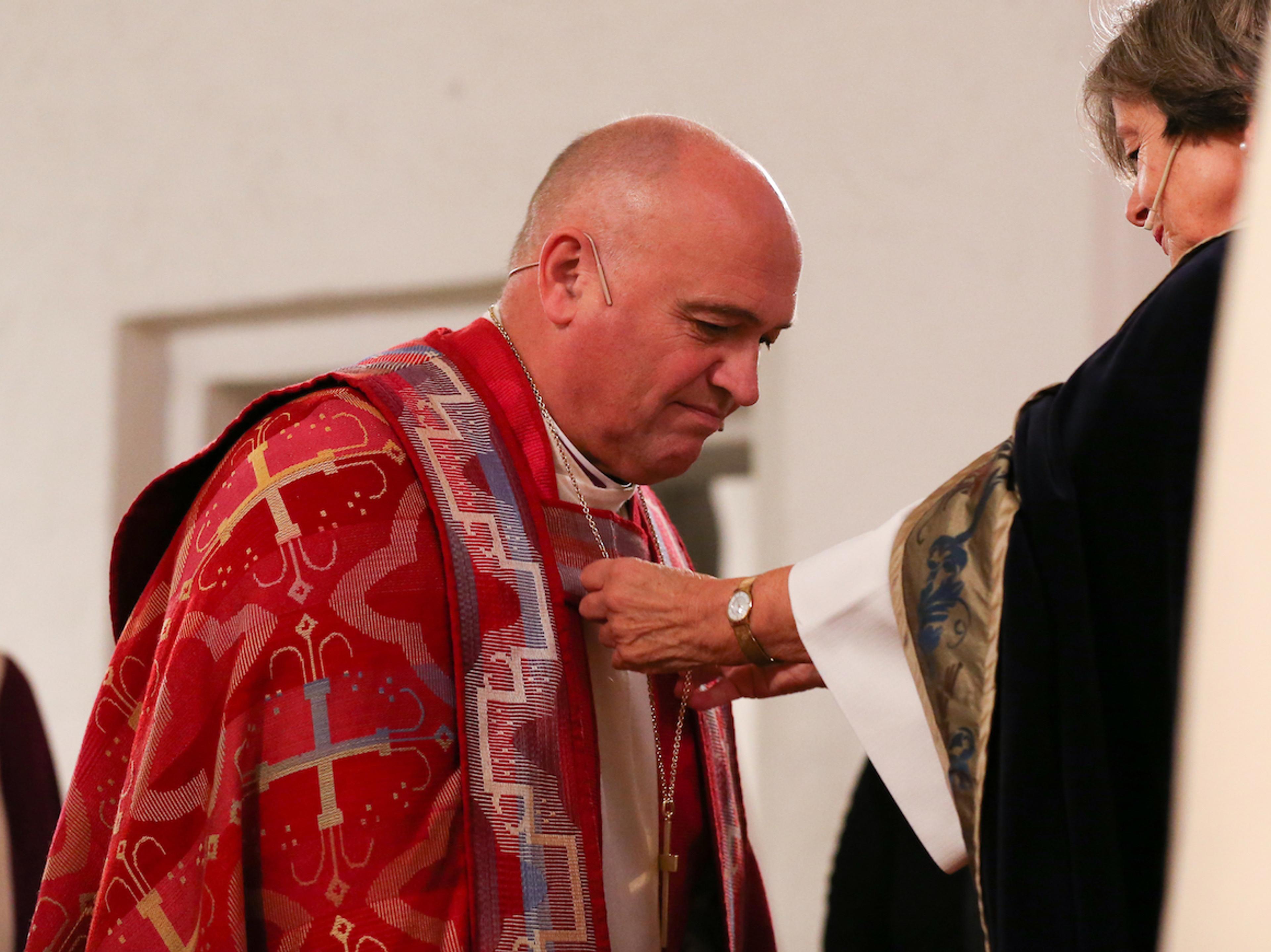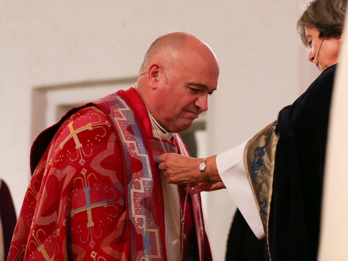 Biskoper og prester fra inn- og utland deltok i forbønnen i dag. Jan Otto Myrseth avla bispeløftet for preses, som la korset rundt hans hals som synlig tegn på at han nå var vigslet til biskop i Den norske kirke.