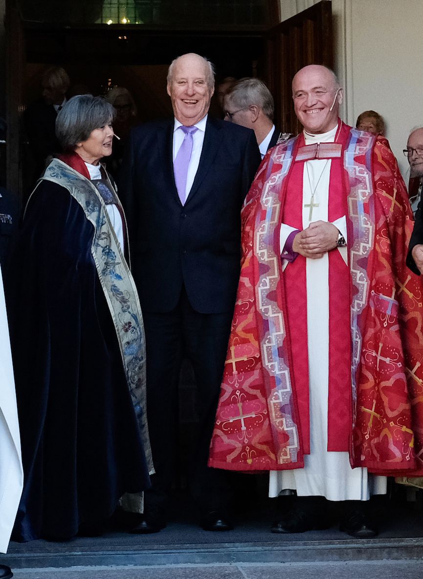 Kong Harald ble tatt i mot på kirketrappen og ledsaget inn i domkirken av preses i bispekollegiet, biskop Helga Haugland Byfuglien. Deretter fulgte den kirkelige prosesjonen med blant annet den nye biskopen i Tunsberg.