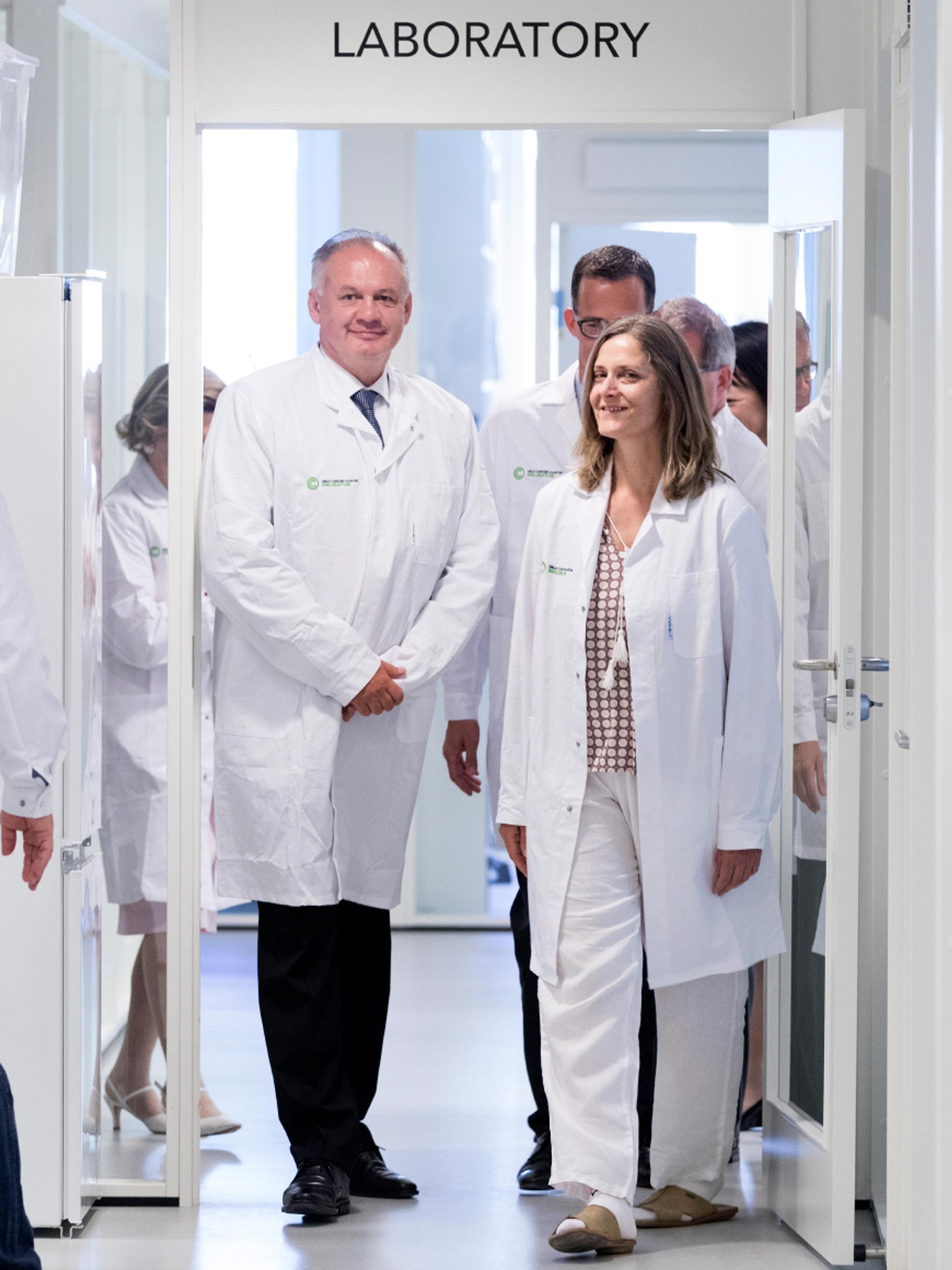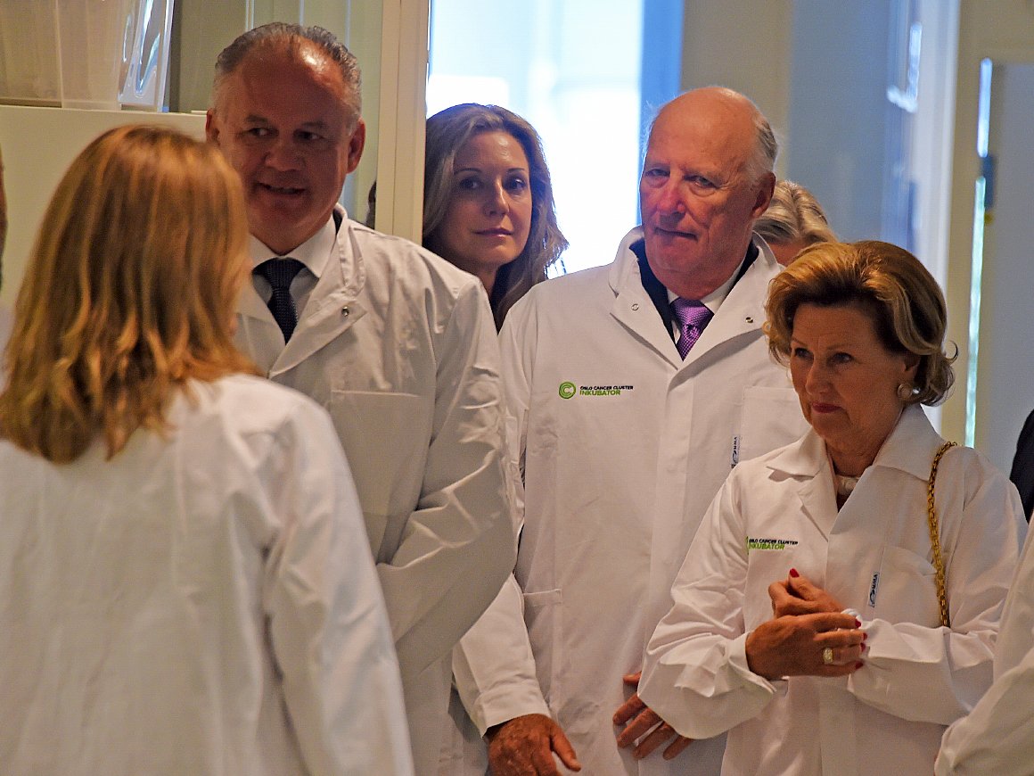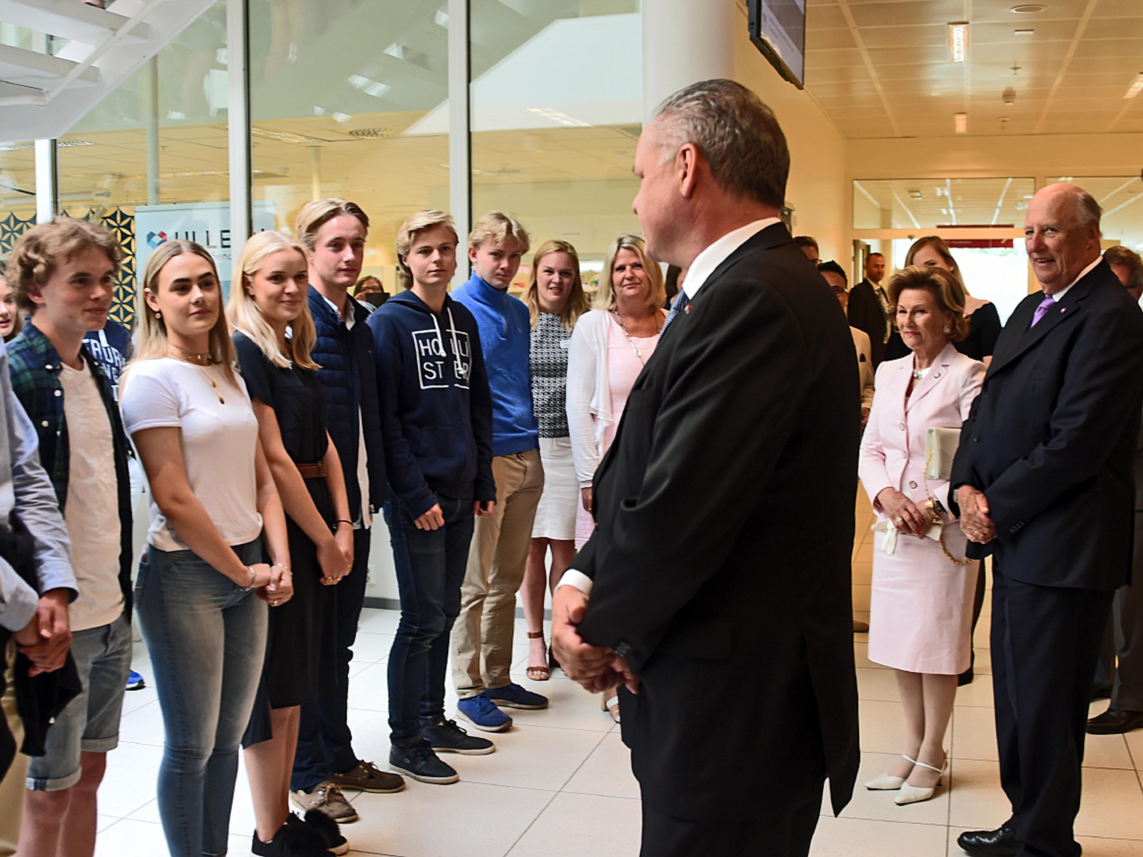 Kongeparet og President Kiska fikk hilse på rektor Torill Røeggen og noen av skolens elever før et faglig program om pågående kreftforskning startet.