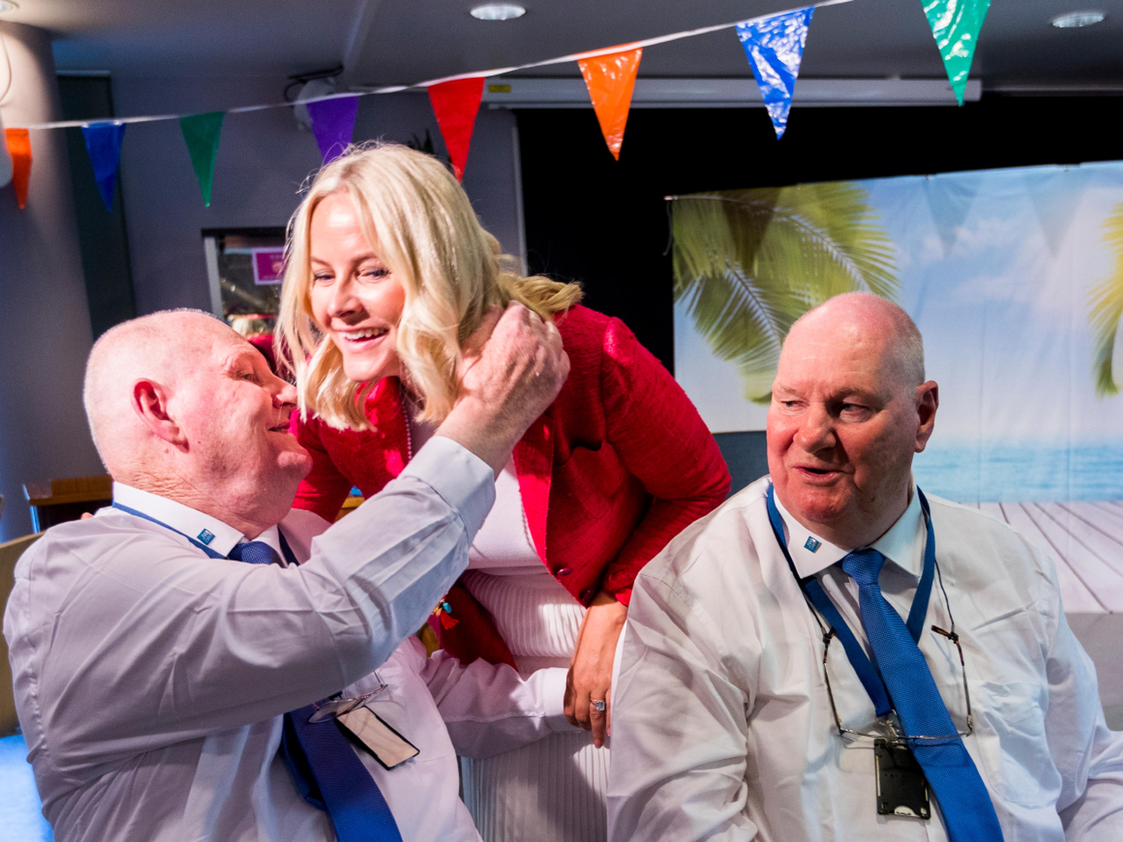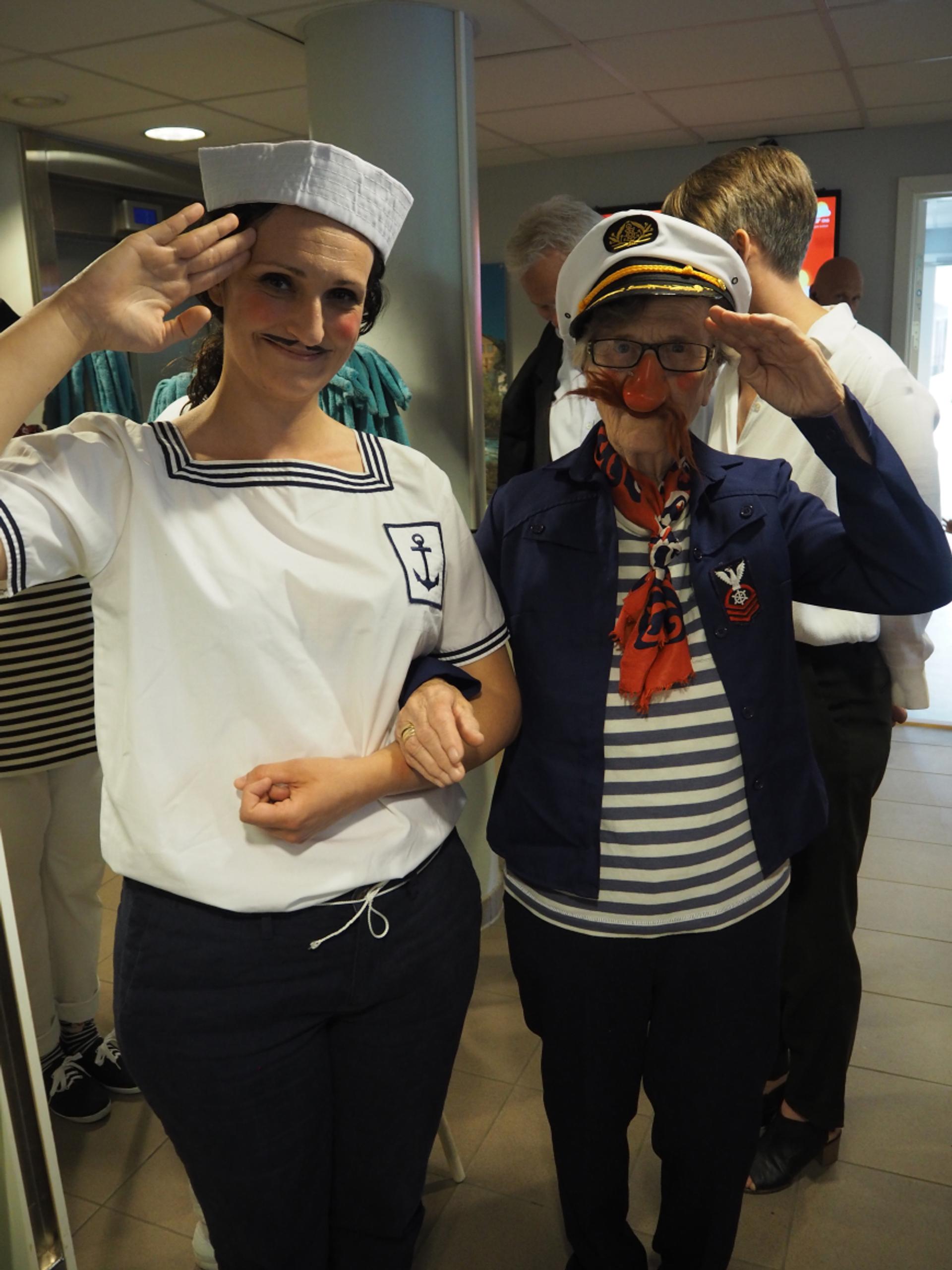 I kantina i første etasje ble Kronprinsparet bedre kjent med alle som benytter seg av tilbudet i trivelige Treschows hus. En gruppe amatørskuespillere mellom 60 og 92 år fremførte teaterforestillingen «Ferskvannsmatrosene» med gode historier om livet utover de faste gjøremålene.
