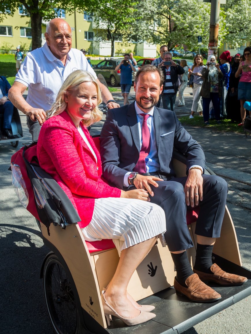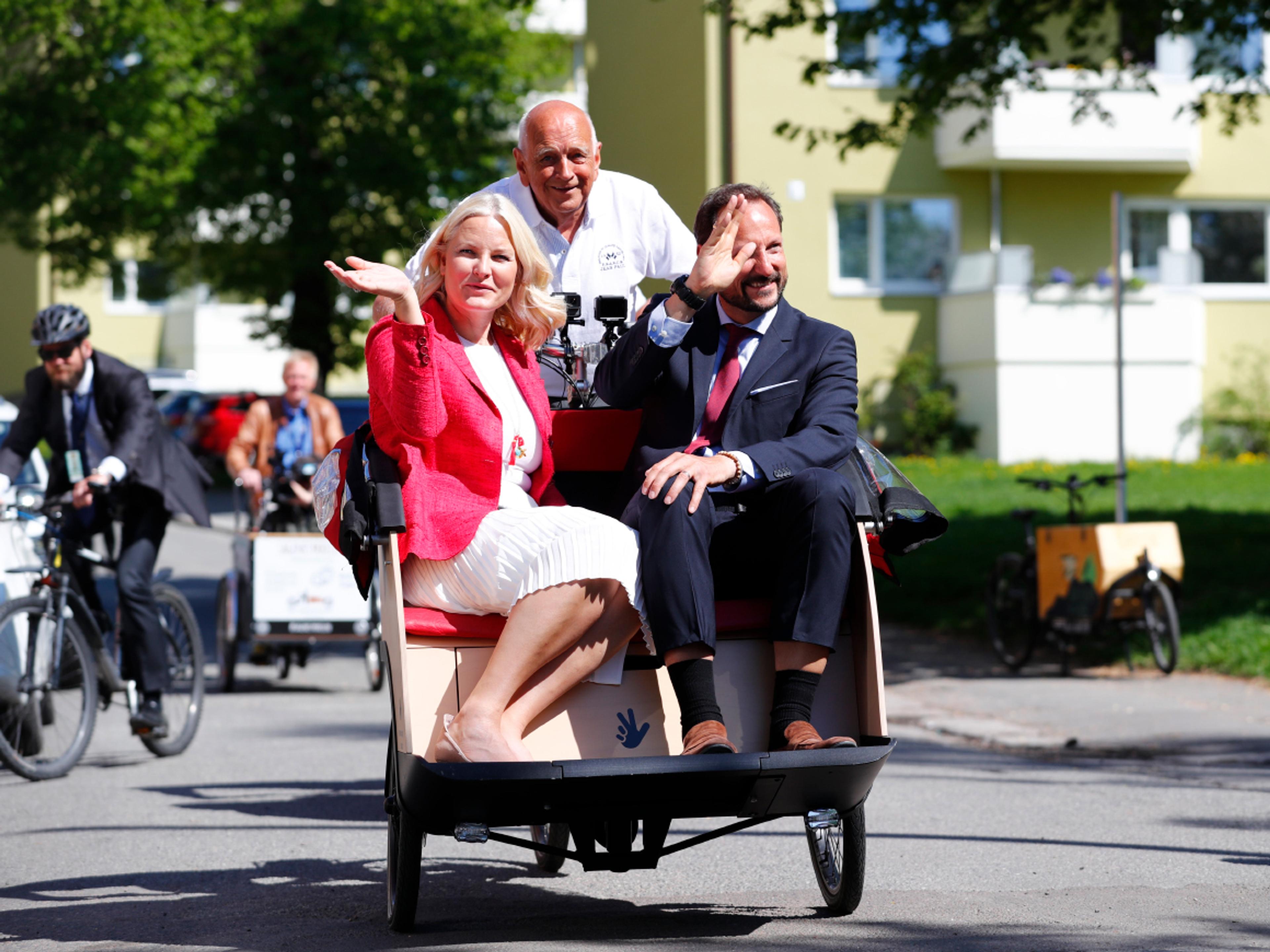 Det ble en minneverdig transportetappe fra Treschows hus. På utsiden av seniorsenteret ventet 80 år gamle Harald Øyen. Han stod klar med el-sykkelen sin med to seter foran hvor Kronprinsparet tok plass. I fjor syklet ildsjelen 177 turer med de eldre i bydelen.