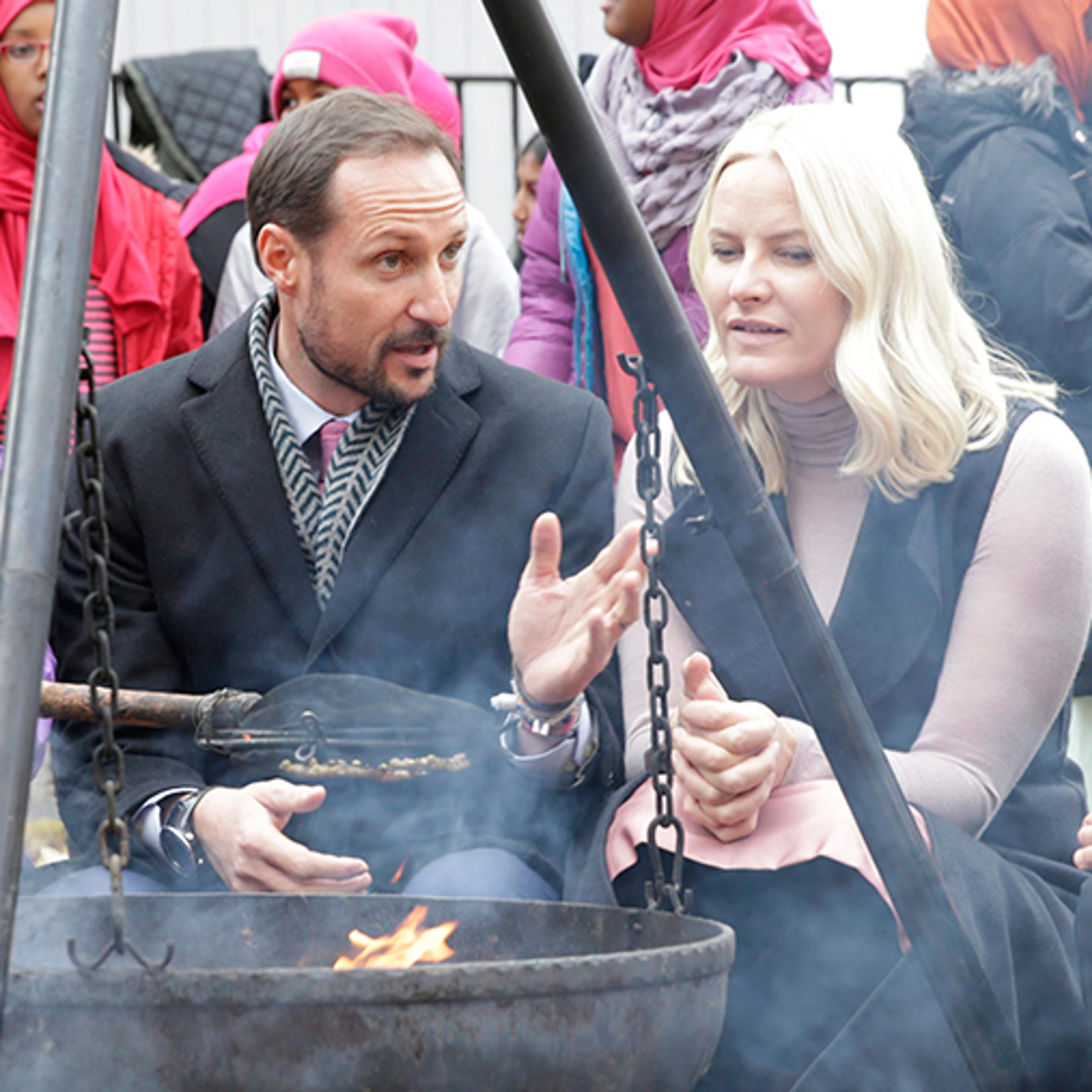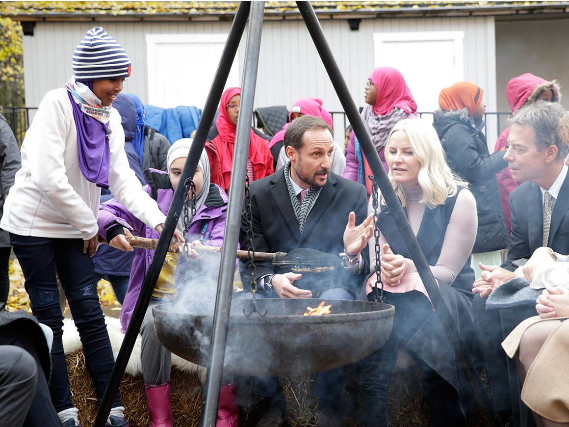For mange av barna på Tøyen er dette en god måte å få fine opplevelser ute i naturen på - men i dag ble det rigget høyballer og bålpanne med popcorn utenfor skolen, der Kronprinsparet tok plass.