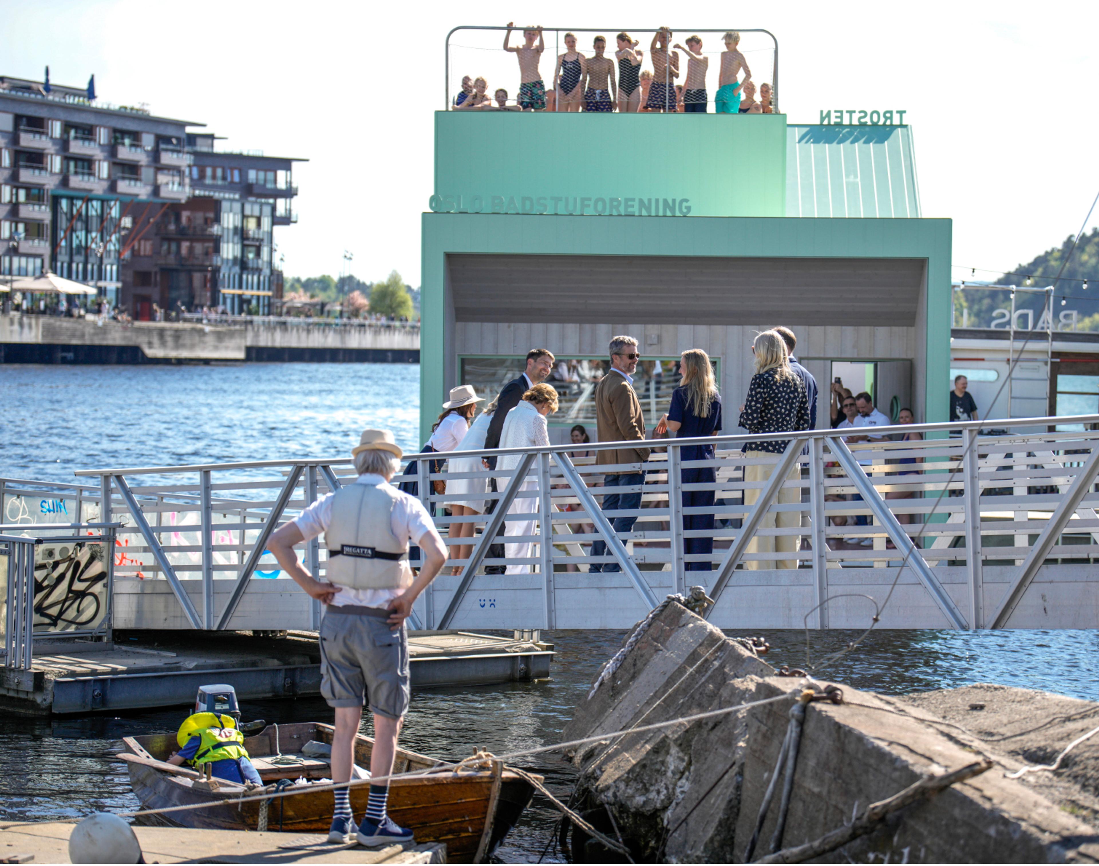 Spaserturen langs havnepromenaden førte selskapet forbi Oslo badstuforening og deres "fjordbadstuer". Deres nye badstue Trosten er tegnet av den samme arkitekten som Munch-museet, Estudio Herreros, og er Oslos første universelt utformede sauna.