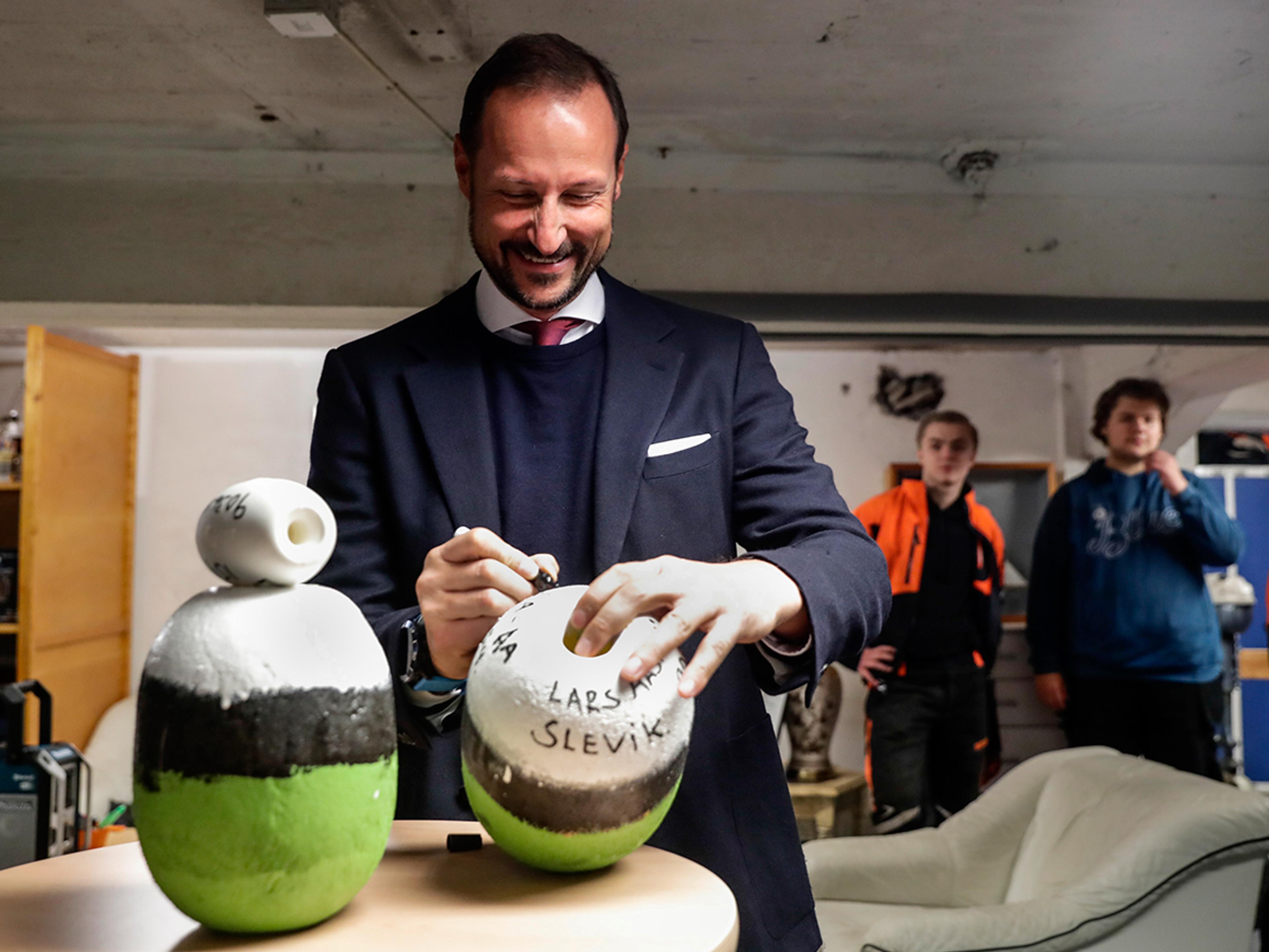 Ungdommene var i gang med å klargjøre tau til hummerfisket da Kronprinsen kom på besøk. Han signerte en av bøyene til teinene som ungdommene skal ta med ut i morgen når årets hummerfiske starter – som de håpet ville bringe lykke.