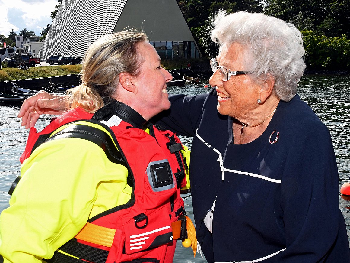 Prinsesse Astrid var den første til å gratulere gudmora, og saman beundra dei to den nye redningsskøyta der ho låg ved brygga på Bygdøy. Prinsesse Astrid nytta òg høvet til å helse på mannskapet som skal tenestegjere om bord.