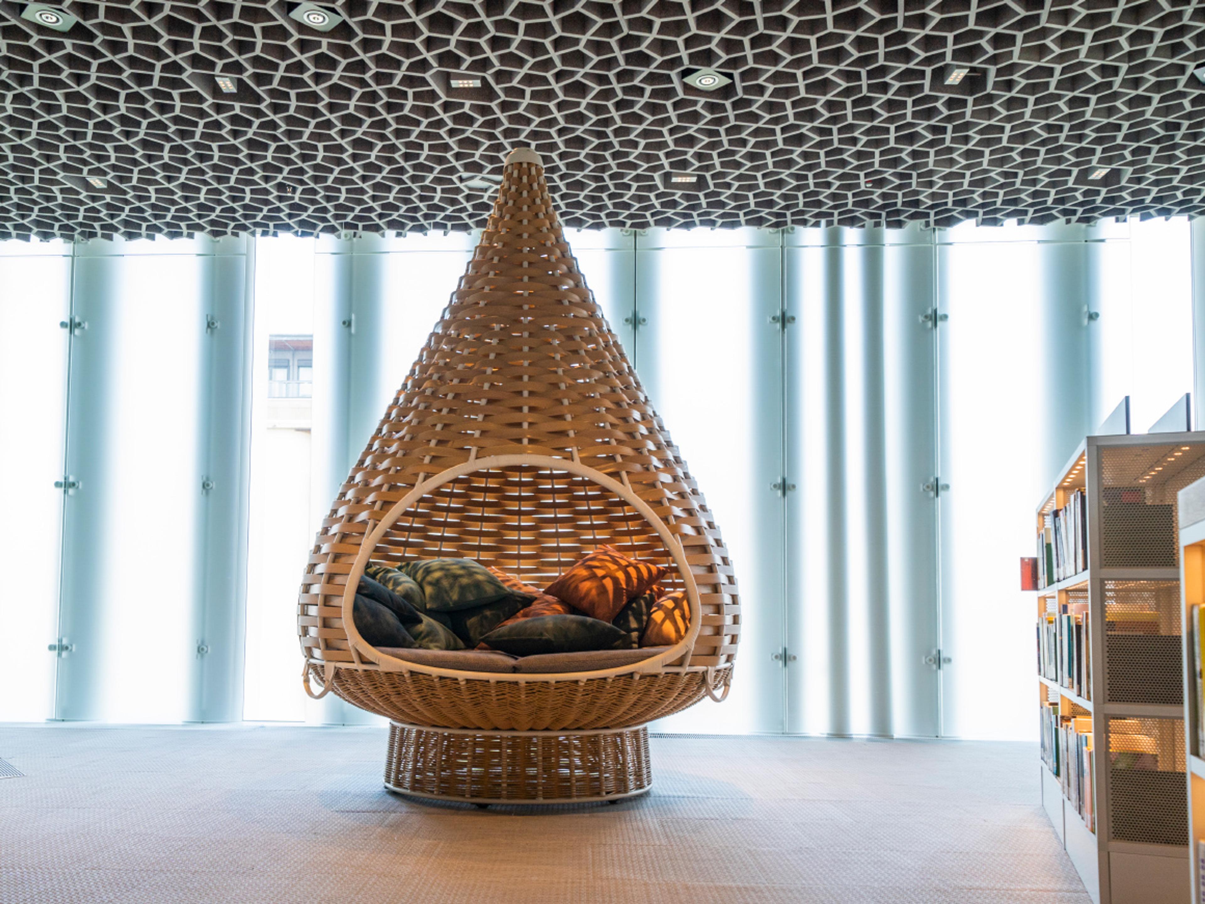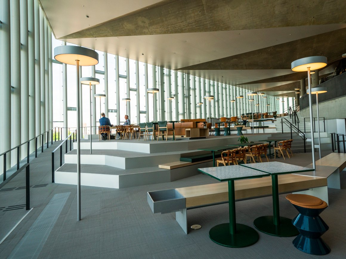I første estasje finnes restaurant og kafé, aviser og tidsskrifter, i tillegg til hentehyller og utlånsautomater.