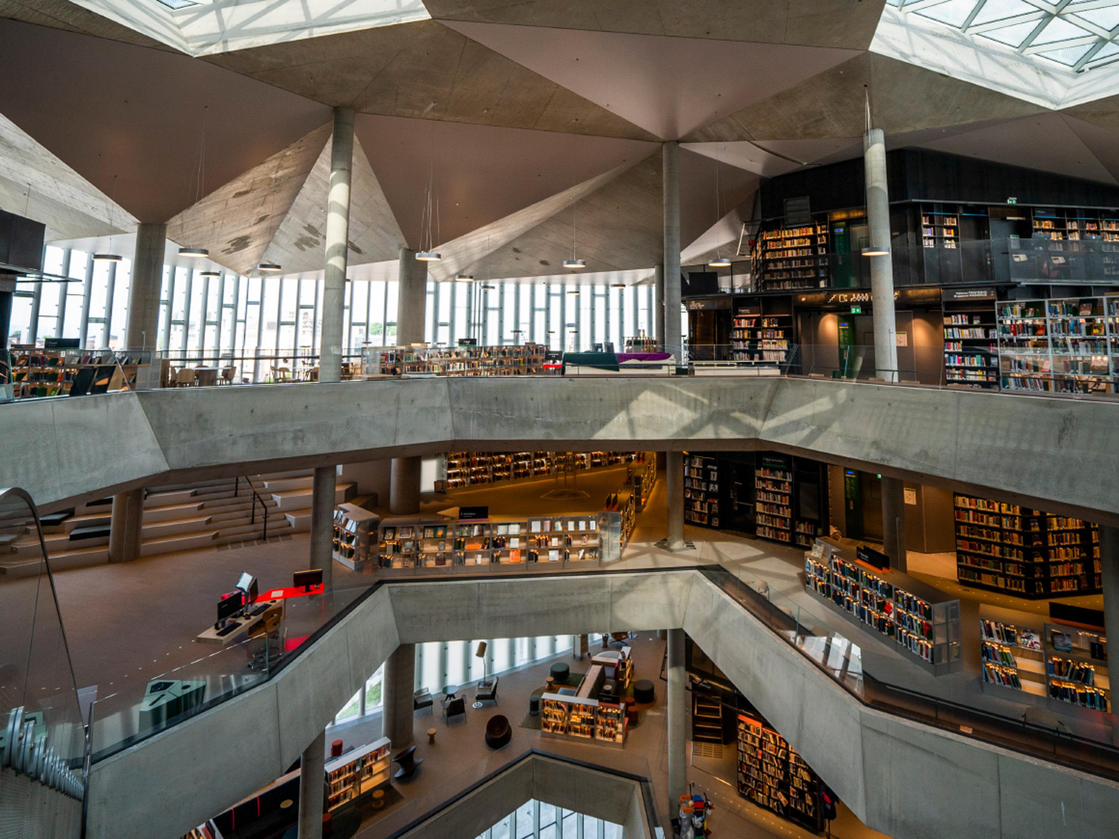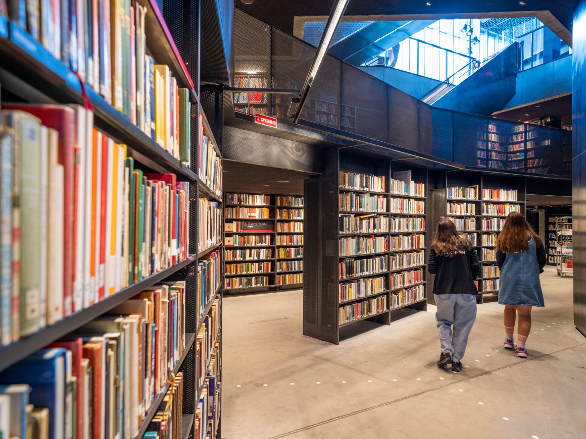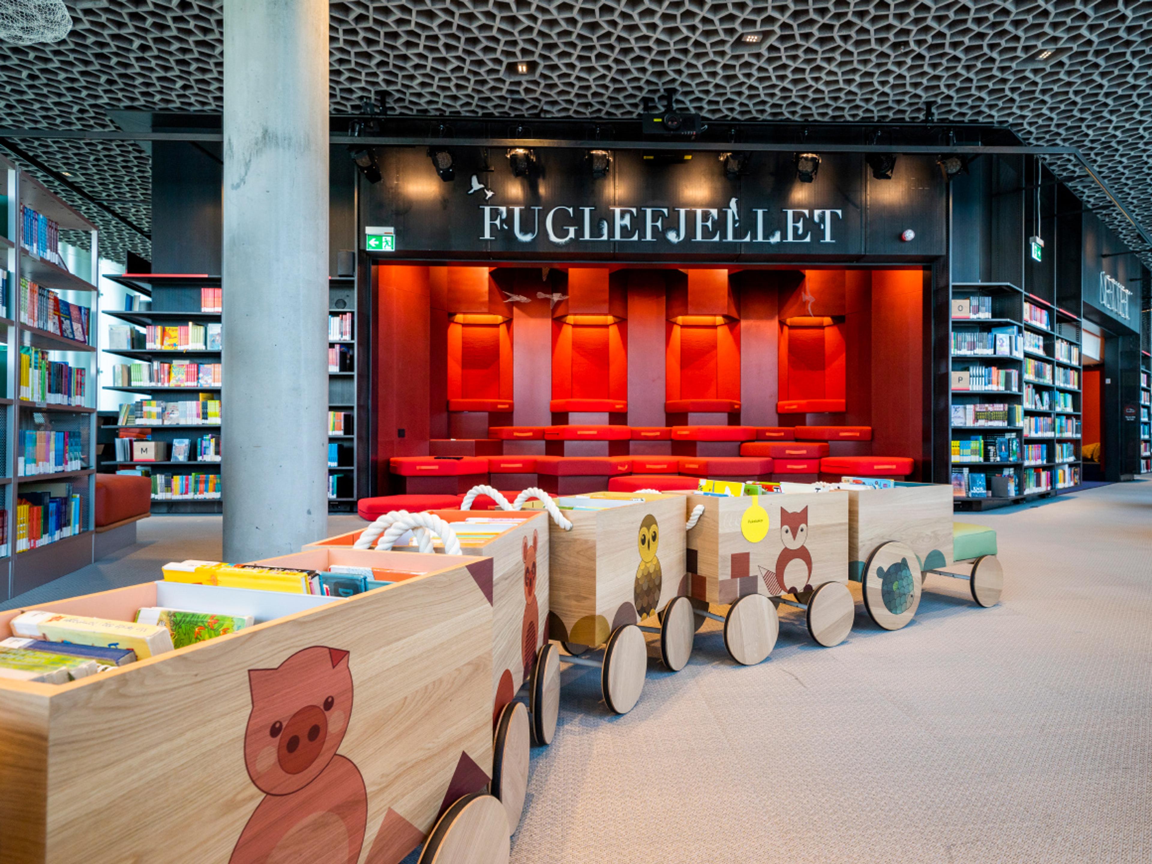 I underetasjen kan du gå på kino eller utforske bibliotekets rikholdige magasin. Andre etasje byr på generell skjønnlitteratur for store og små, mens musikk, film, tegneserier, spill og fabelprosa møter publikum i tredje. Et stort utvalg faglitteratur finnes i fjerde og femte etasje.