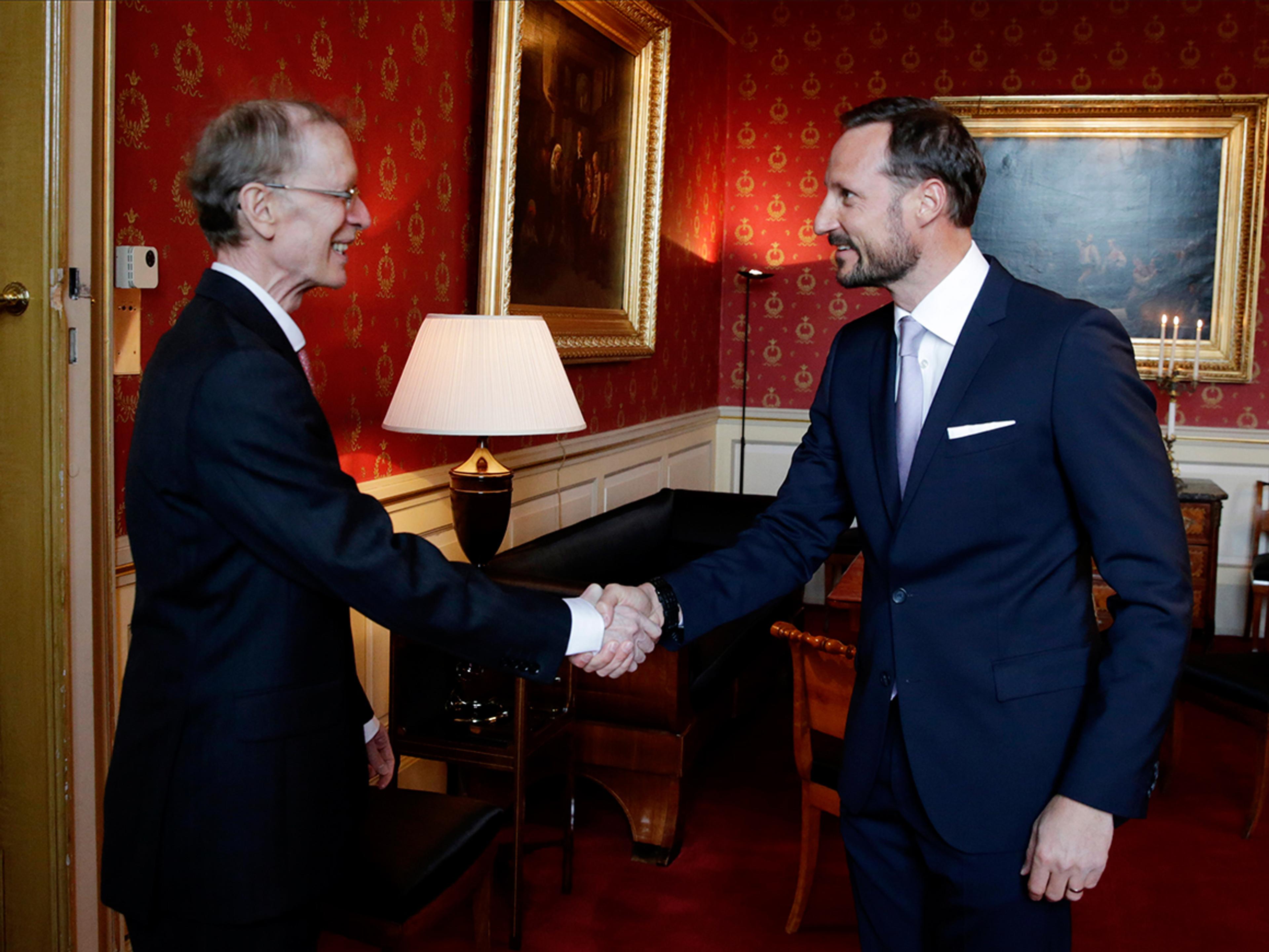 Kronprins Haakon tar i mot prisvinneren i audiens på Slottet før den høytidelige prisutdelingen i Universitetets aula i Oslo.