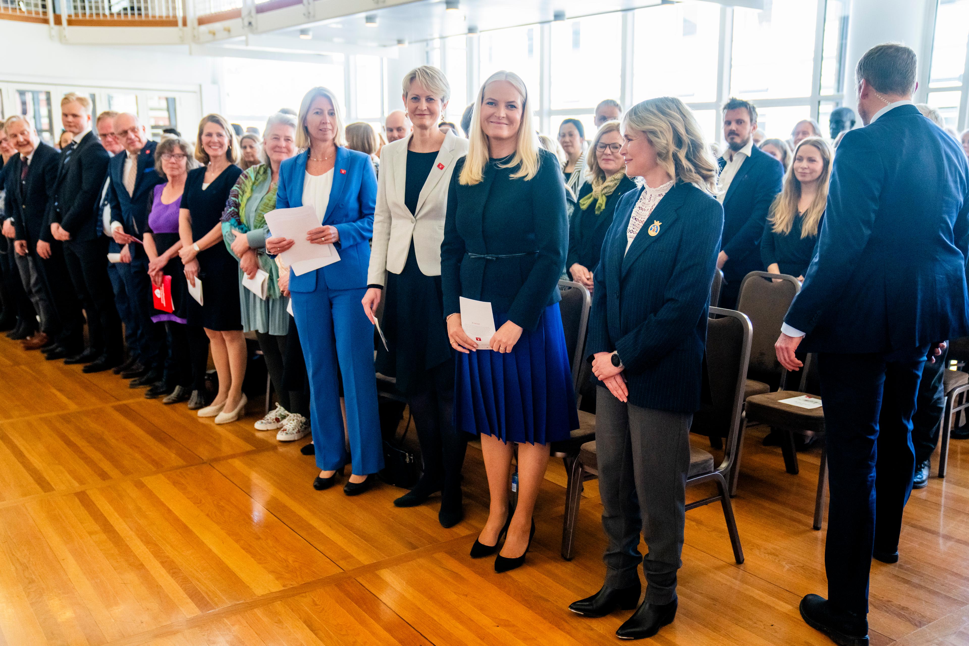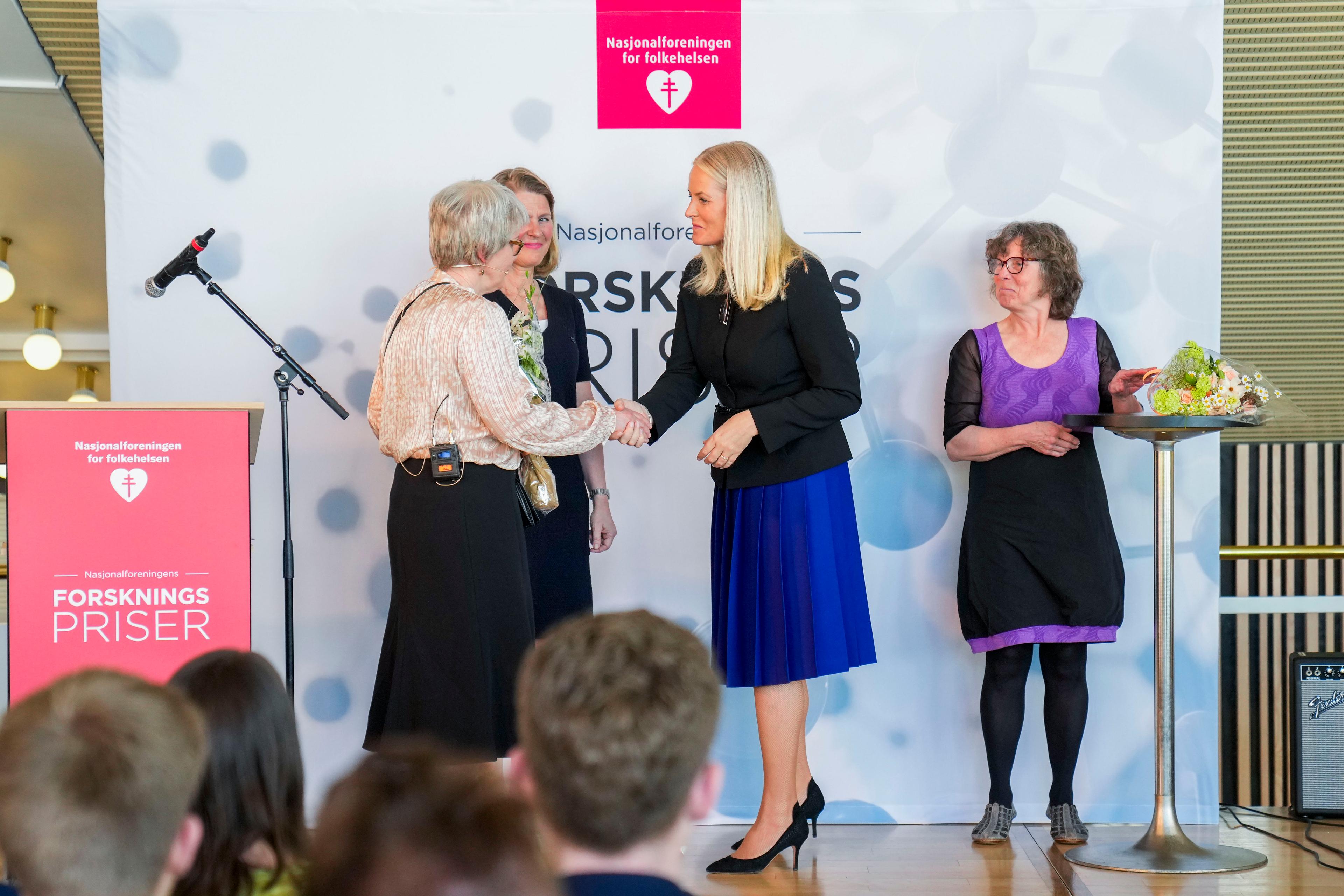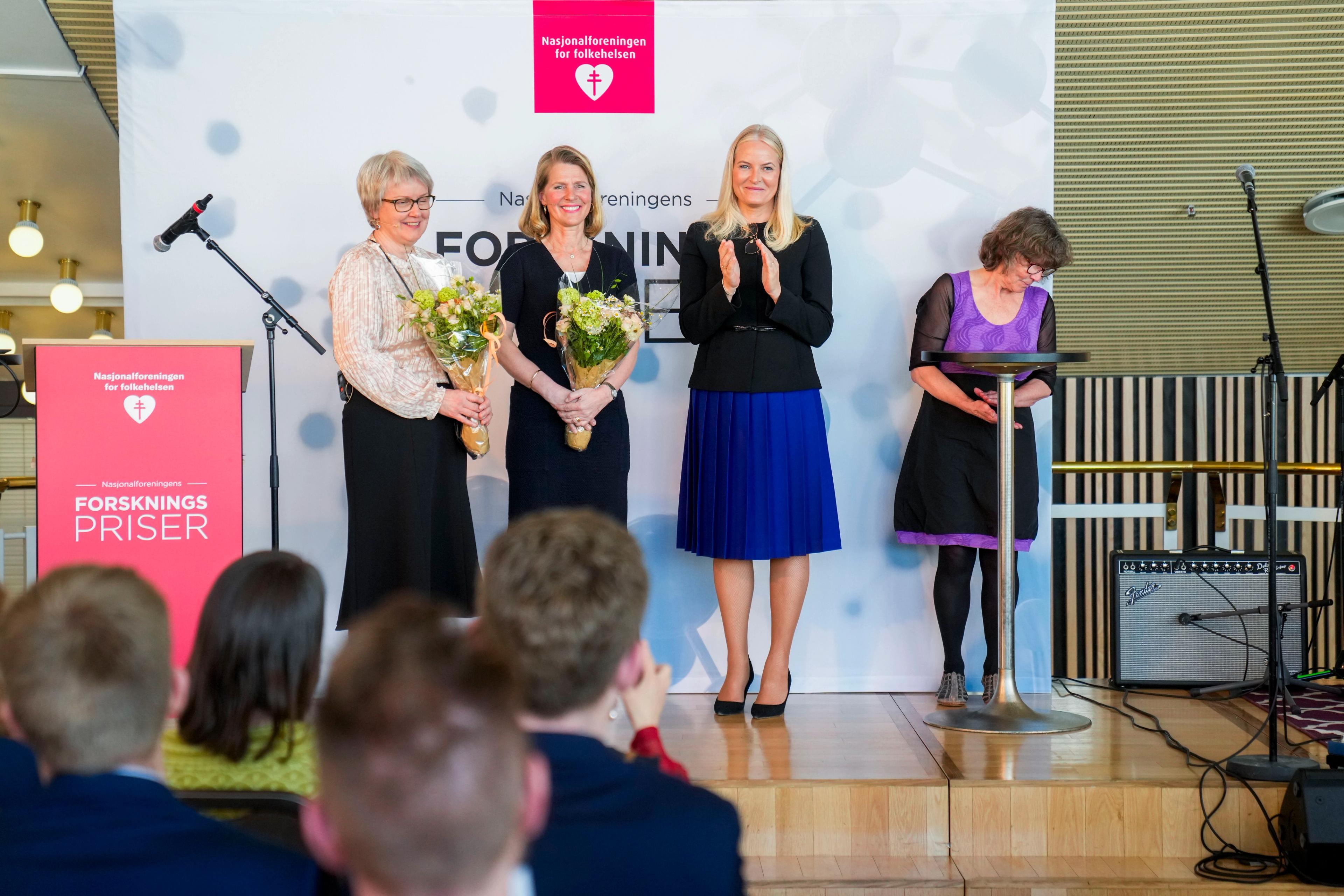 Professorane Kristina Haugaa og Ingvild Saltvedt fekk Nasjonalforeningen for folkehelsen sine forskingsprisar for 2024. Den Høgvørde Kronprinsesse Mette-Marit overrekte prisane på vegner av organisasjonen.
