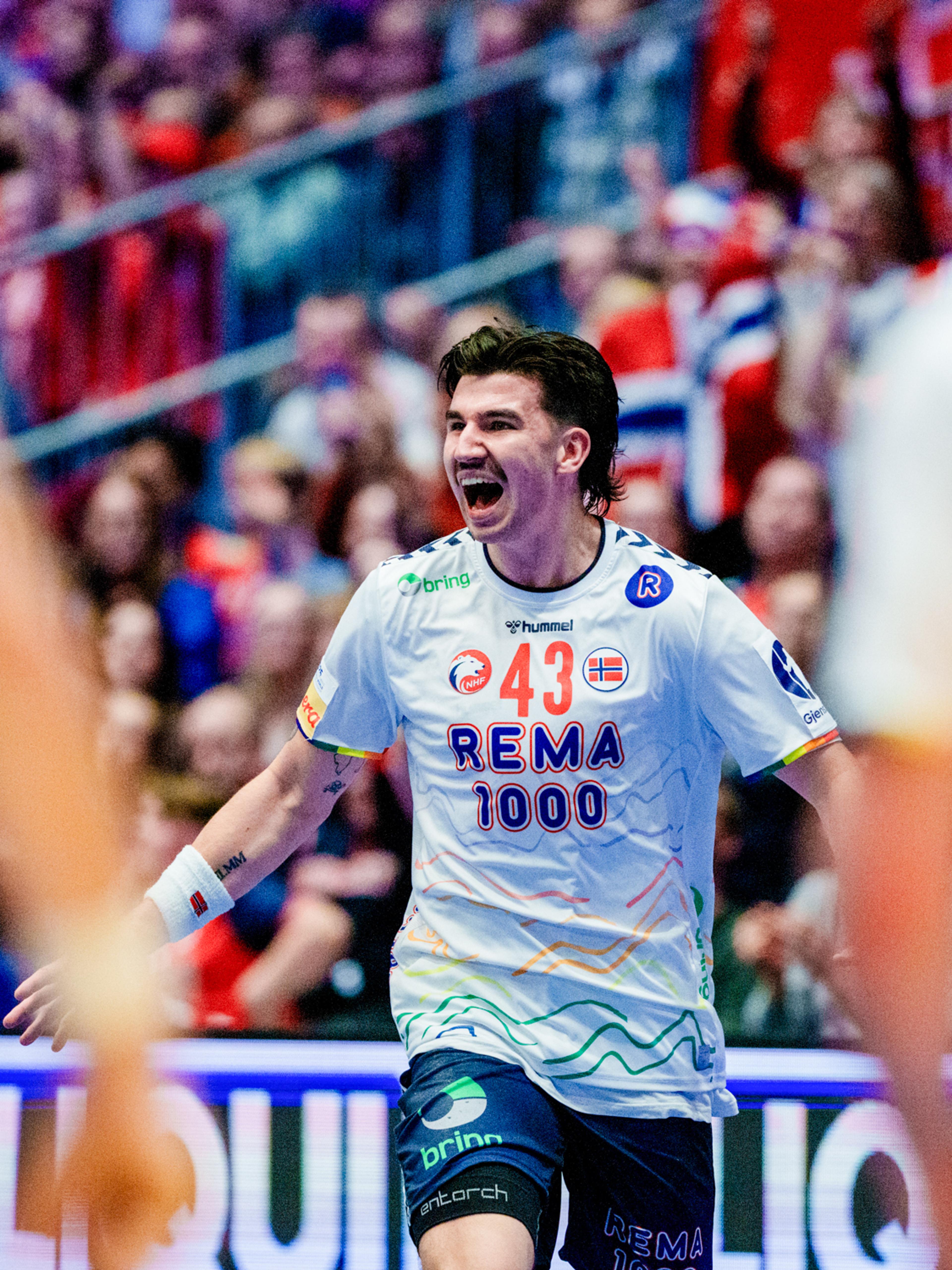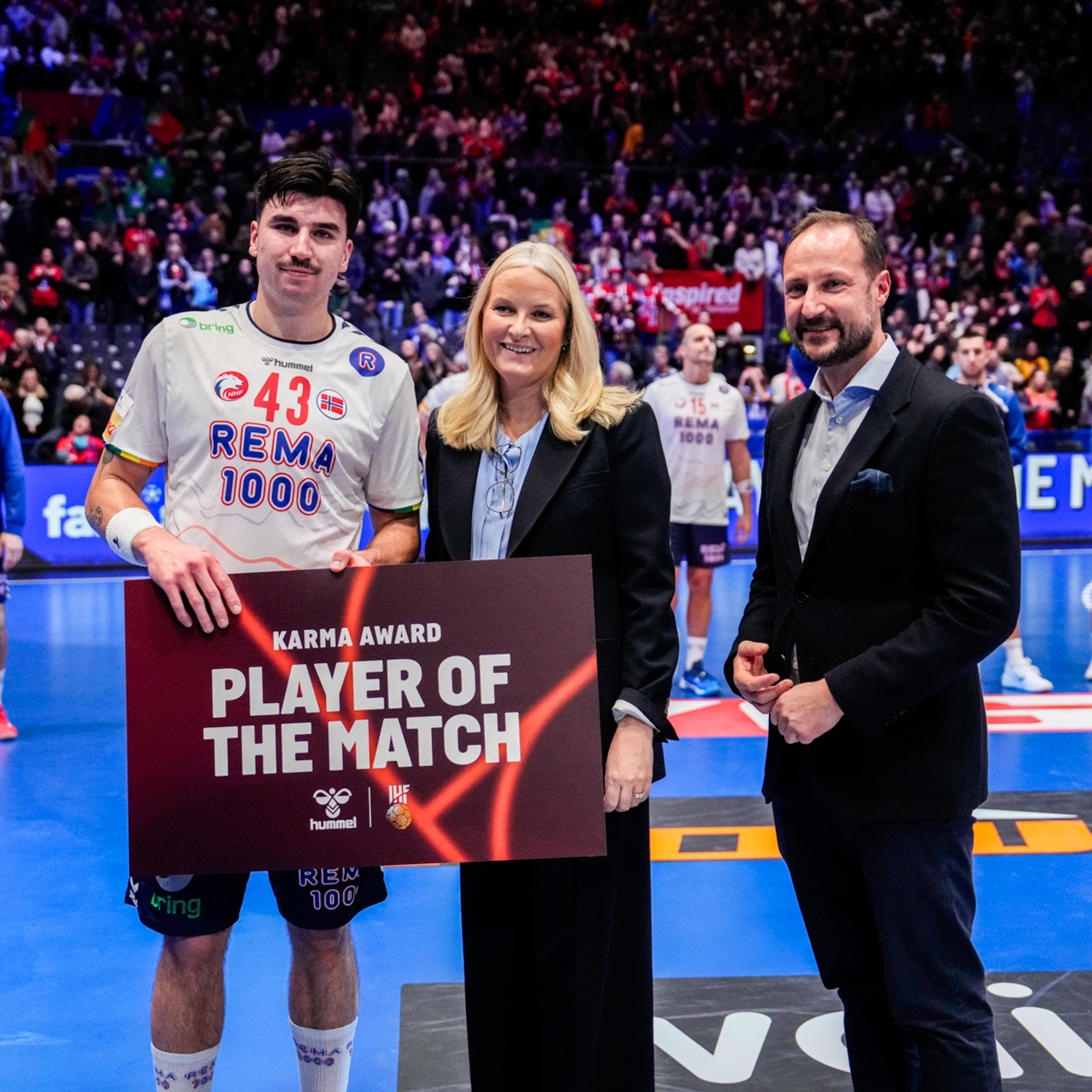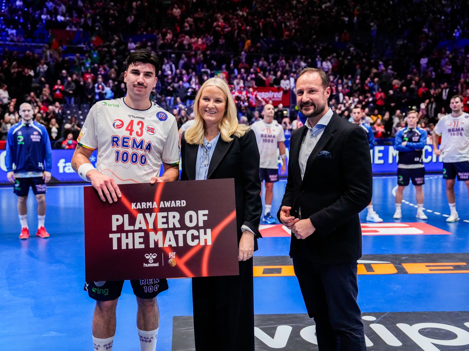 Kronprinsparet delte ut prisen til beste spelar i kampen, Simen Lyse, i Noregs siste gruppespelskamp i handball-VM på heimebane.