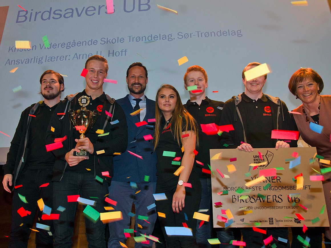 Hans Kongelige Høyhet Kronprinsen delte ut EM-billett og førstepris til ungdomsbedriften Birdsavers UB i dag. I sommer skal de unge skaperne fra Trondheim representere Norge med en løsning som skal hindre at fugler dør i vindmøller.