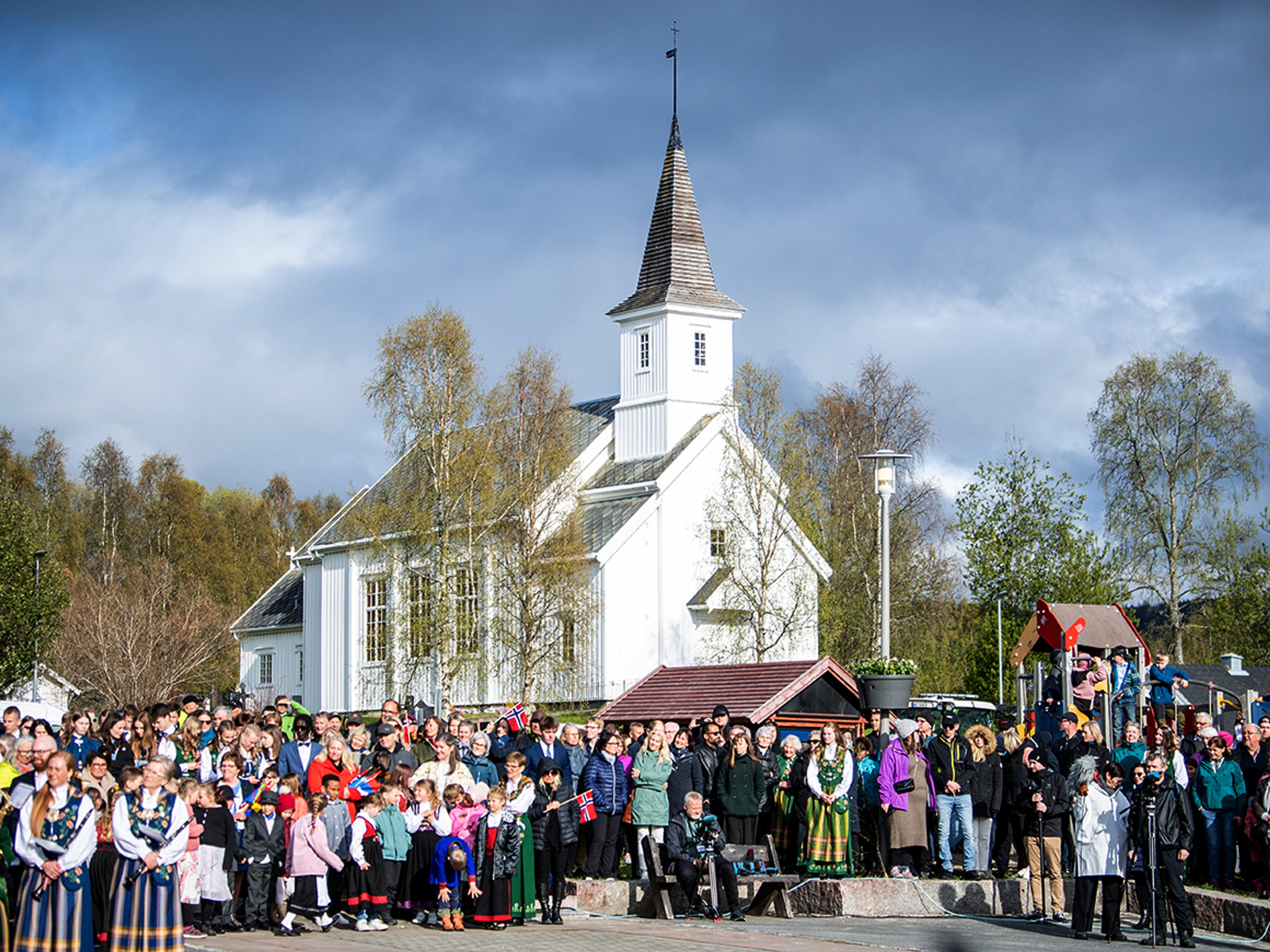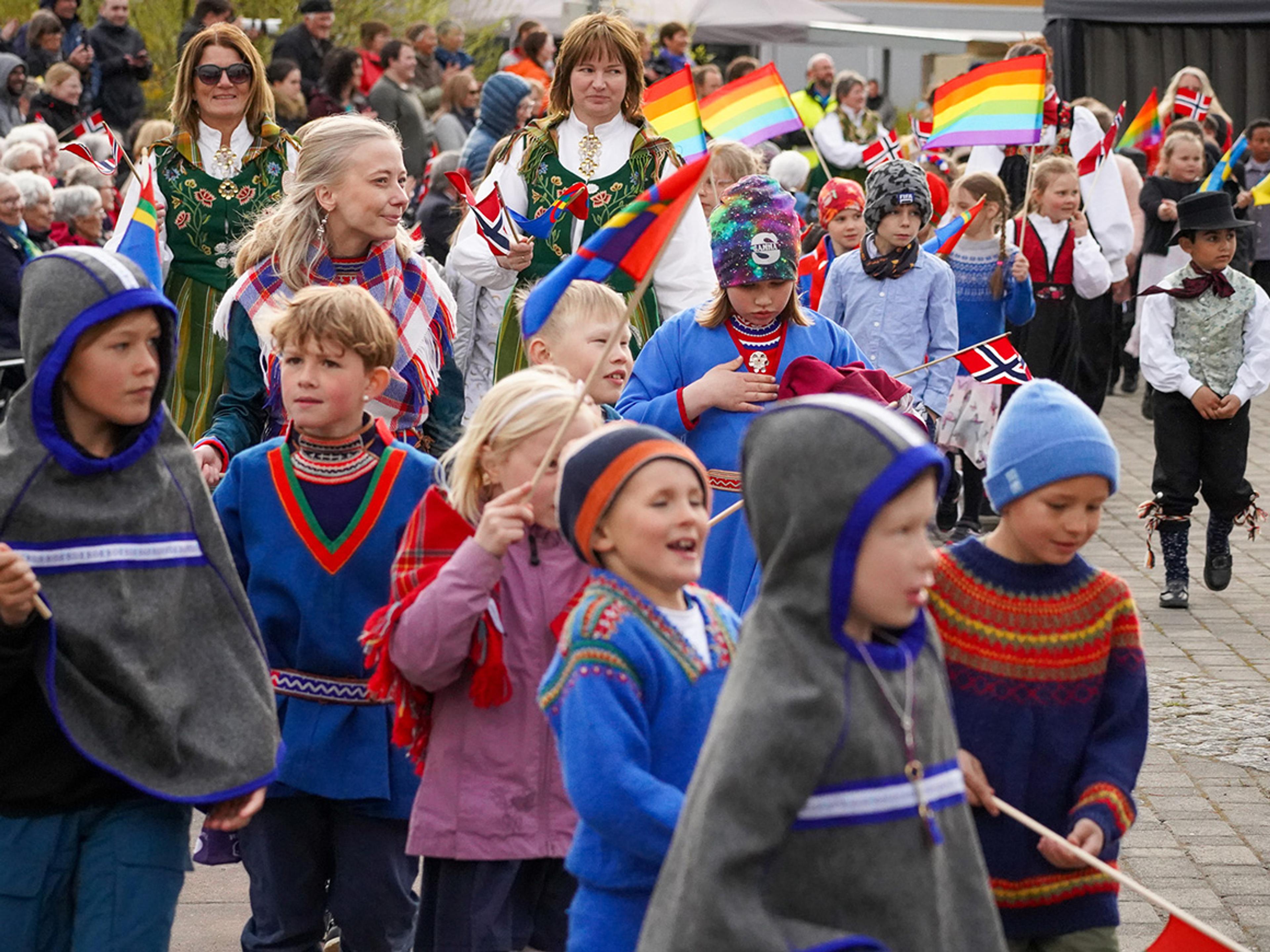 Det var et vakkert syn da barnehagebarn og elever i småskolen gikk parade forbi Kongeparet, med norske, samiske og mange andre flagg, for å gjøre sin versjon av barnetoget i Oslo 17. mai. Programmet i Hattfjelldal bød også på en mangfoldig musikalsk opplevelse – fra gammeldans til joik.