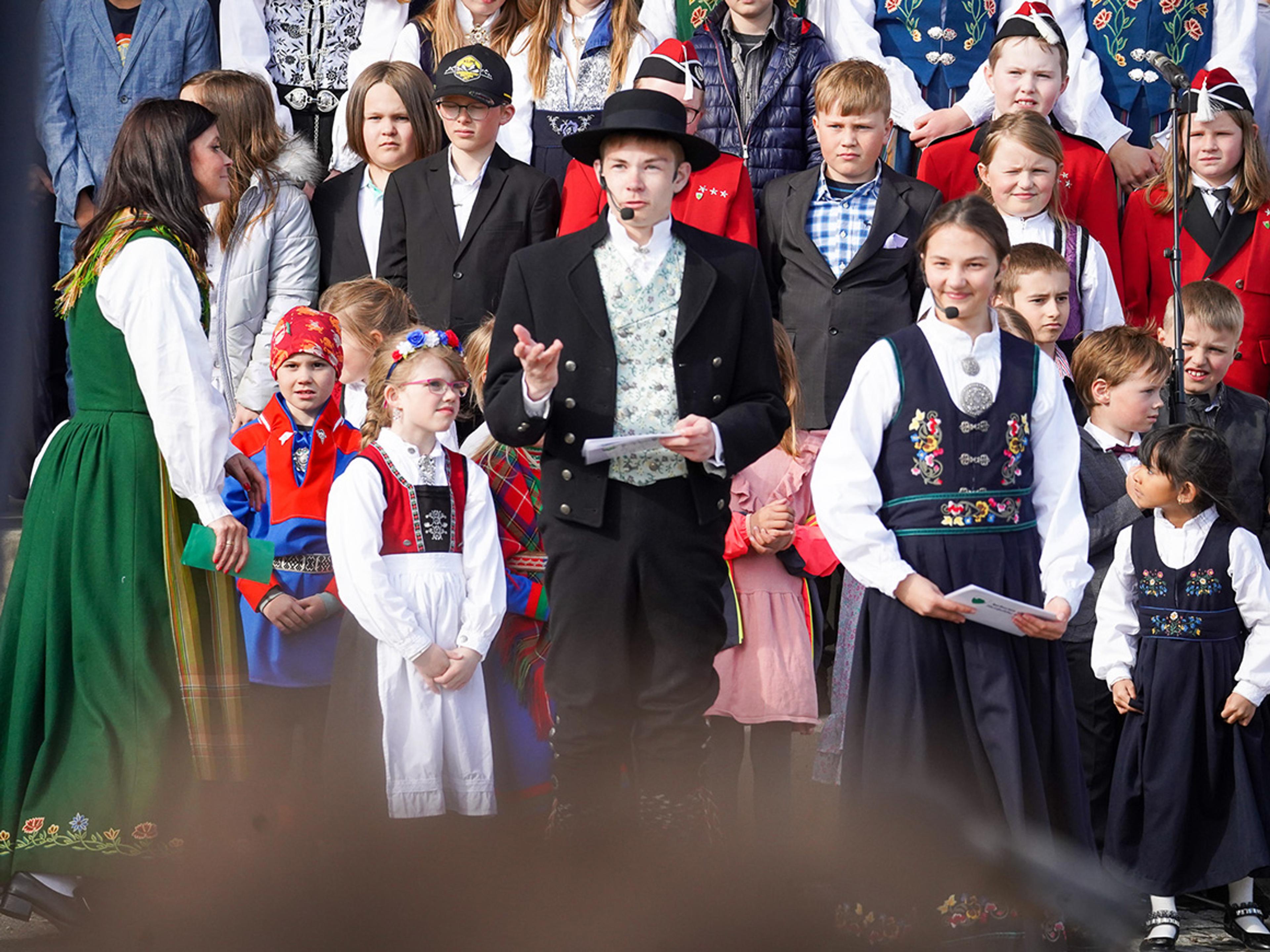 De 105 elevene på Hattfjelldal skole fremførte den sørsamiske barnesangen "Akte-Gøøkte-Golme", på norsk "En-to-tre", da Kongeparet hadde ankommet sceneområdet i Hattfjelldal. Konferansierene Solrid Svarto (14) og Amund Sjåvik (15) ønsket alle velkommen: Buerie båeteme!