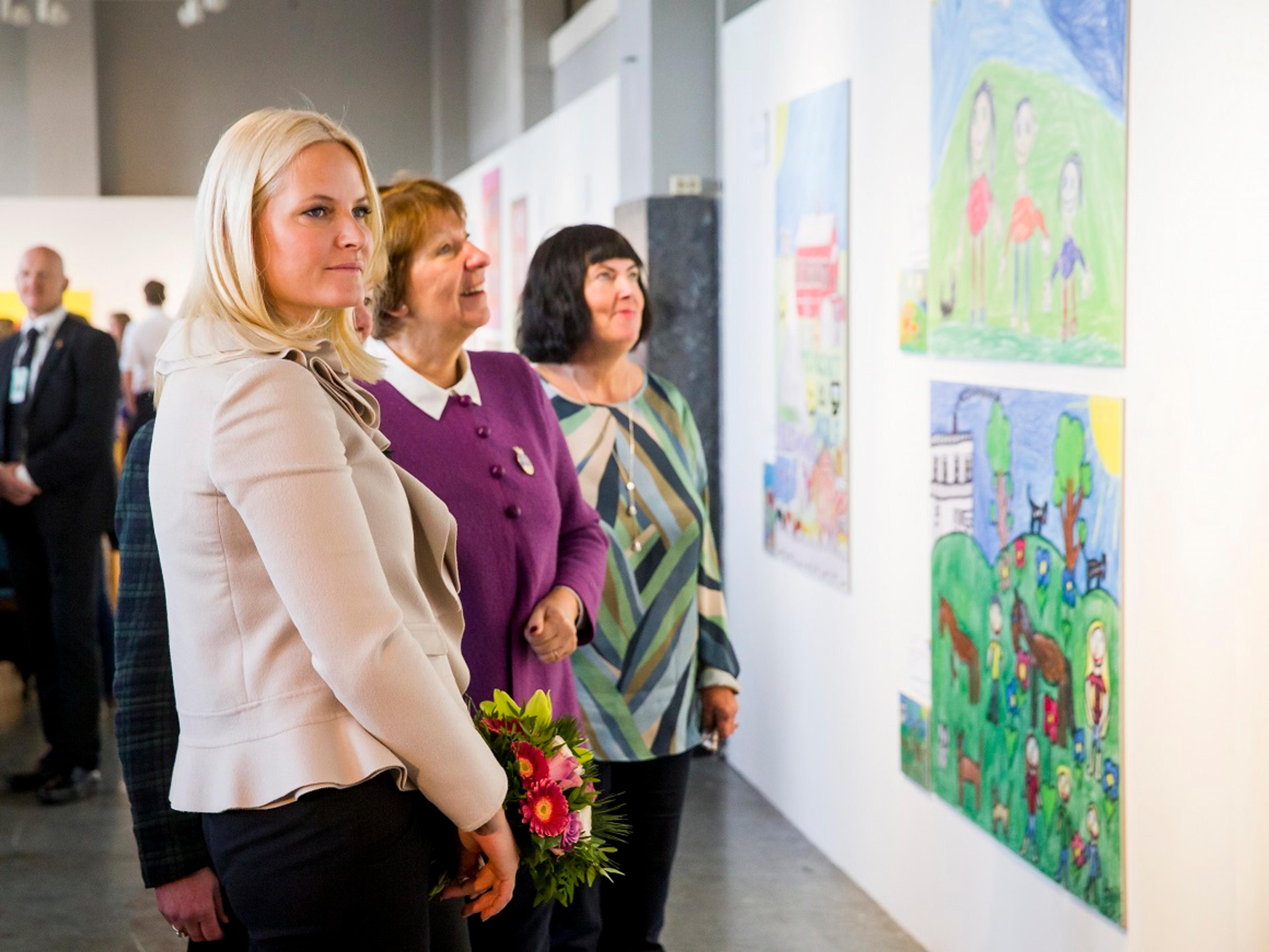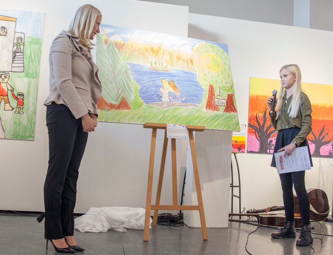 H.K.H. Kronprinsessa opna UNICEFs teikneutstilling «Dersom eg måtte flykte» i dag. Her har skoleelevar levd seg inn i flyktningars liv.