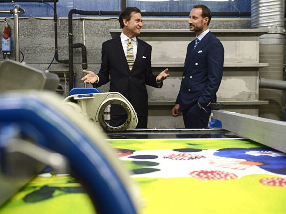 Kronprins Haakon besøkte hovedkvarteret i dag, der direktør Mika Ihamuotila blant annet viste Kronprinsen omkring i tekstiltrykkeriet. De stormønstrede tekstilene er et kjent trekk ved Marimekkos design.
