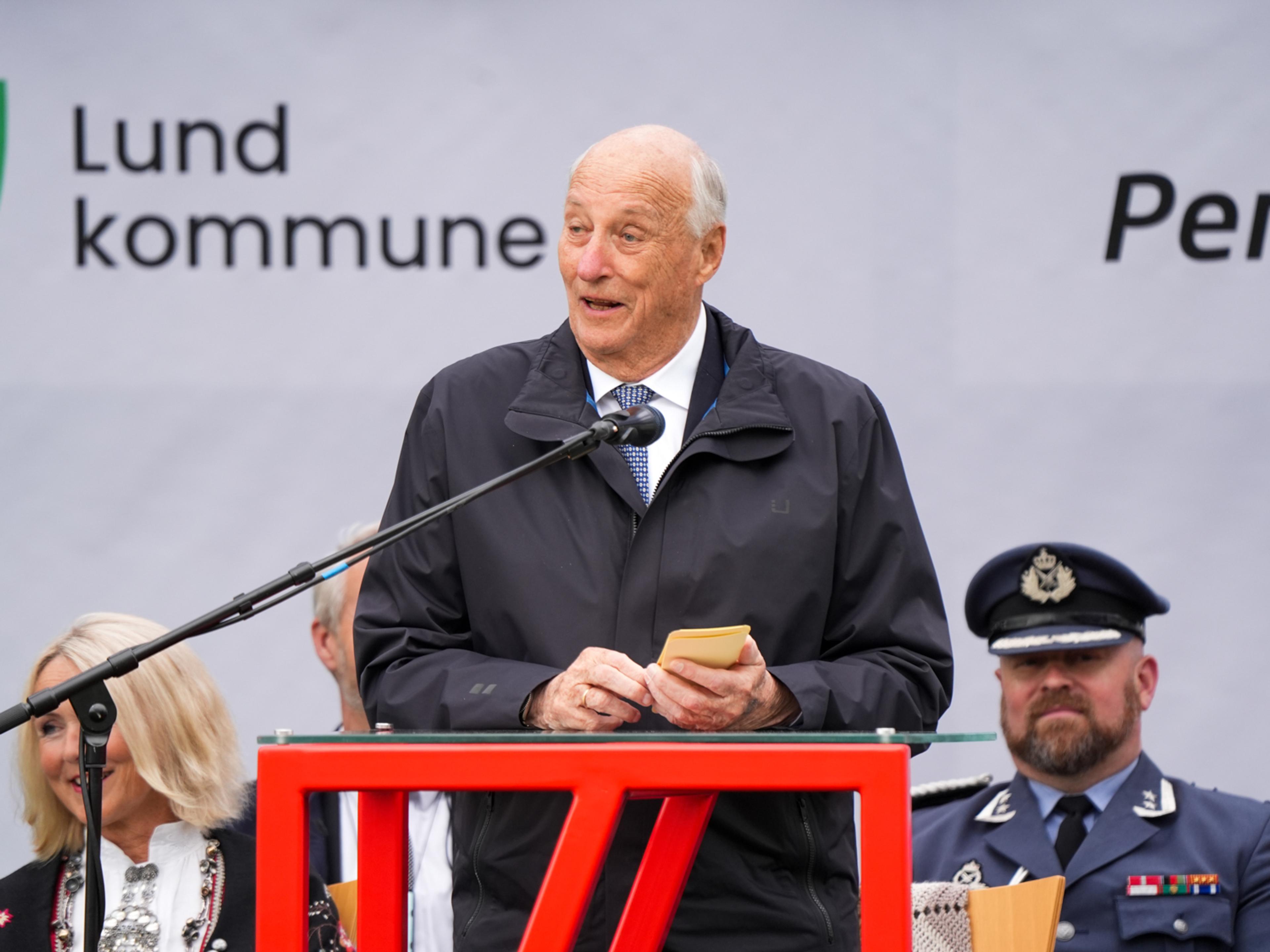 – Å reise på fylkestur er noe av det kjæreste og viktigste Dronningen og jeg gjør i vårt virke. Da får vi muligheten til å treffe noen av alle de flotte menneskene som bor i det langstrakte og mangfoldige landet vårt, sa Kong Harald i talen han holdt i Moi i Lund kommune.