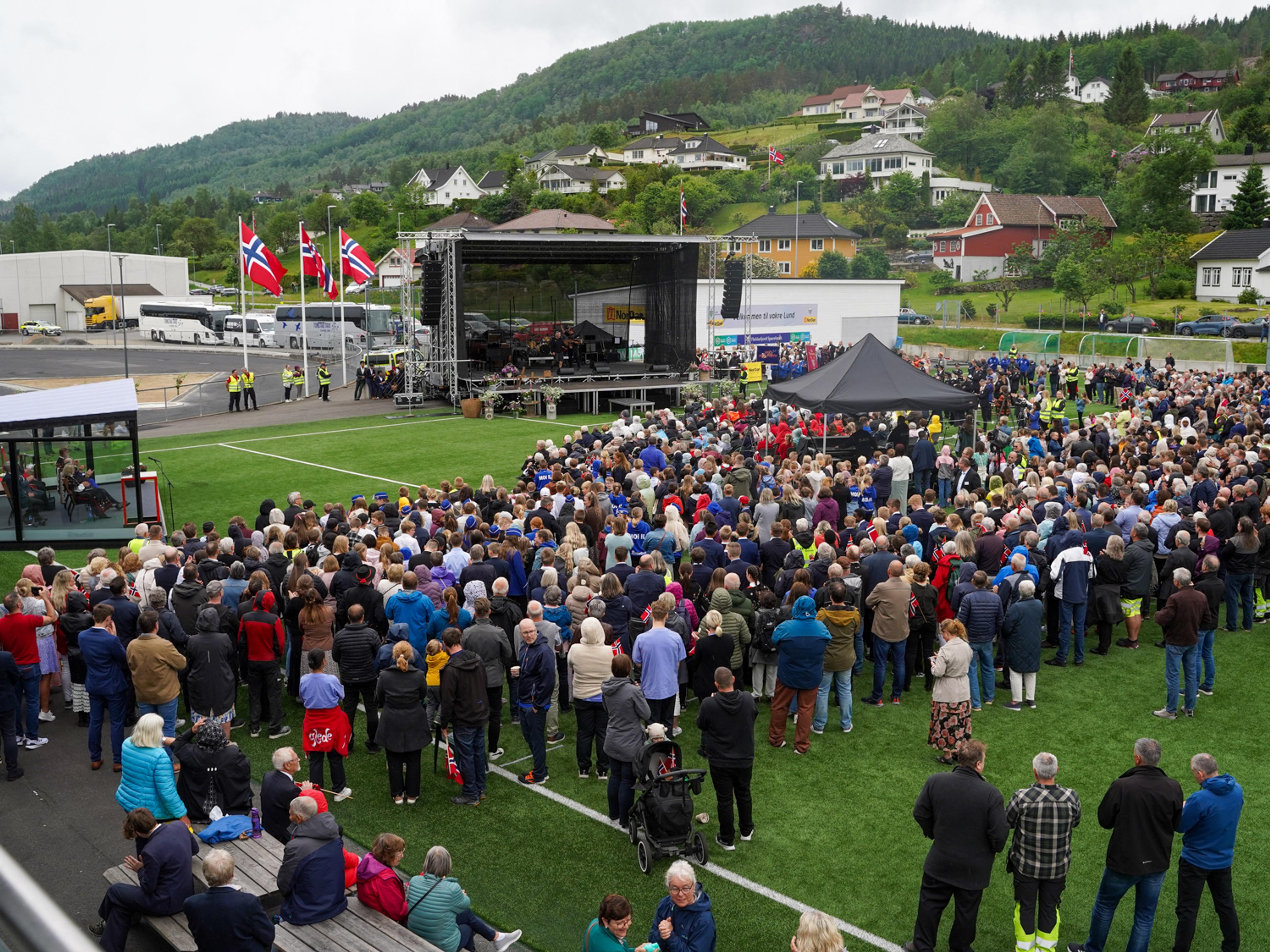 Arrangementet var lagt til idrettsanlegget til Moi IL. Kongeparet og publikum fikk oppleve humorinnslag ved Løyeblikk, turnoppvisning, barnekor, Lunds rike og lange historie fortalt gjennom karakterer og musikk i spennet mellom vakker duett fra Jeanne Haukland og Henrikke Østrem og lett rock fra Pettycash.