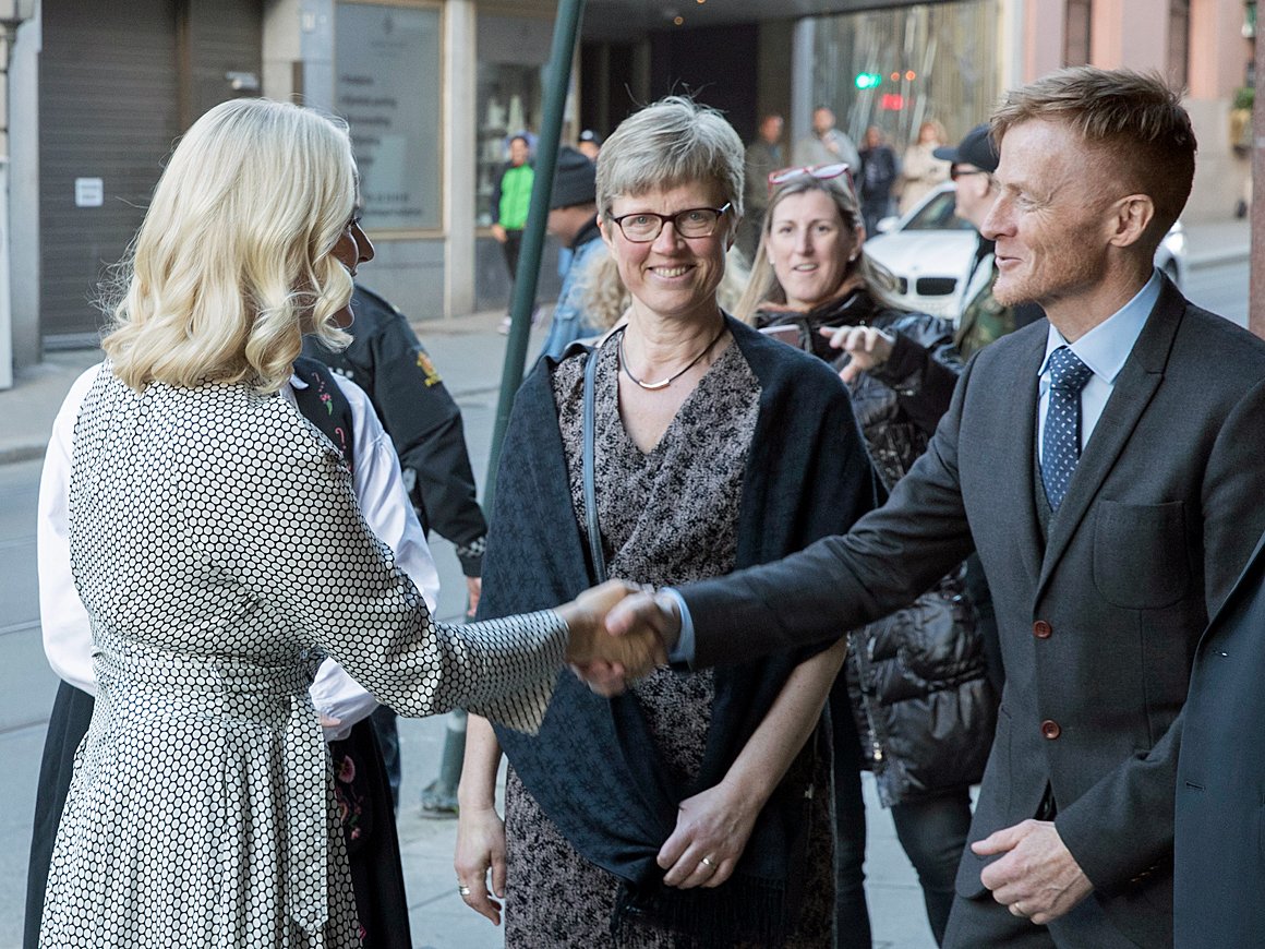 Den Høgvørde Kronprinsesse Mette-Marit var til stades under ei festframsyning i Det Norske Teatret i Oslo i kveld. Framsyninga var ein del av feiringa av 150-årsjubileet til forlaget.