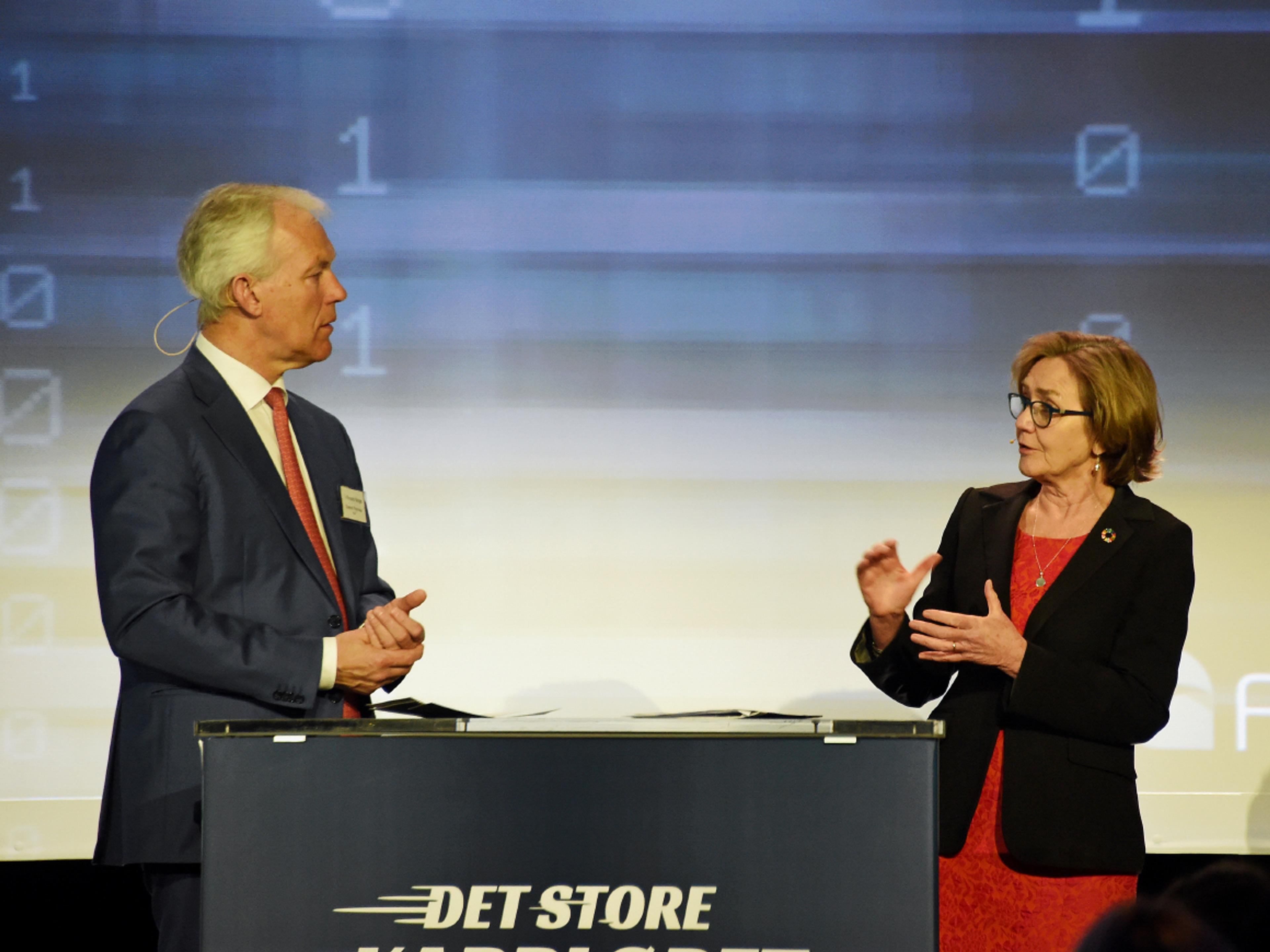 Etter foredraget var det en samtale om bærekraftig næringsliv mellom Courtier og KLP-sjef Sverre Thornes.