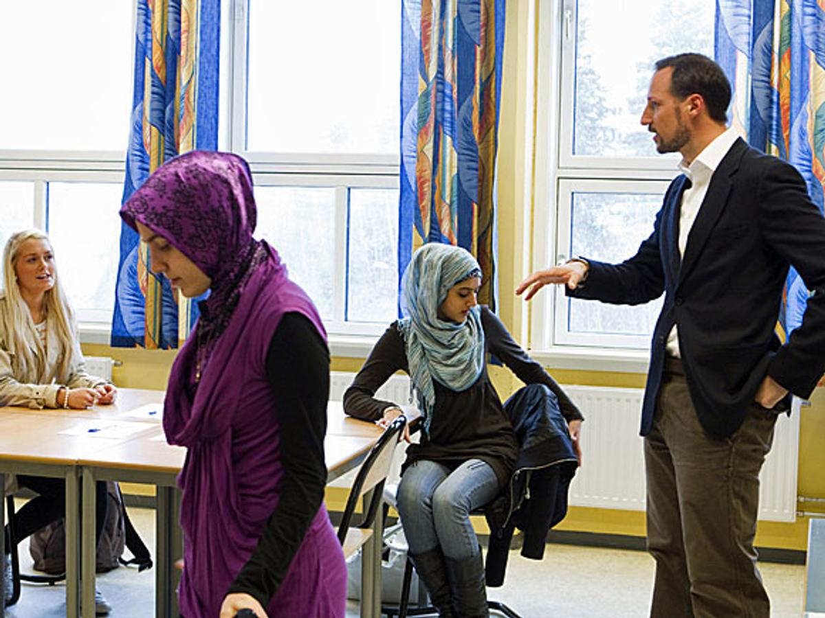 Etter en kort samling i gymsalen på skolen gikk elevene til klasserom hvor de arbeidet i grupper og delte verdighetshistorier med hverandre. Kronprinsen, lærere og frivillige fra Teaterrådet, Nansenskolen, Røde Kors og Idrettsforbundet deltok som veiledere og diskusjonspartnere.