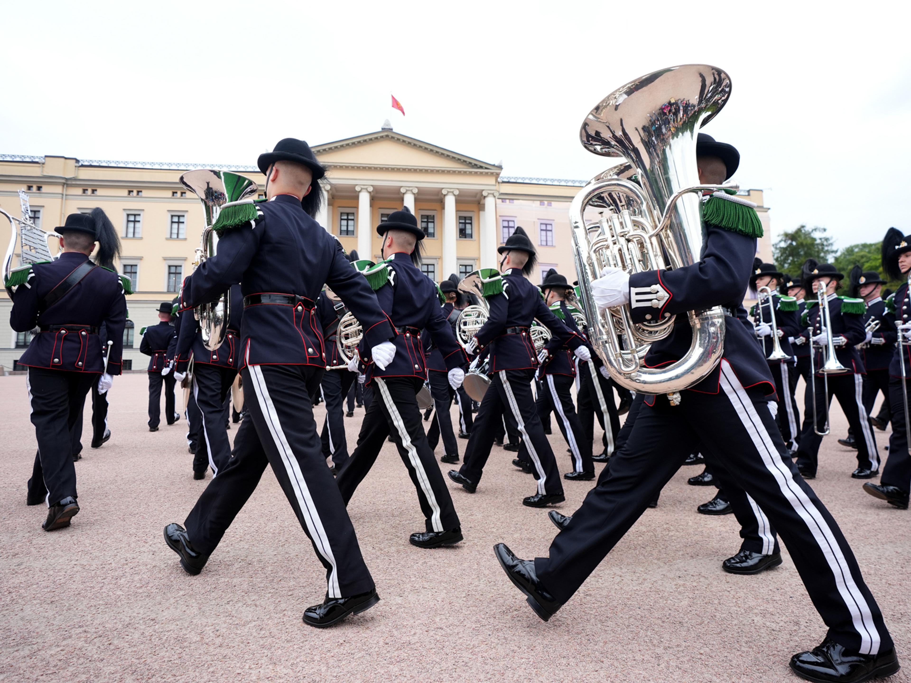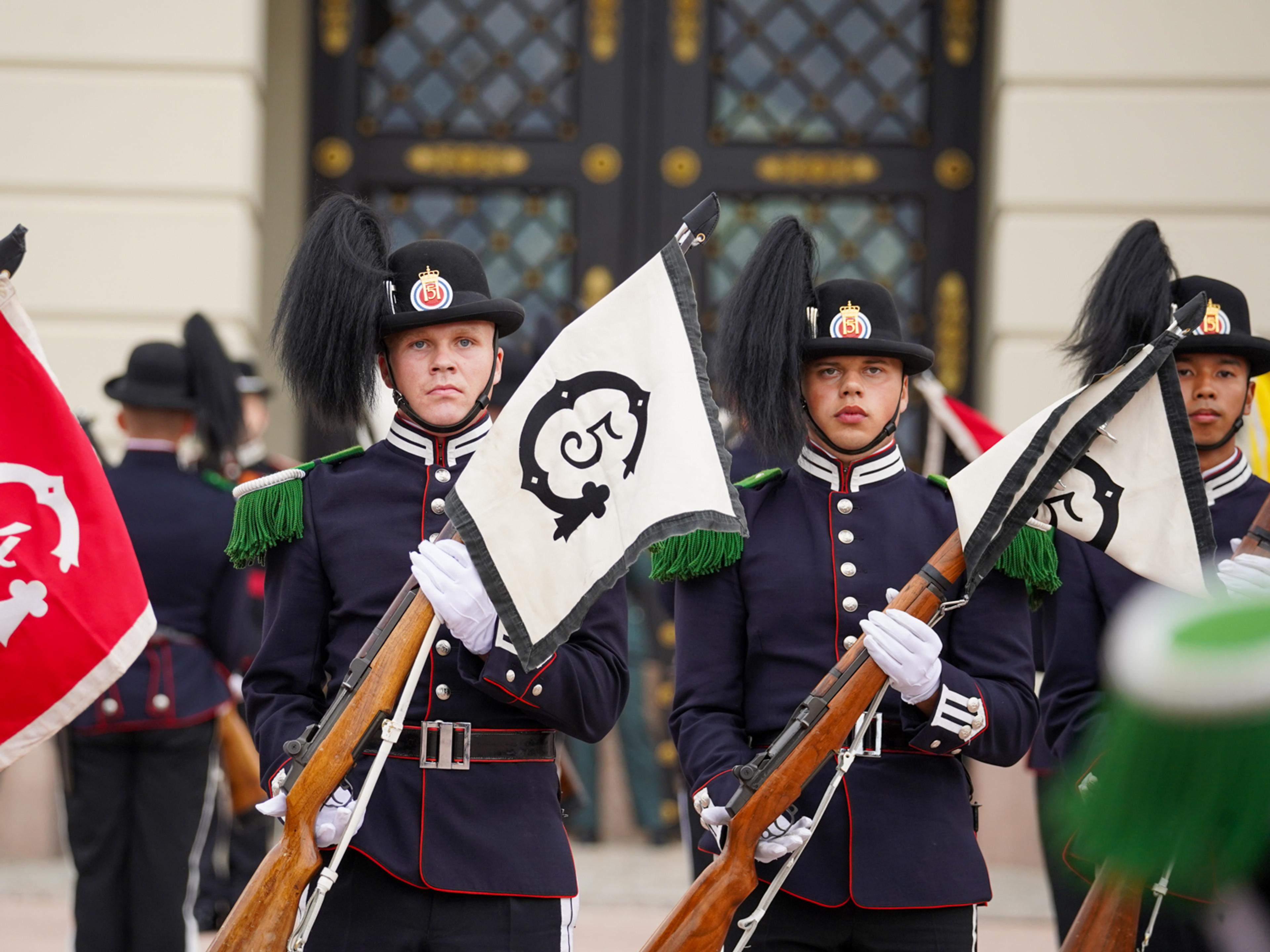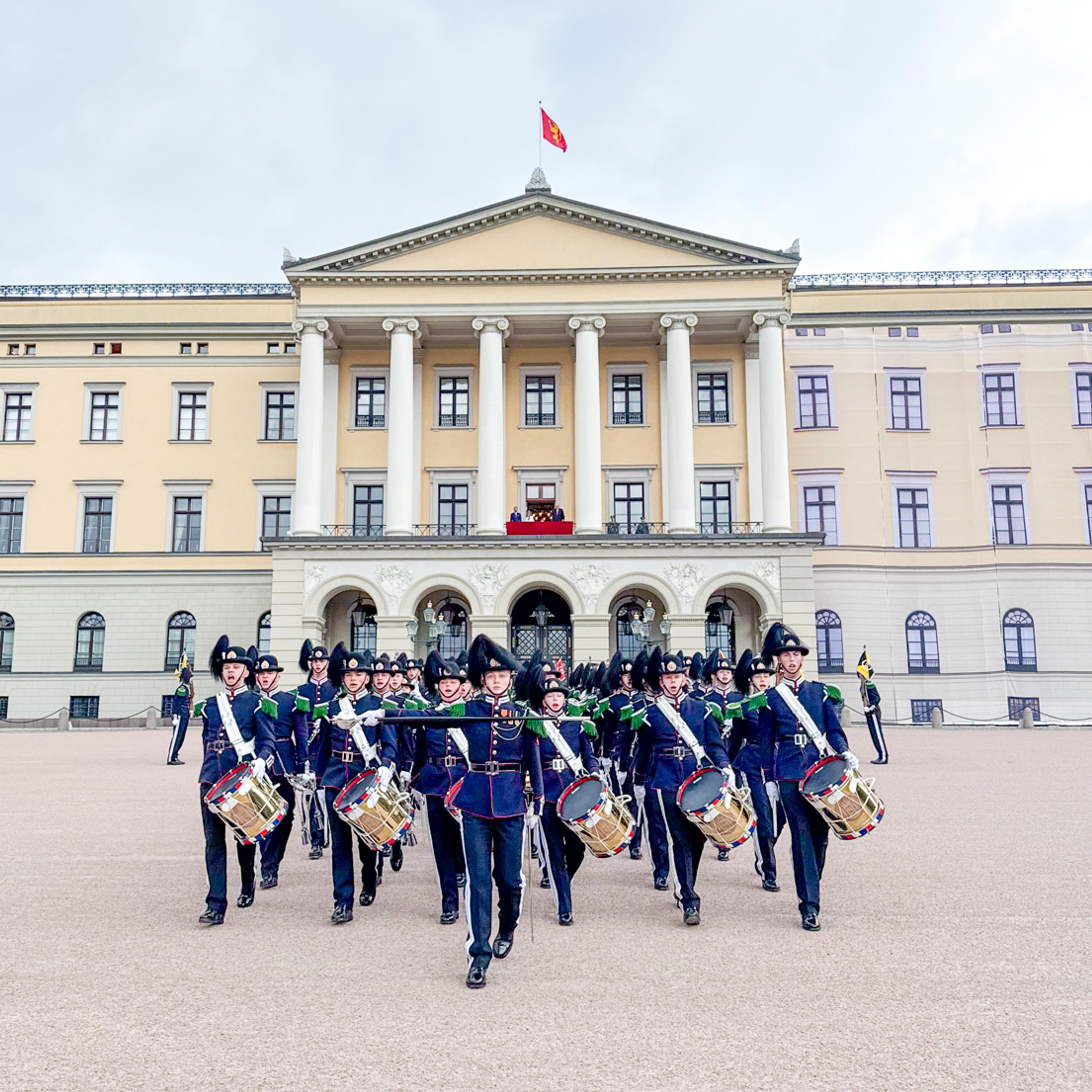 I sommar har musikk- og drilltroppen i Hans Majestet Kongens Garde hatt drilloppvisingar for publikum framfor Slottet. I dag var Hans Majestet Kongen, Hennar Majestet Dronninga og Den Høgvørde Kronprinsen på plass på Slottsbalkongen for å sjå oppvisinga.