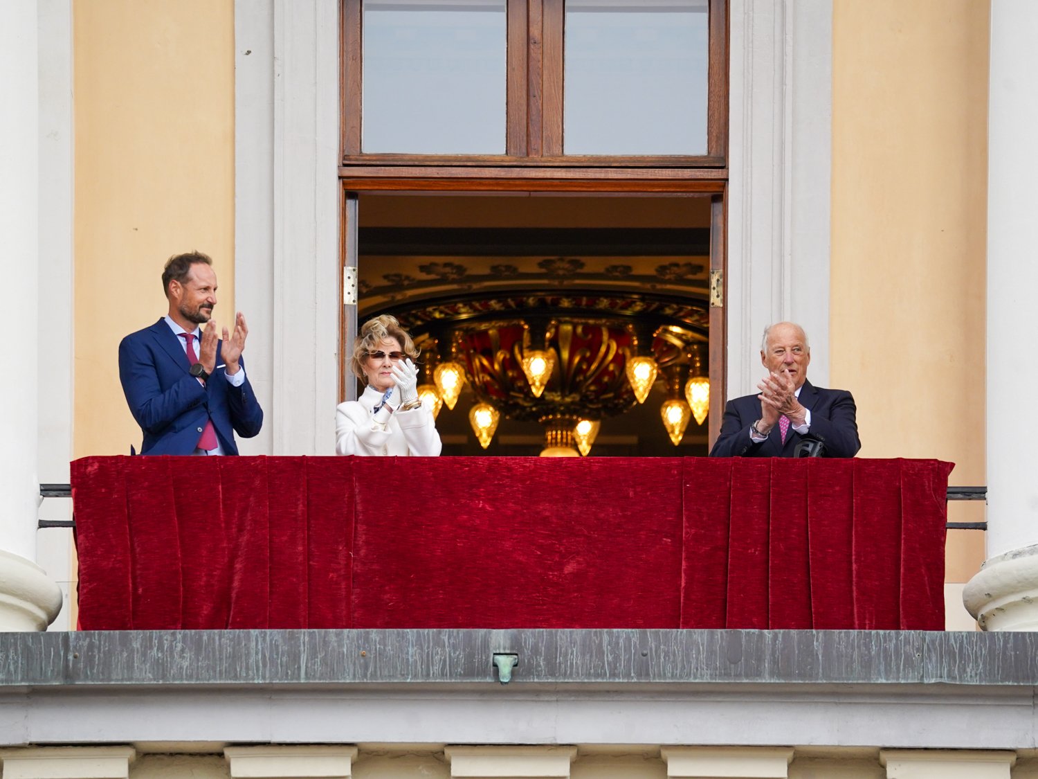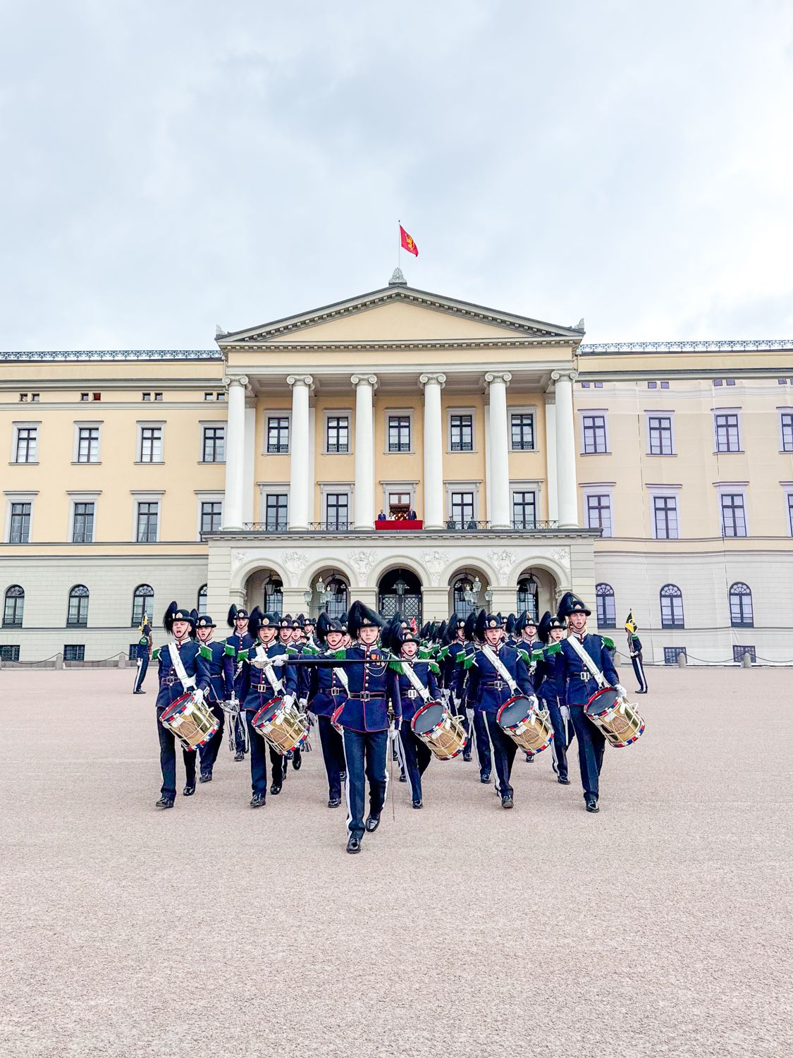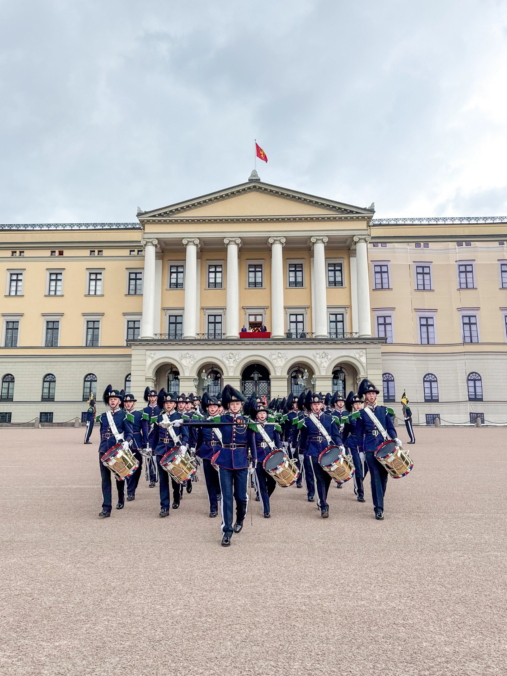 I sommar har musikk- og drilltroppen i Hans Majestet Kongens Garde hatt drilloppvisingar for publikum framfor Slottet. I dag var Hans Majestet Kongen, Hennar Majestet Dronninga og Den Høgvørde Kronprinsen på plass på Slottsbalkongen for å sjå oppvisinga.