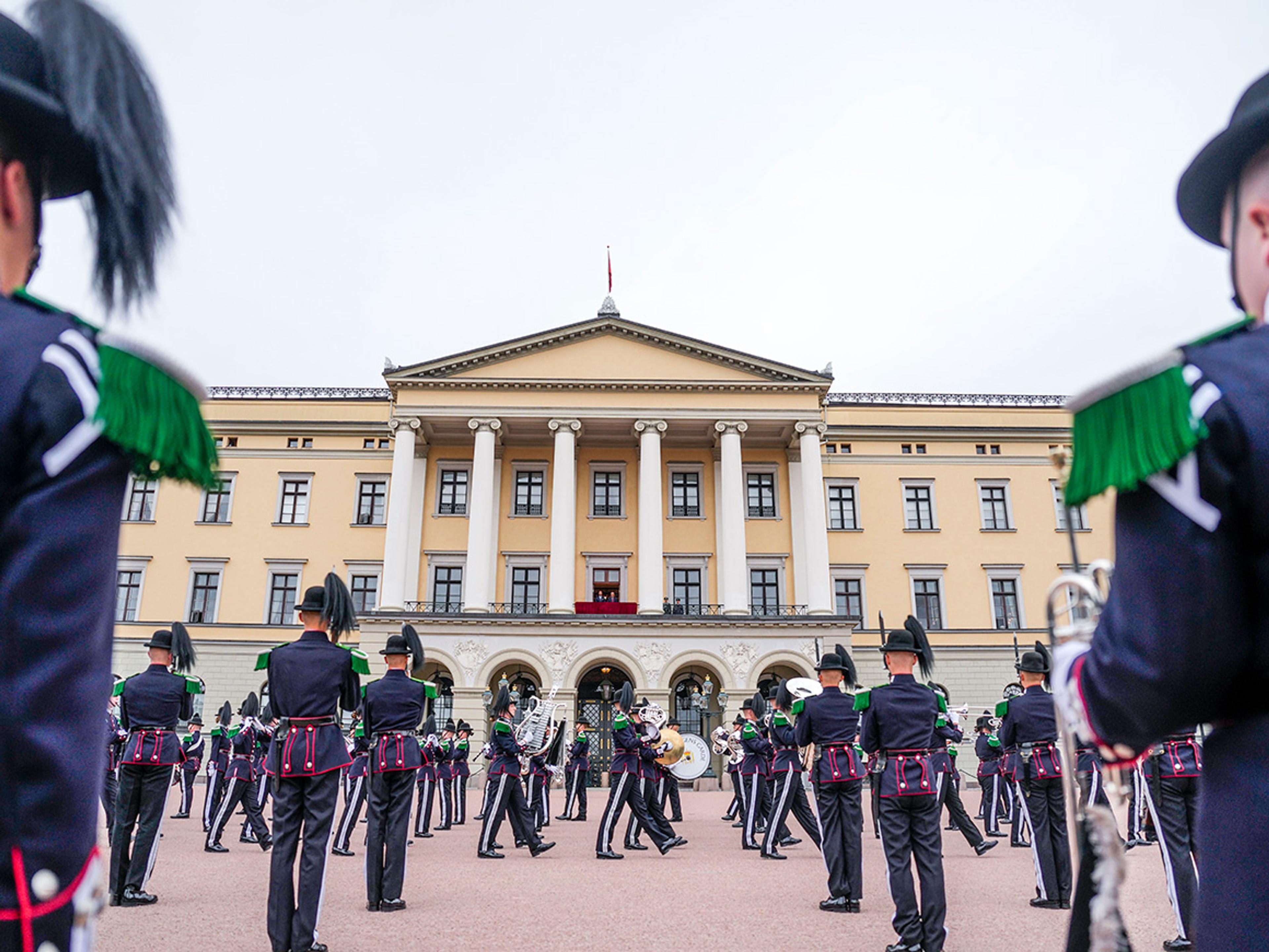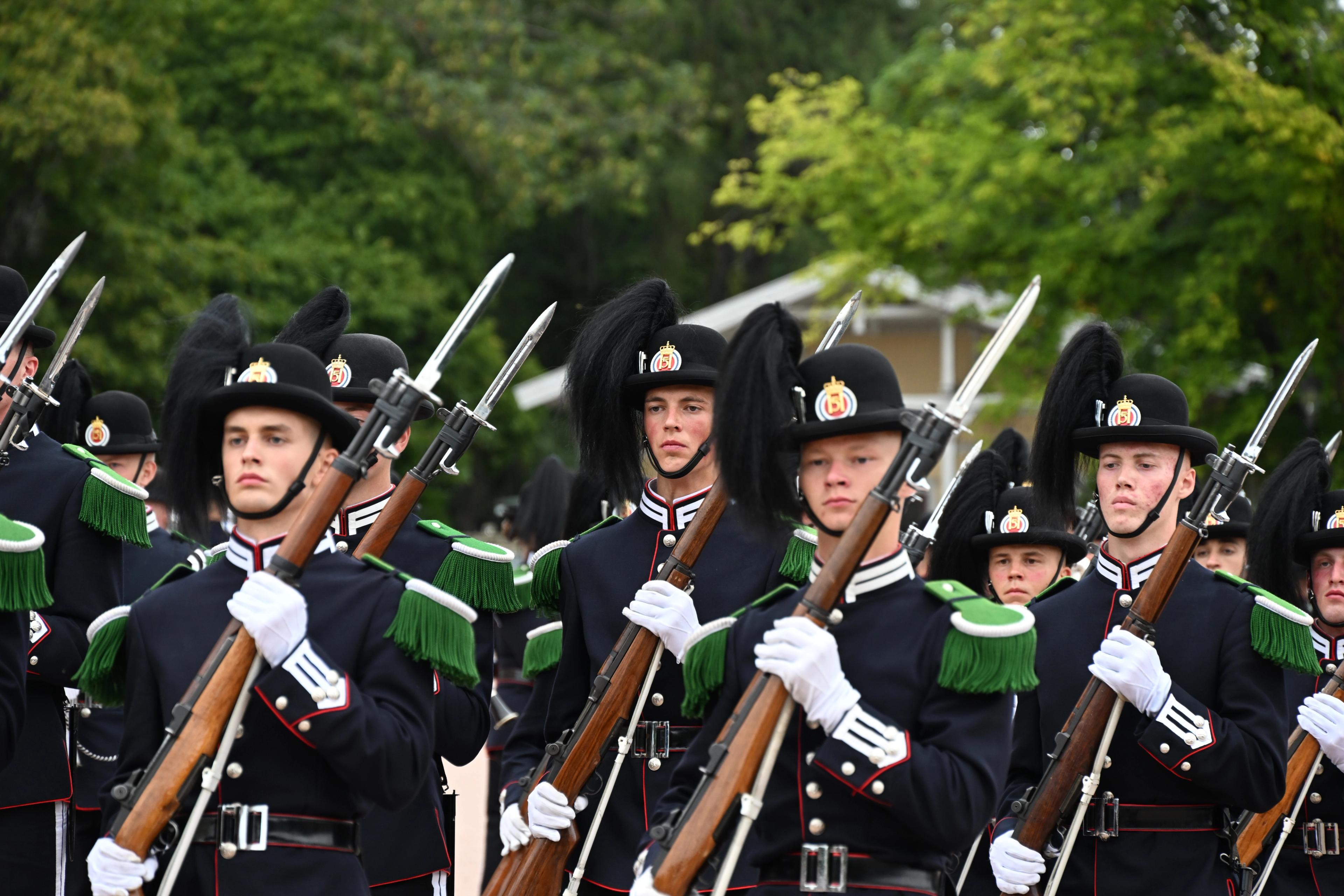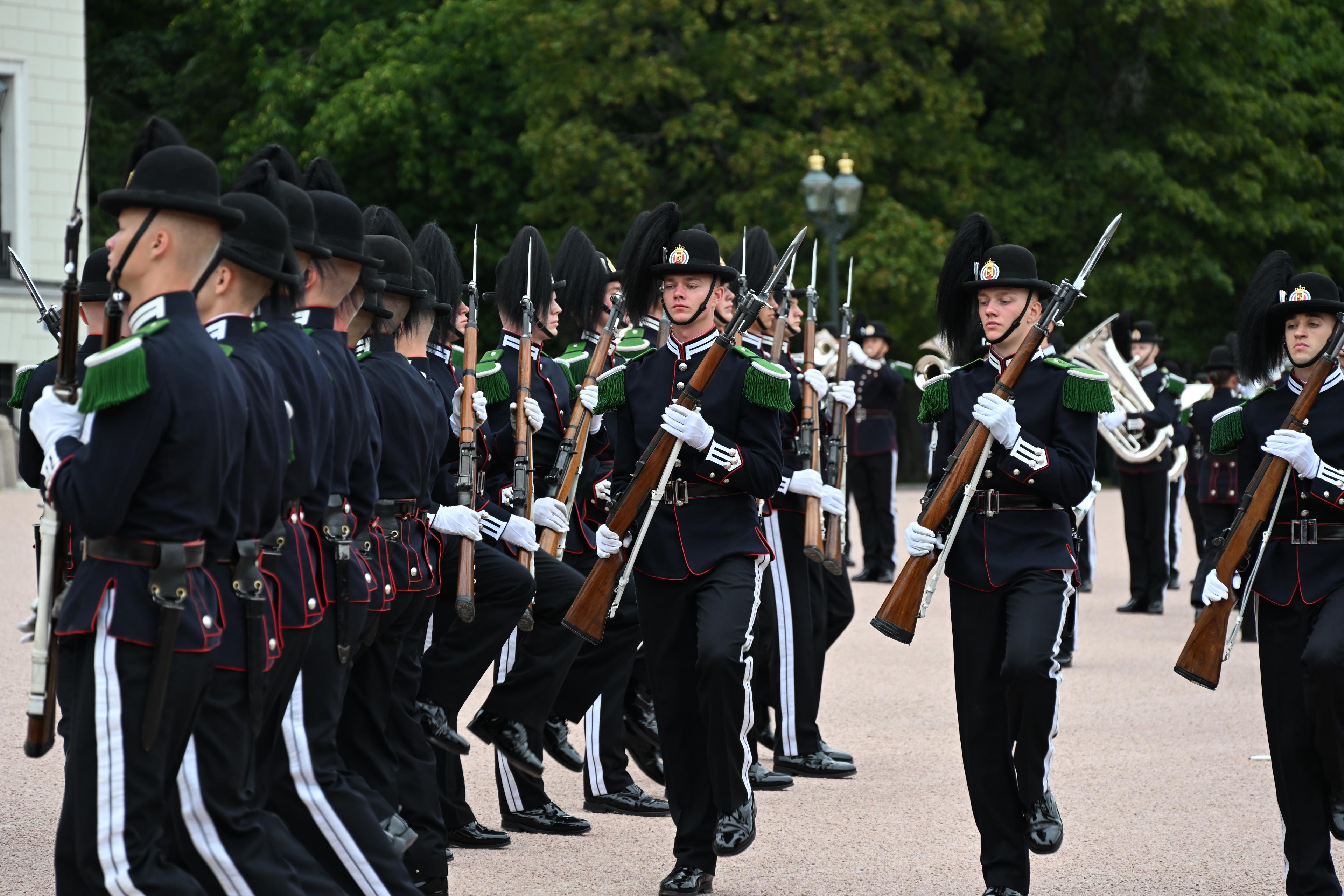 Hans Majestet Kongen og Den Høgvørde Kronprinsen overvar i ettermiddag drilloppvisninga til H.M. Kongens Garde på Slottsplassen.